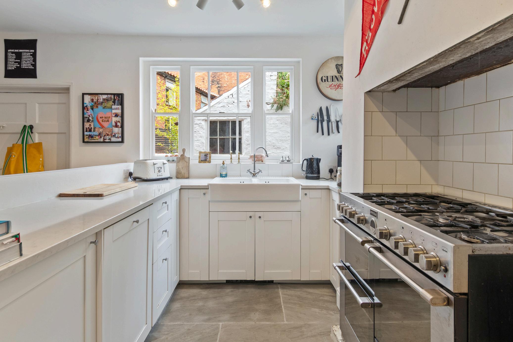 Divided into 2 distinct sections by a central, light quartz topped breakfast bar and painted ceiling beam this informal space includes oak flooring, a range of high and low white fronted units, a double ceramic sink unit, feature painted brick to one wall, tiled recess with Stoves 7 burner gas range and extractor, sash windows to the side and rear and 6 panelled side entrance door.