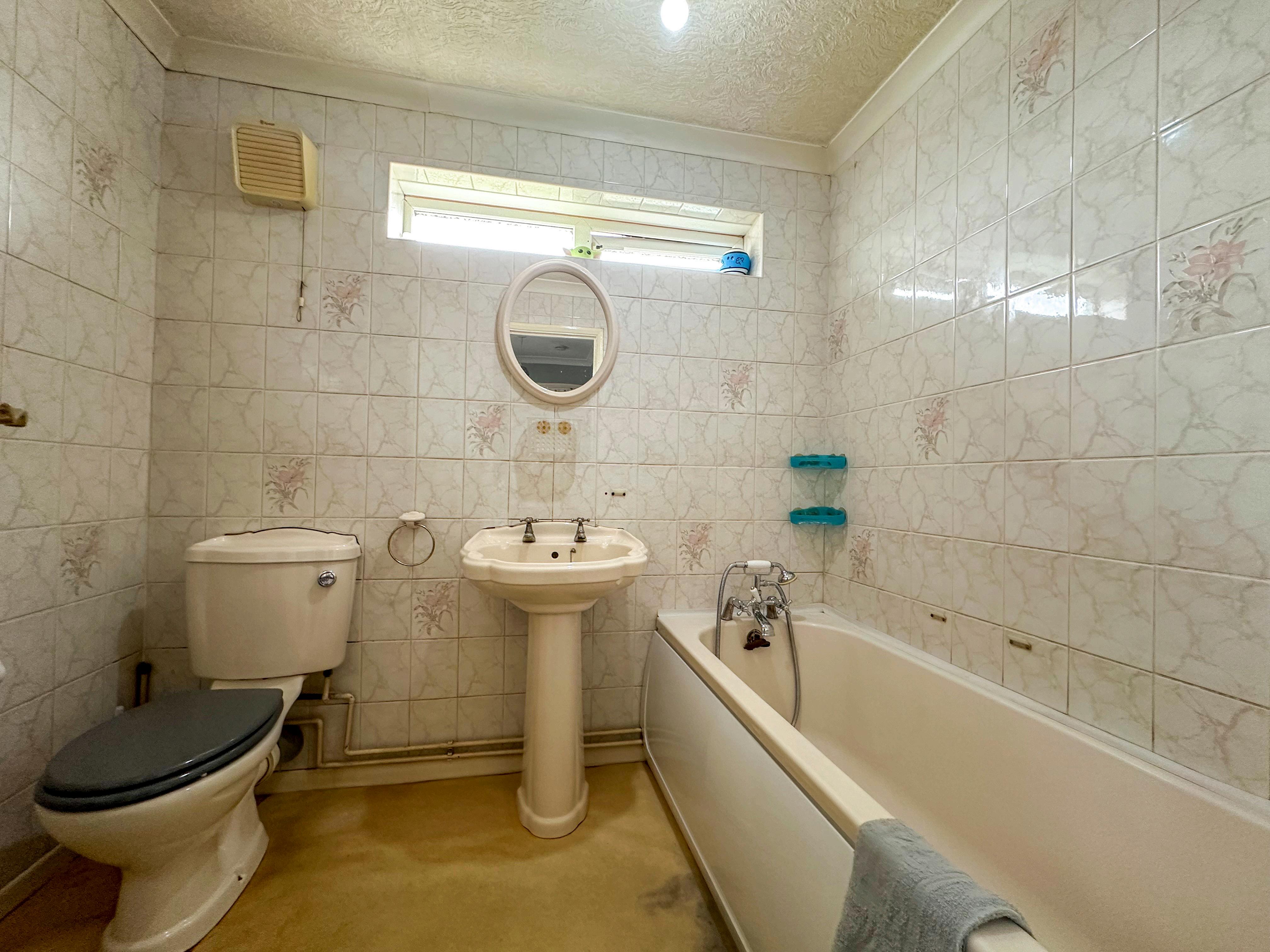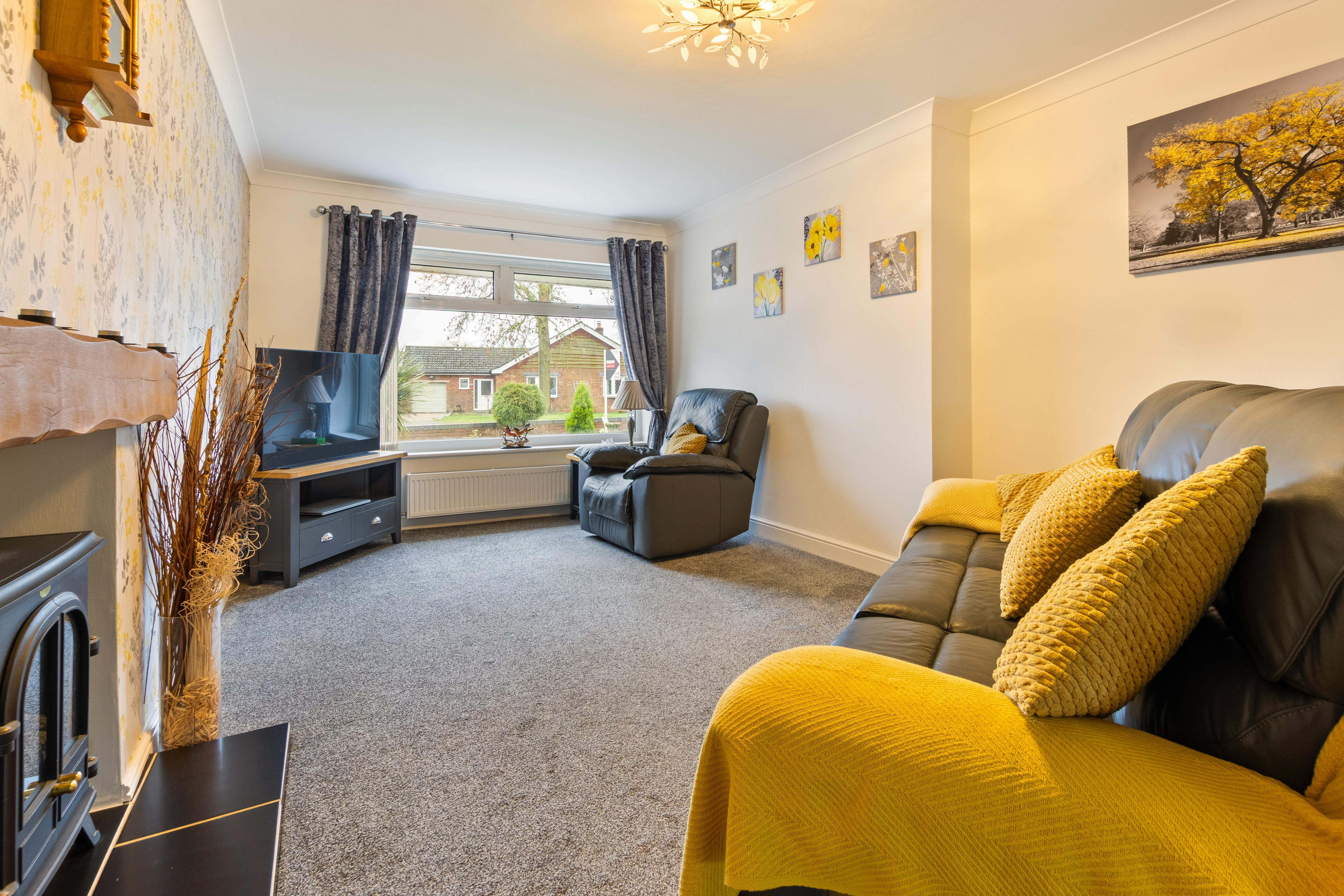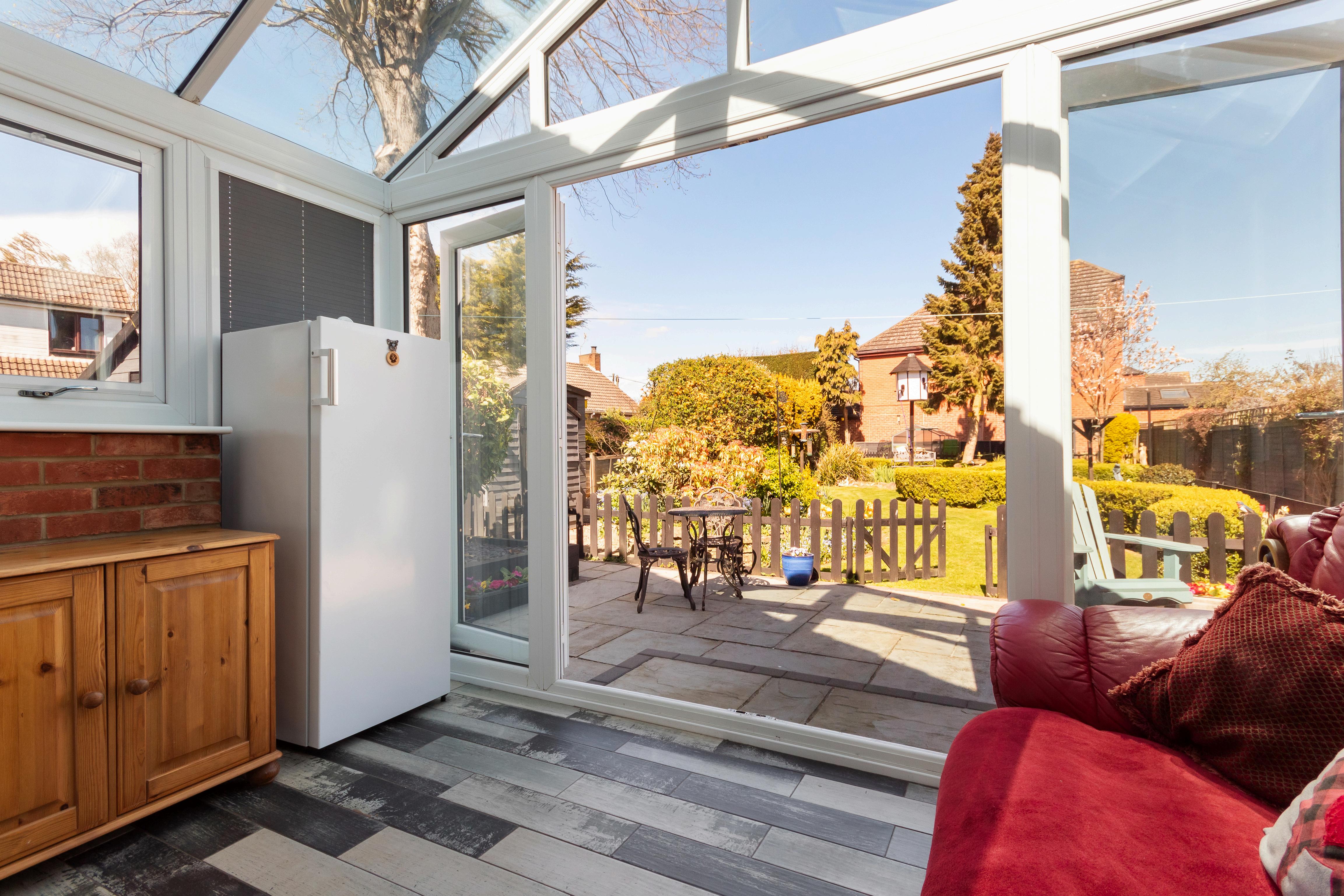 As you enter through the welcoming hallway, you’re met with a sense of space and light. The heart of the home is the spacious 20ft lounge/diner, complete with an elegant electric fireplace and natural flow into the modern kitchen, which features stylish units, integrated appliances, a central dining table, and French doors that lead into a bright conservatory with a glass roof. From here, peaceful garden views invite you to relax and unwind. The bungalow currently offers two good-size bedrooms, with the smaller third bedroom space currently being used as a study, making it ideal for home working or hobbies. The family bathroom is a real showpiece, boasting a freestanding clawfoot bath, a separate walk-in shower cubicle, a vanity hand wash basin and a low-level flush toilet, and sleek contemporary fittings that create a spa-like feel.