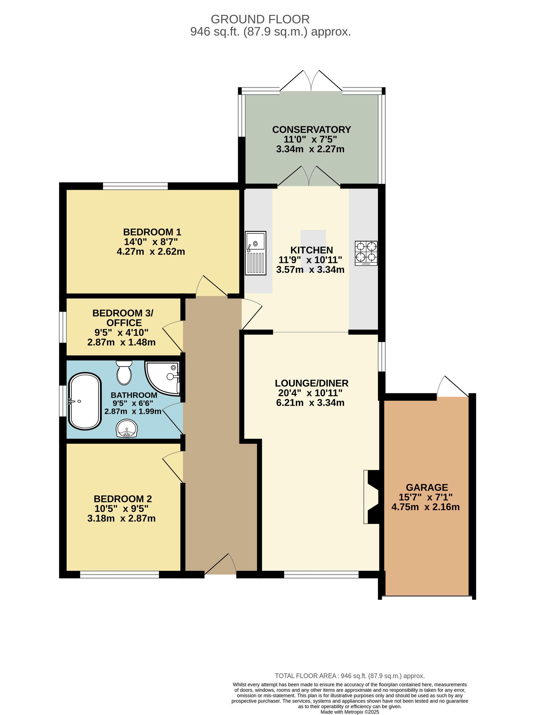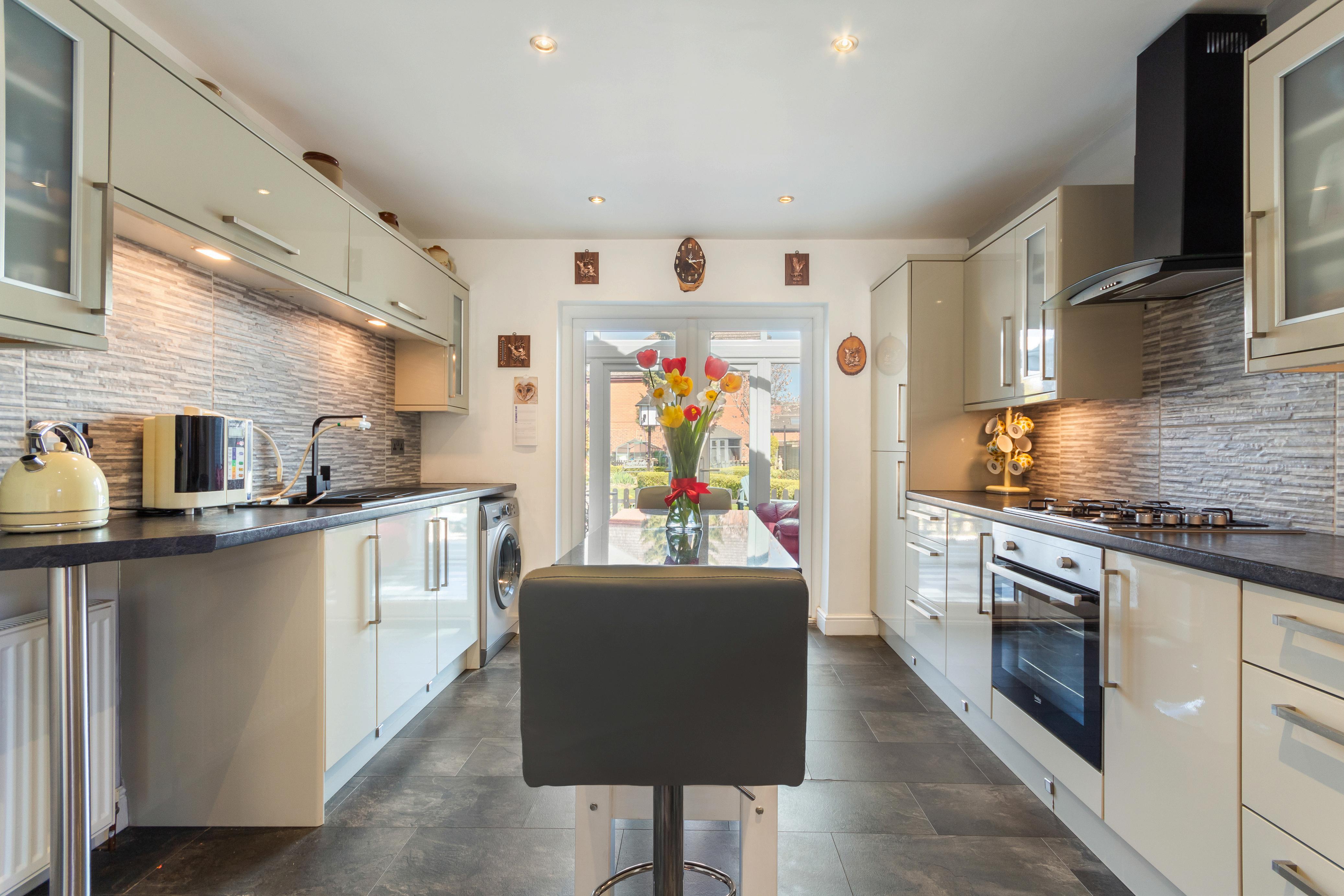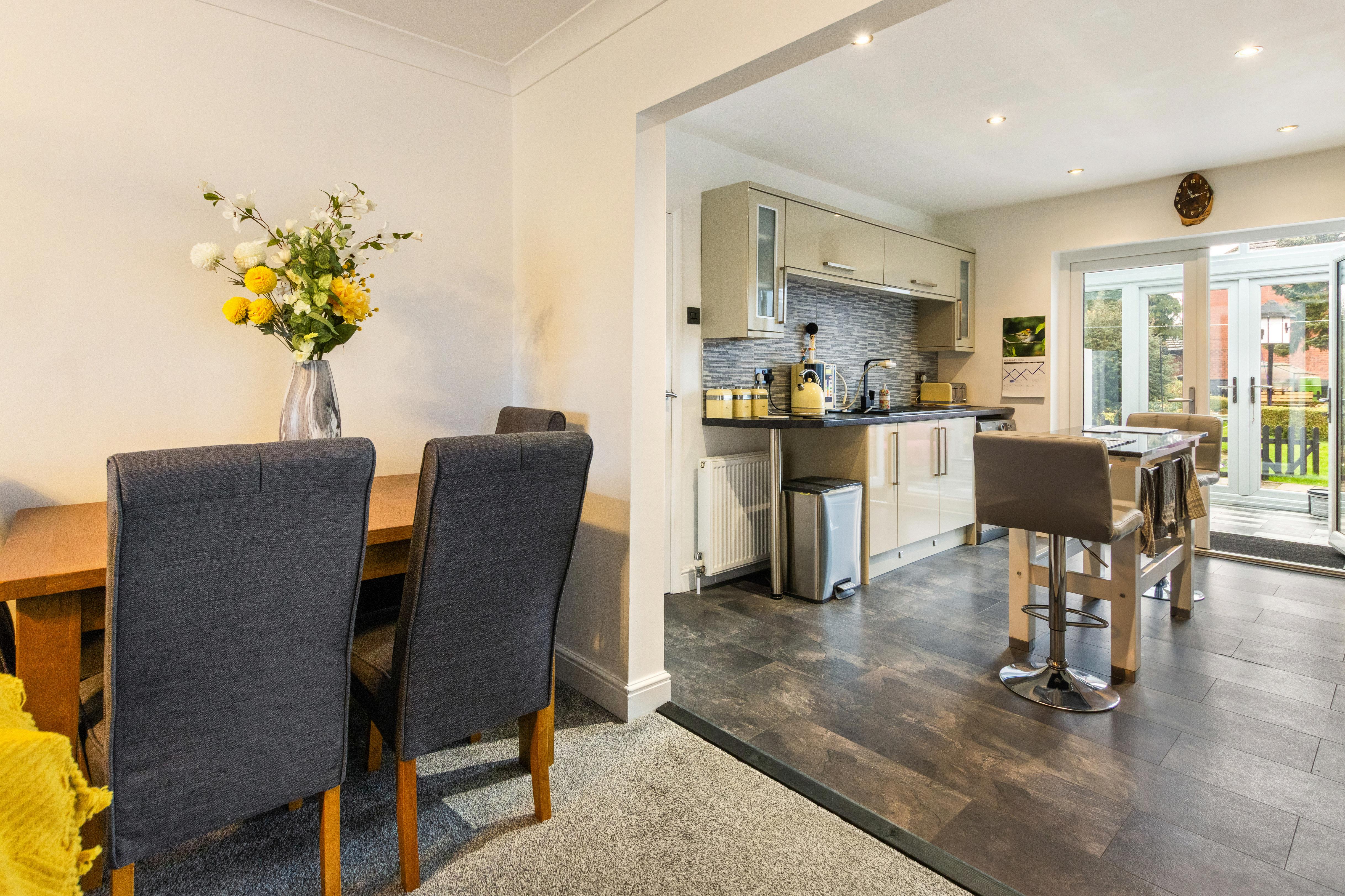 As you enter through the welcoming hallway, you’re met with a sense of space and light. The heart of the home is the spacious 20ft lounge/diner, complete with an elegant electric fireplace and natural flow into the modern kitchen, which features stylish units, integrated appliances, a central dining table, and French doors that lead into a bright conservatory with a glass roof. From here, peaceful garden views invite you to relax and unwind. The bungalow currently offers two good-size bedrooms, with the smaller third bedroom space currently being used as a study, making it ideal for home working or hobbies. The family bathroom is a real showpiece, boasting a freestanding clawfoot bath, a separate walk-in shower cubicle, a vanity hand wash basin and a low-level flush toilet, and sleek contemporary fittings that create a spa-like feel.