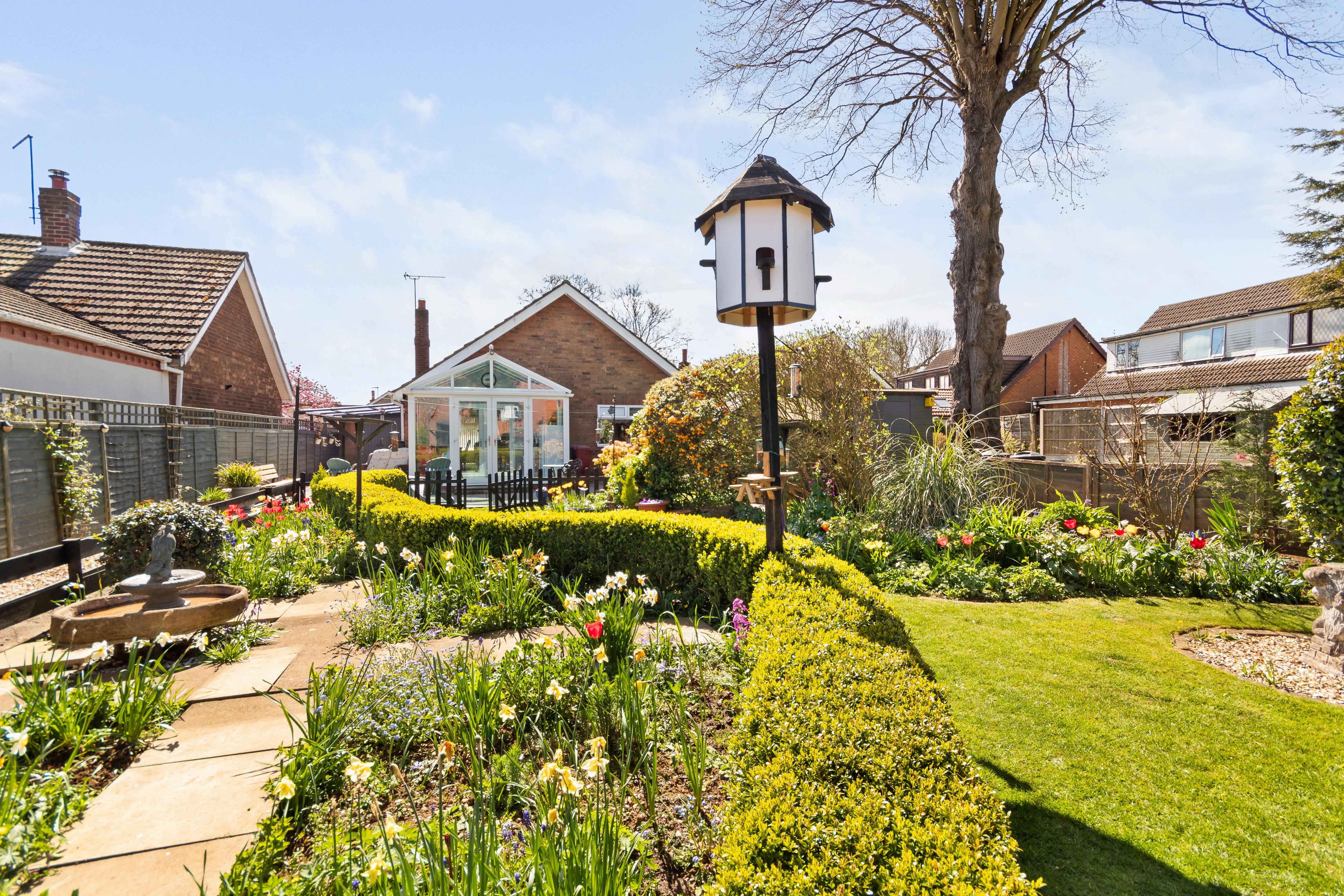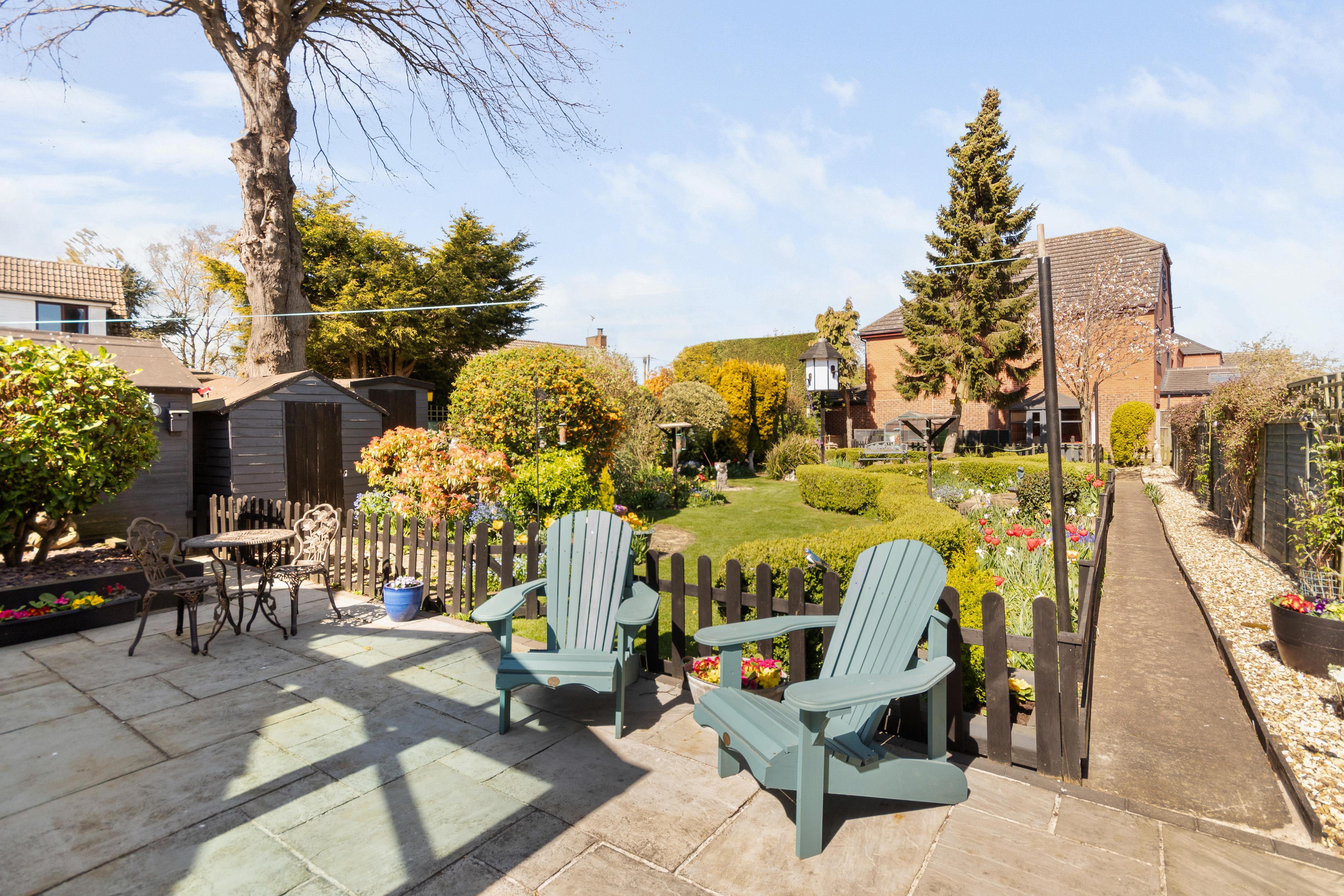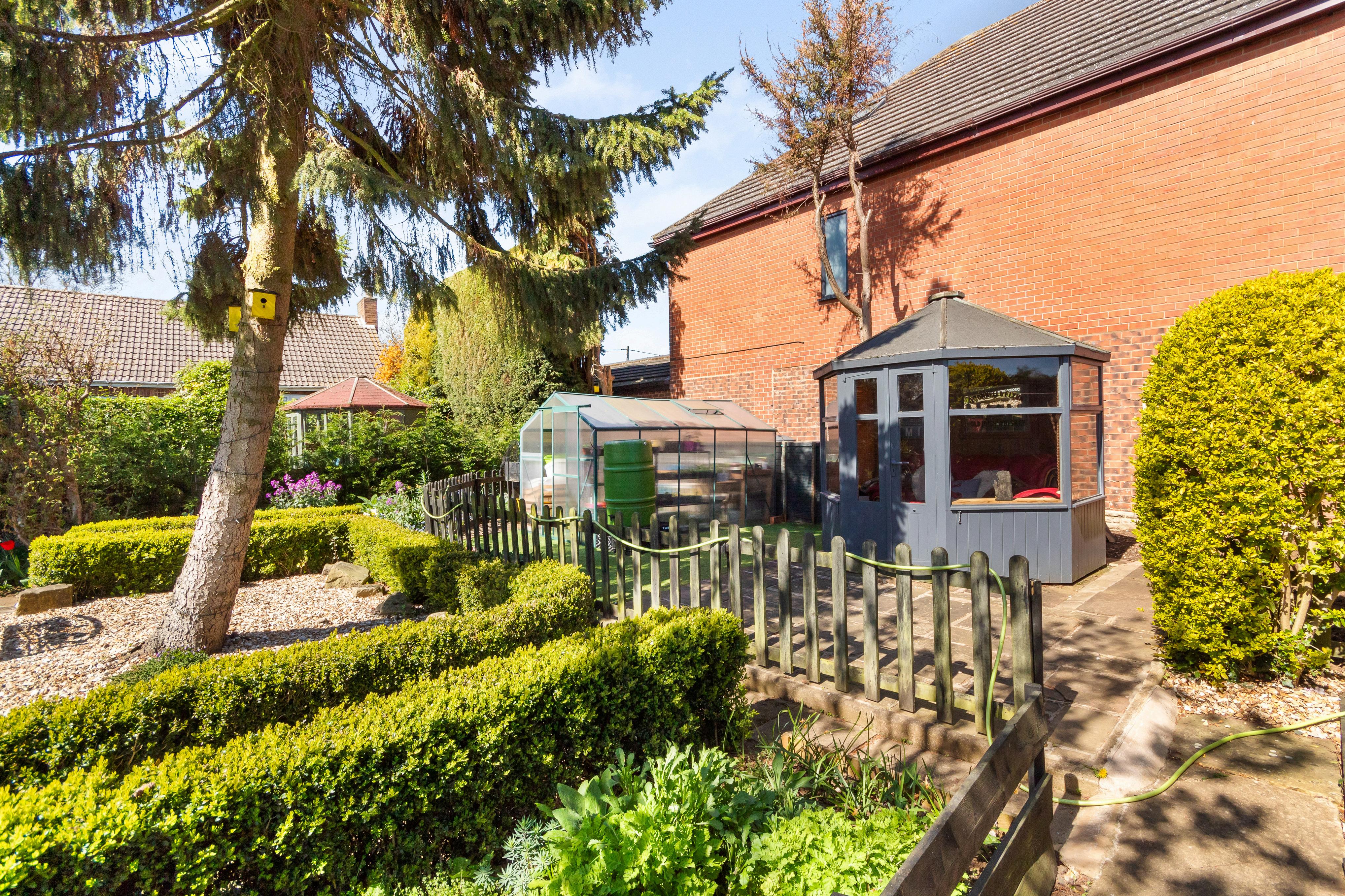 Double five-bar gates open to a gravel driveway with ample off-street parking, flanked by a neatly lawned, south-facing front garden lined with mature trees and shrubs. A garage with electric roller door, carport, and side access offer both practicality and potential. The rear garden is a real sanctuary generous in size and immaculately maintained, it features sweeping lawns, colourful planting, a pond, summer house, and greenhouse. A block-paved seating area provides the perfect spot for dining or enjoying the sunshine. With enough outdoor space to accommodate a home office, small annexe, or future extension (subject to planning), this garden is not only beautiful but incredibly versatile.