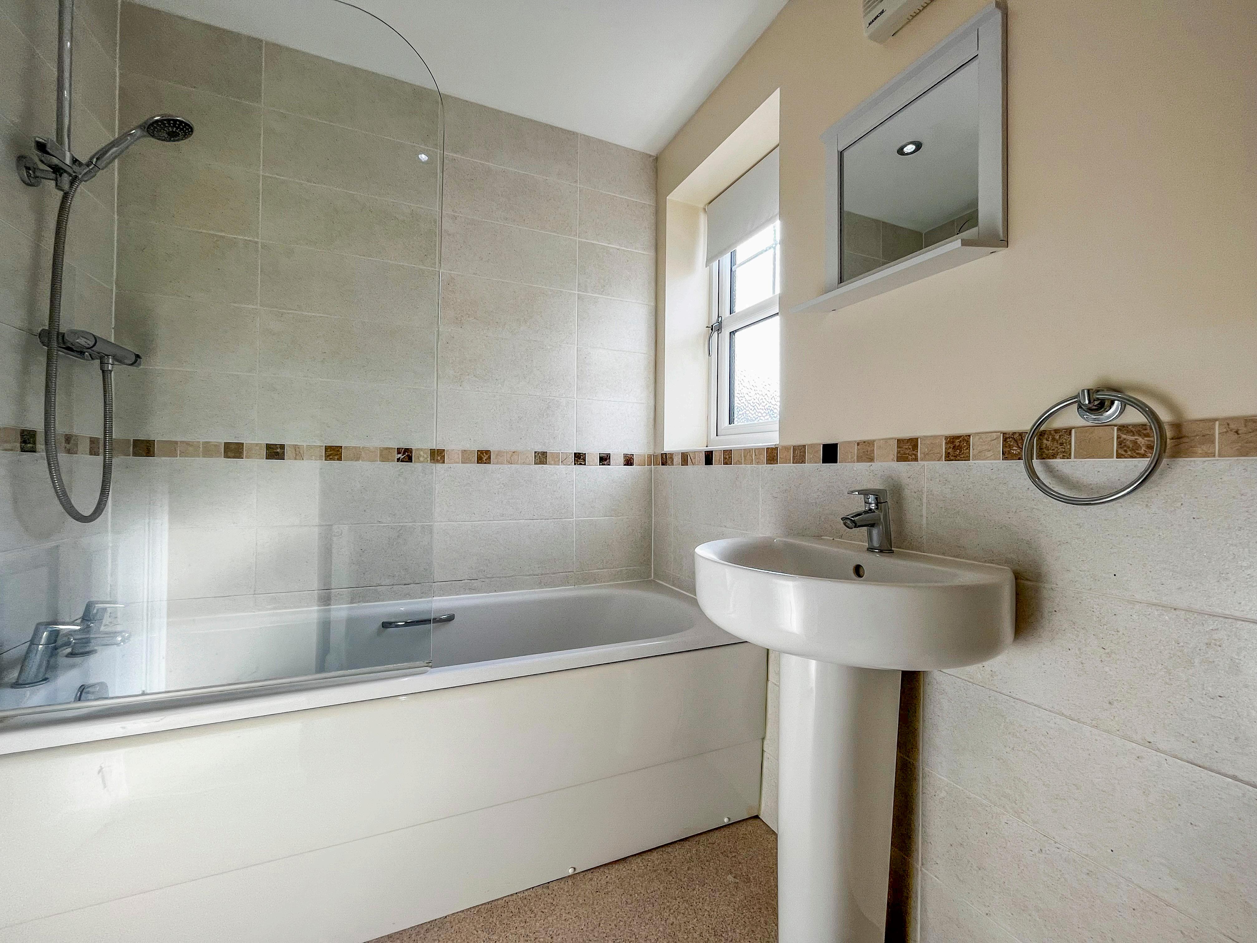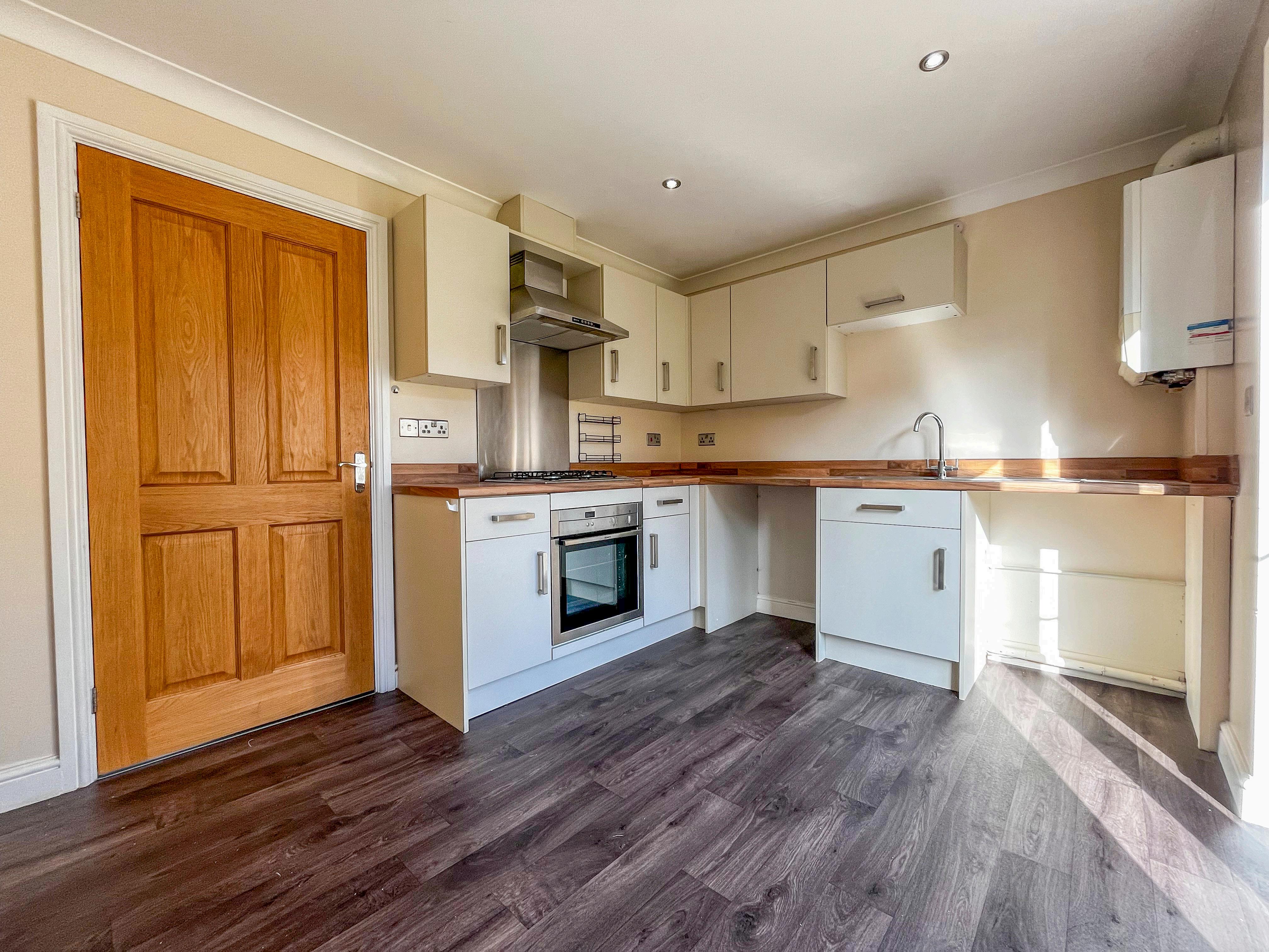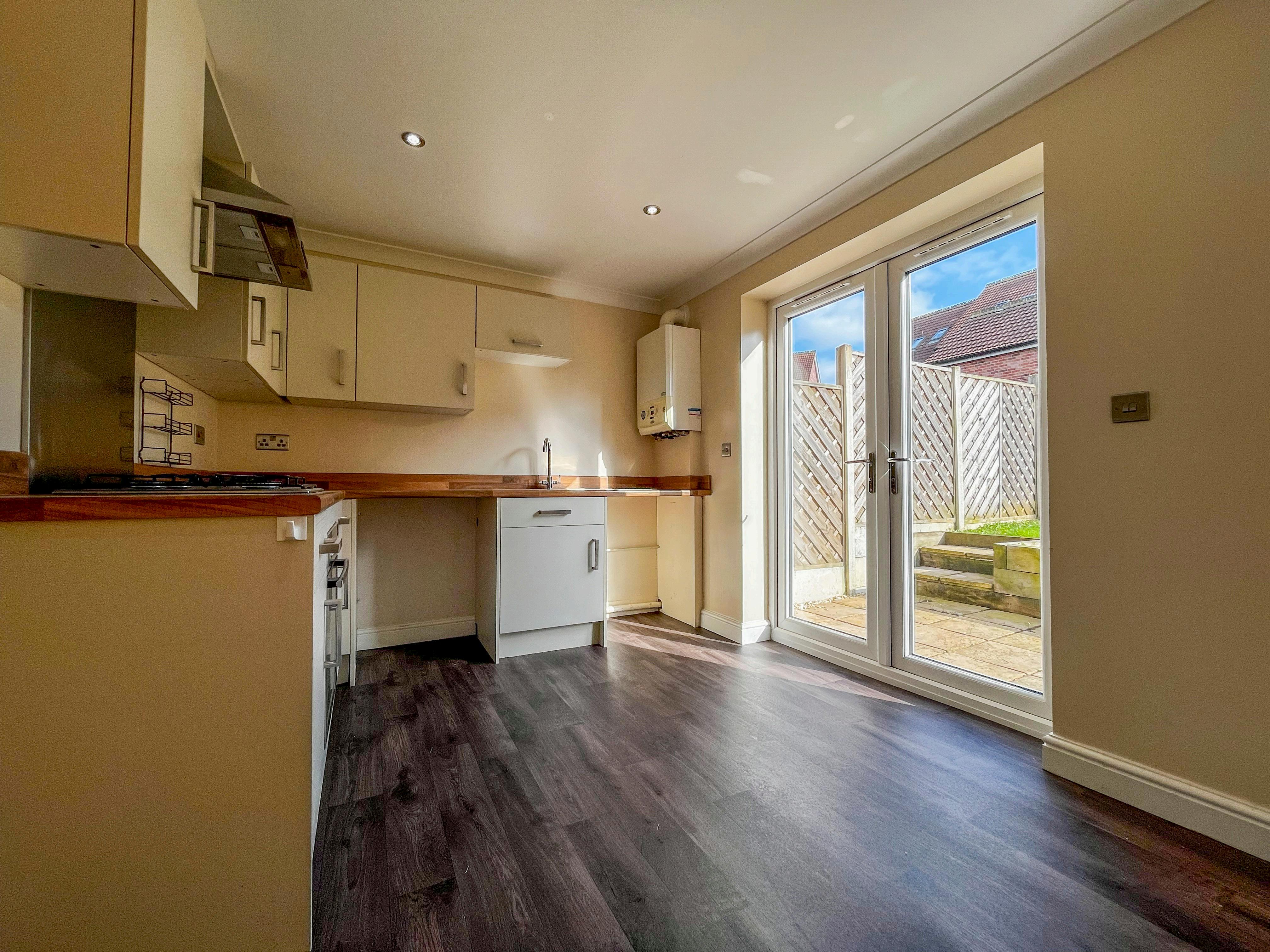 As you step inside, you are greeted with a welcoming entrance hallway that leads into the modern fitted kitchen that benefits from a stainless-steel sink, built-in oven and hob with an extractor fan, space for white goods and French doors leading to the garden. Off the hall is a generous living room to the front elevation with stairs to the first floor and, and a handy downstairs cloakroom with a hand wash basin and W.C completes the ground floor. The first floor offers a front facing double bedroom, and a rear aspect double bedroom. Both bedrooms are served by the partially tiled three-piece family bathroom that has a bath that is complimented with a shower above, a hand wash basin and a W.C.