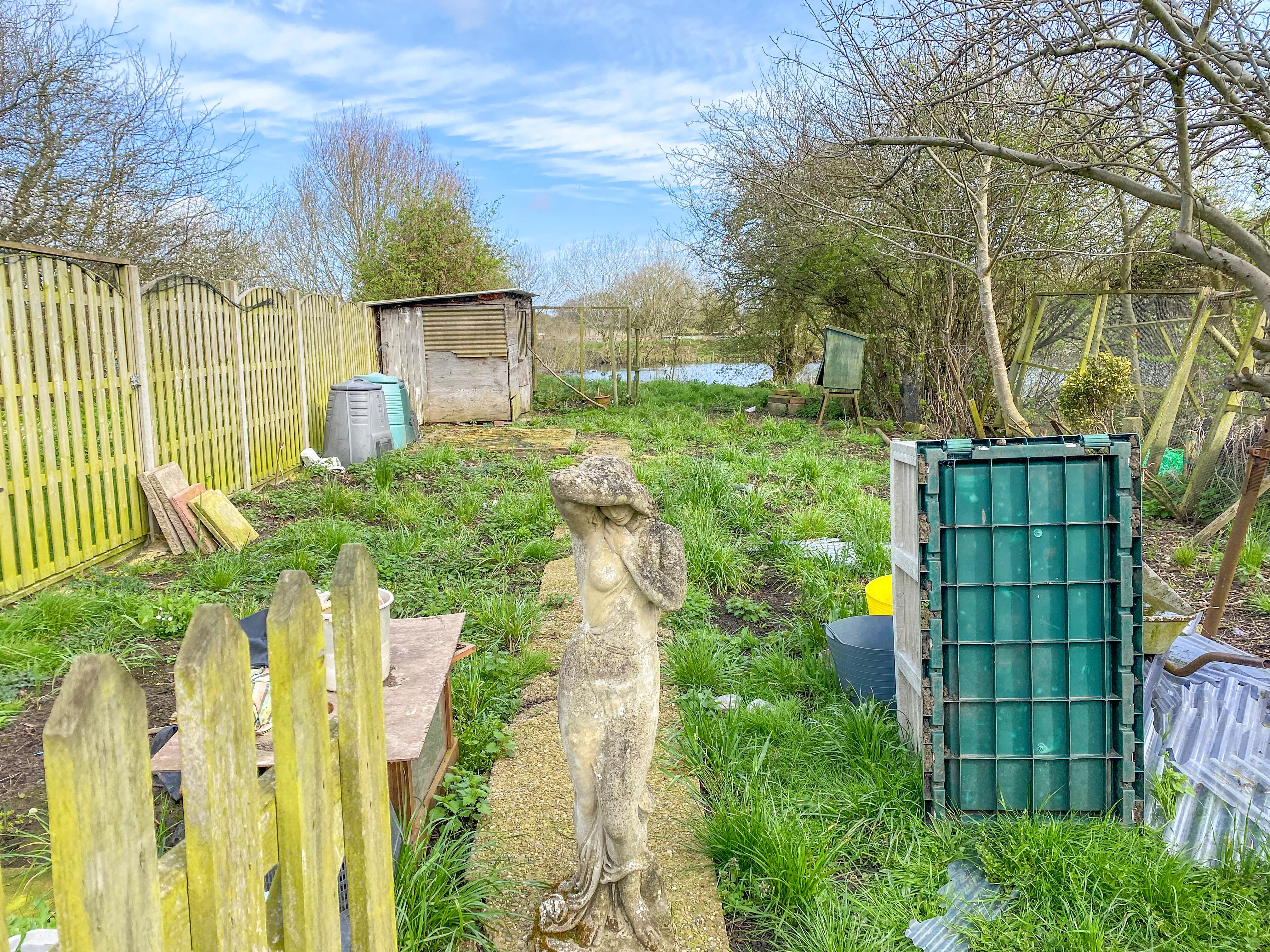 Outside, the rear of the property presents a delightful patio area, complemented by several storage sheds, while the enclosed garden, predominantly laid to lawn, gently slopes towards the nearby duck pond, offering serene views and a tranquil setting.