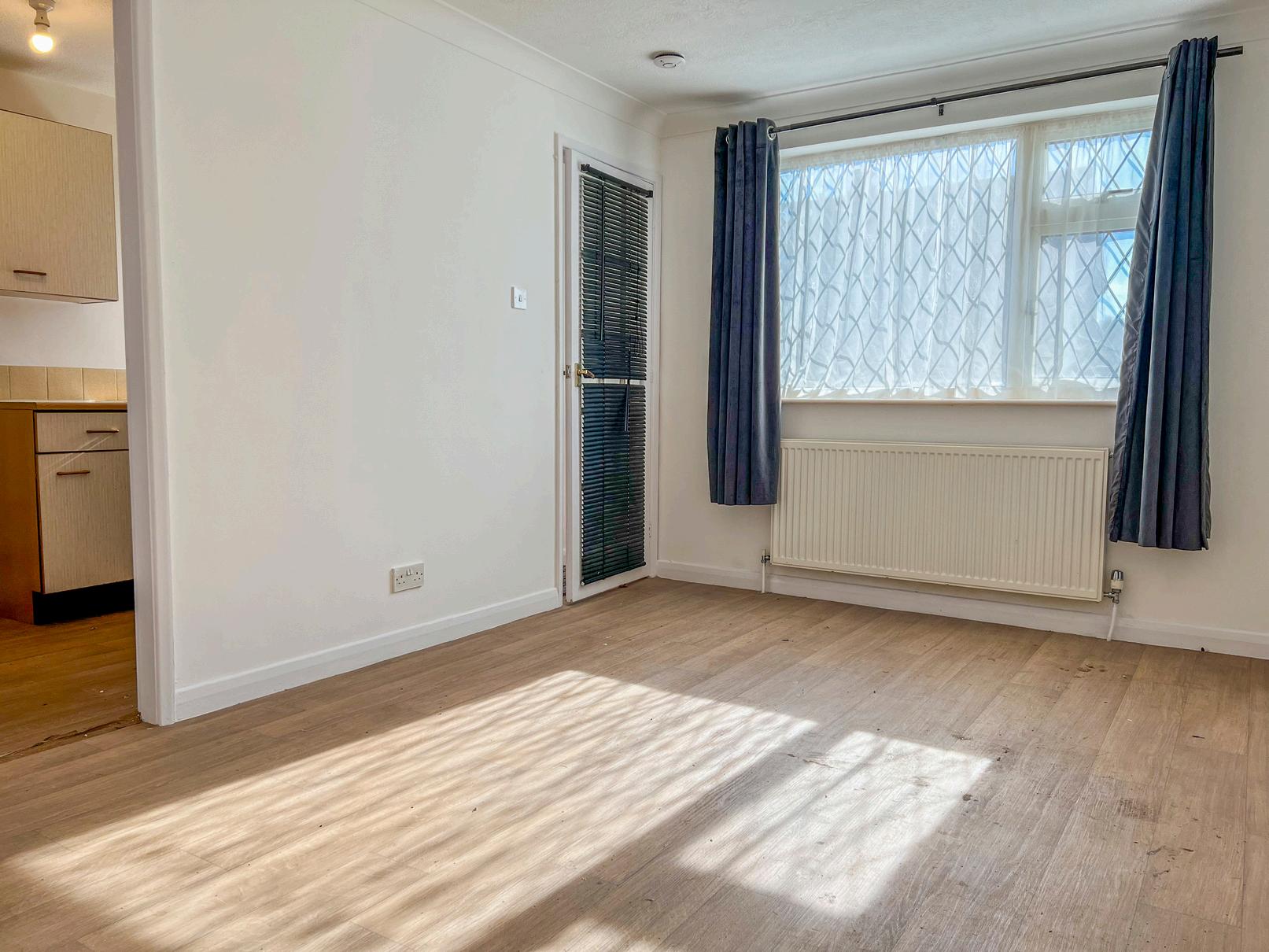 Upon entering, a welcoming porch leads into the lounge, which enjoys a pleasant outlook over the green area. The kitchen, conveniently situated off the lounge, provides a functional space for cooking. An inner hall with built-in storage leads to the bathroom and a double bedroom, which features sliding doors opening onto the paved, low-maintenance rear garden—a perfect spot to relax outdoors.