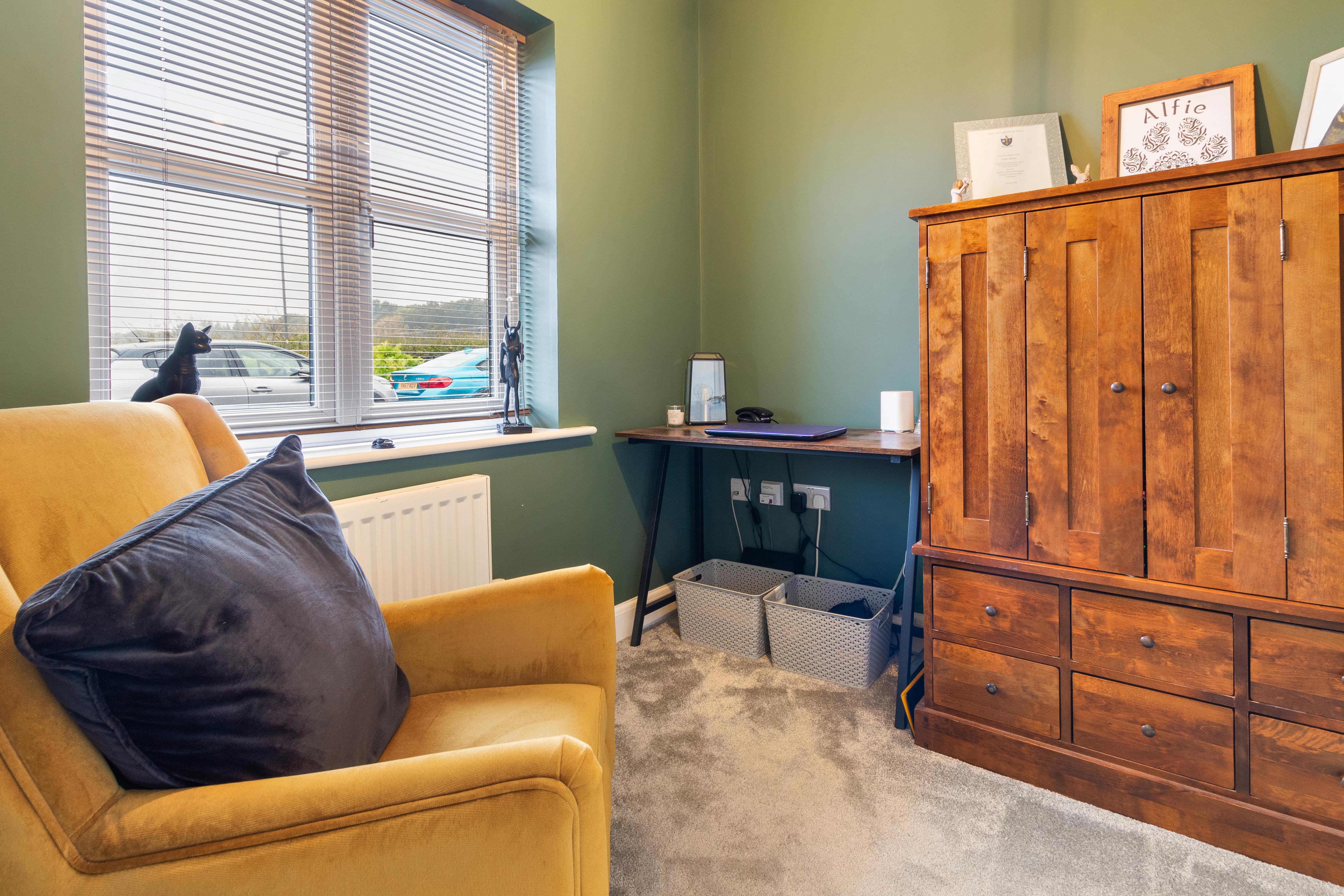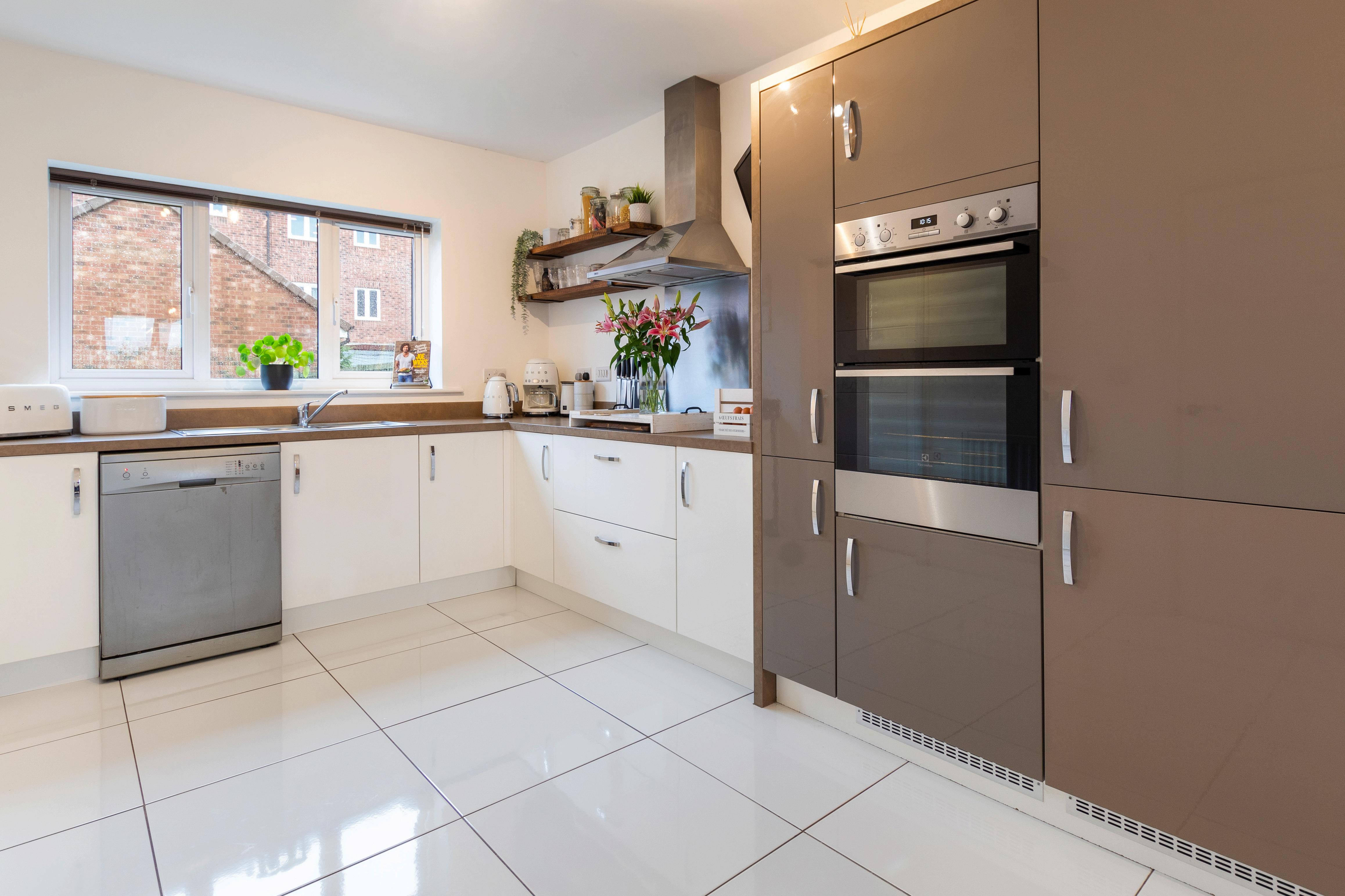 As you step inside, you're greeted by a bright and welcoming entrance hallway with a sleek tiled floor that flows throughout the ground floor. The lounge, complete with a feature panelled wall and French doors, opens directly onto the rear garden, creating the perfect space for family gatherings and relaxation. The open-plan kitchen diner, designed with modern gloss units and integrated appliances including a double oven and fridge freezer, offers ample space for dining and entertaining. The adjoining utility room provides additional space for white goods and convenient rear access. Completing the ground floor is a versatile home office or snug and a handy WC.