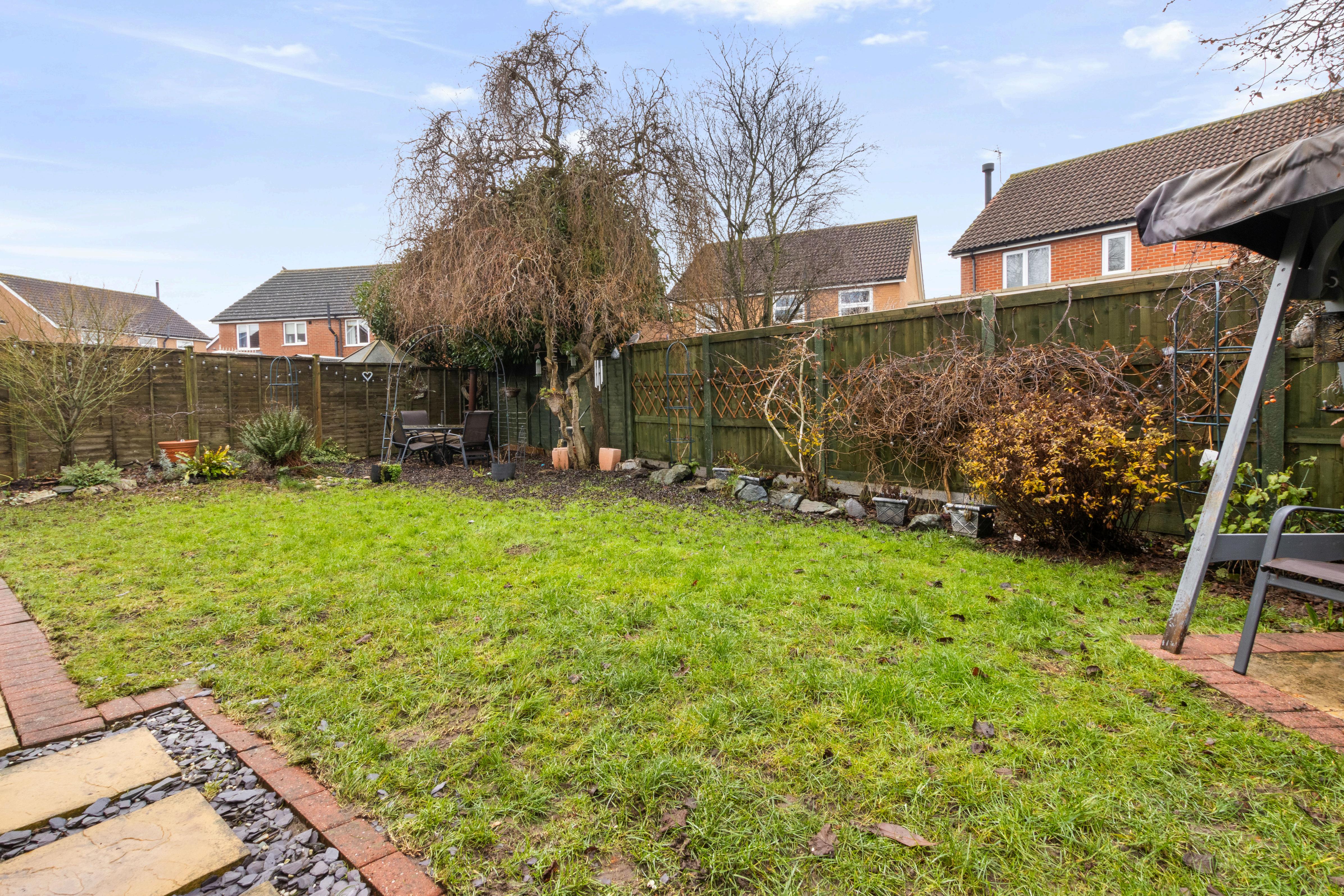 The rear garden is fully enclosed, providing a safe and private outdoor space for children, pets and summer gatherings. With a mix of lawn and patio, it’s a versatile area that can be enjoyed year round. To the front, a smart block paved driveway offers excellent off street parking, enhancing the home’s kerb appeal and convenience.