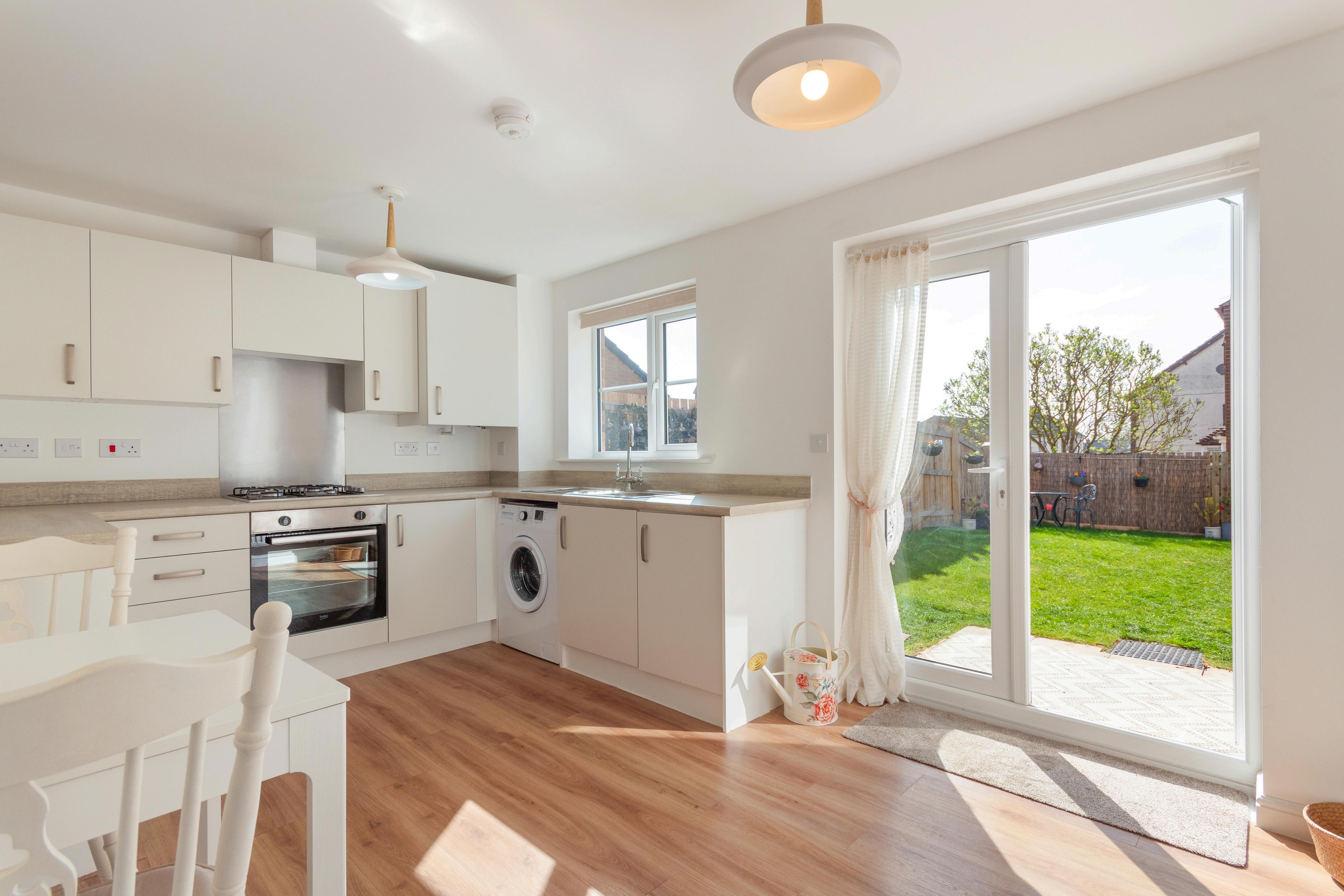 Upon entering, you are welcomed into a practical entrance porch which leads to a downstairs cloakroom, complete with low-level W.C. and wash basin ideal for guests and everyday convenience. The spacious lounge features a cosy ambiance with a focal fireplace and leads through to the heart of the home: a bright and airy kitchen/diner. This sociable space is fitted with a range of sleek base and wall units, integrated stainless steel oven, hob and extractor, and offers room for additional freestanding appliances. French doors open directly onto the rear garden, creating an ideal flow for indoor-outdoor living and entertaining.