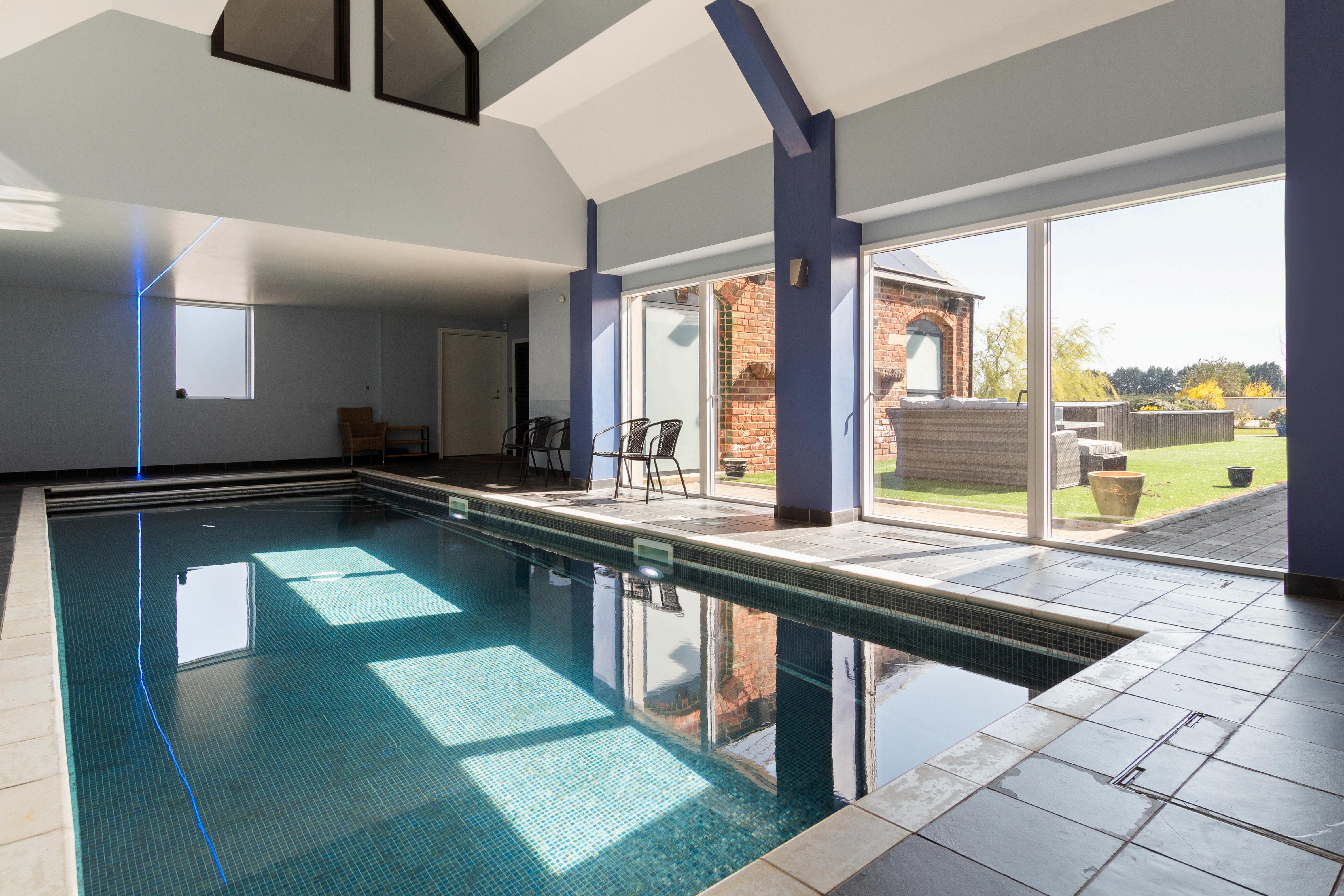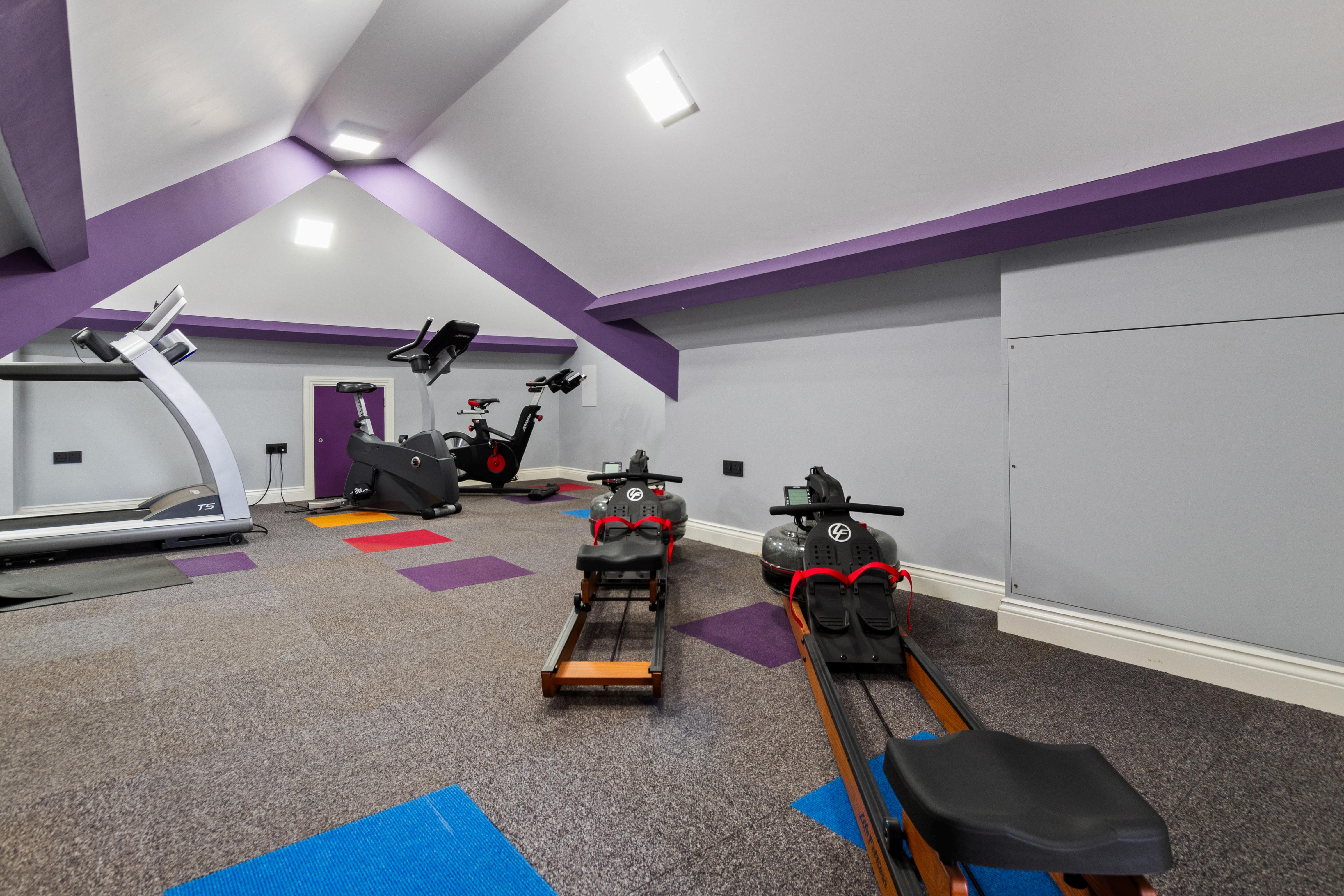 A luxurious 10-metre fully tiled and heated indoor swimming pool forms the centrepiece of the property’s impressive leisure complex. This beautifully designed space also includes separate steam and sauna rooms, multiple changing and shower facilities, a WC, and the added benefit of large patio doors opening directly onto the garden— blending indoor wellness with outdoor relaxation. On the first floor, a dedicated gymnasium overlooks the pool through an internal window, creating a bright and motivating workout environment.