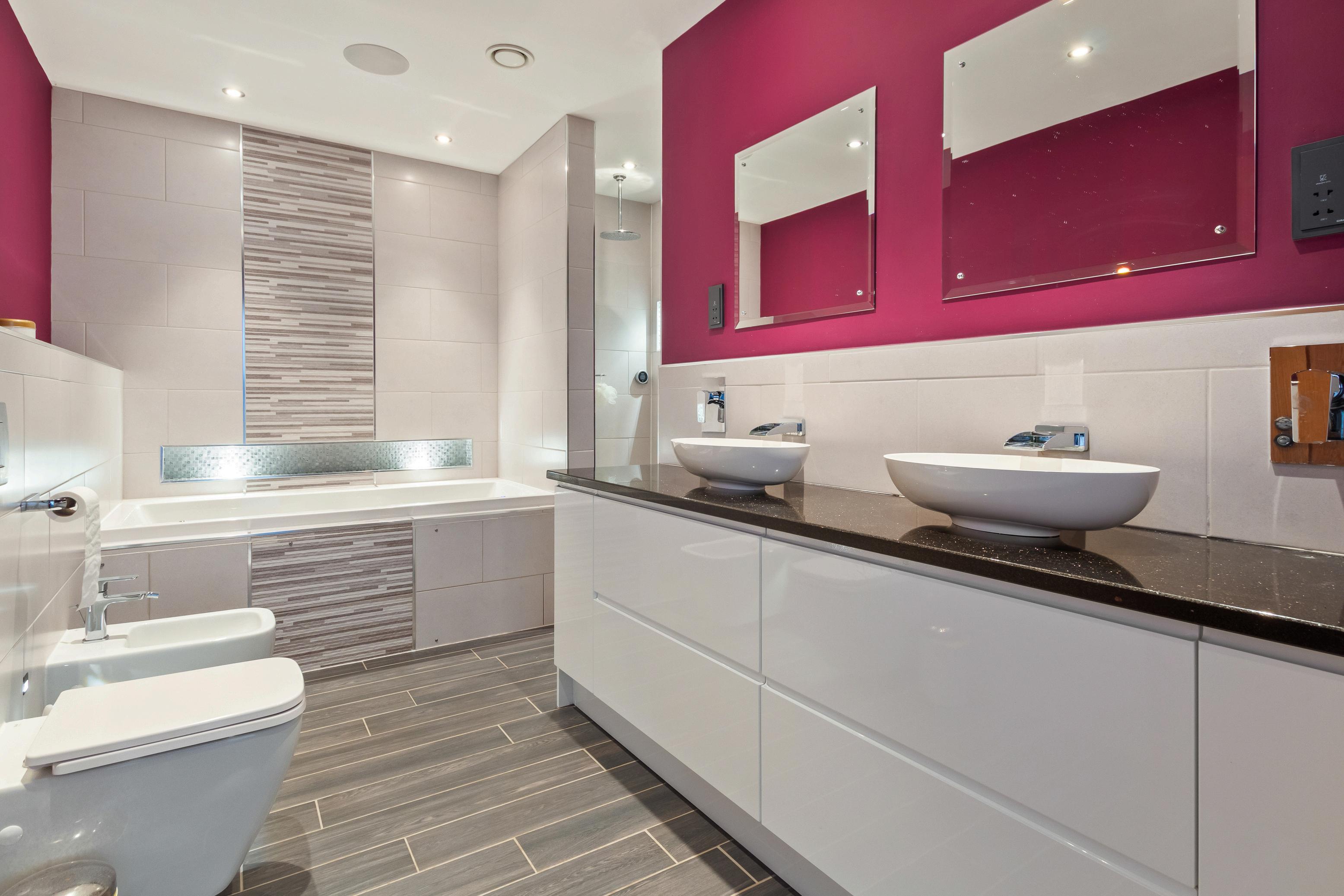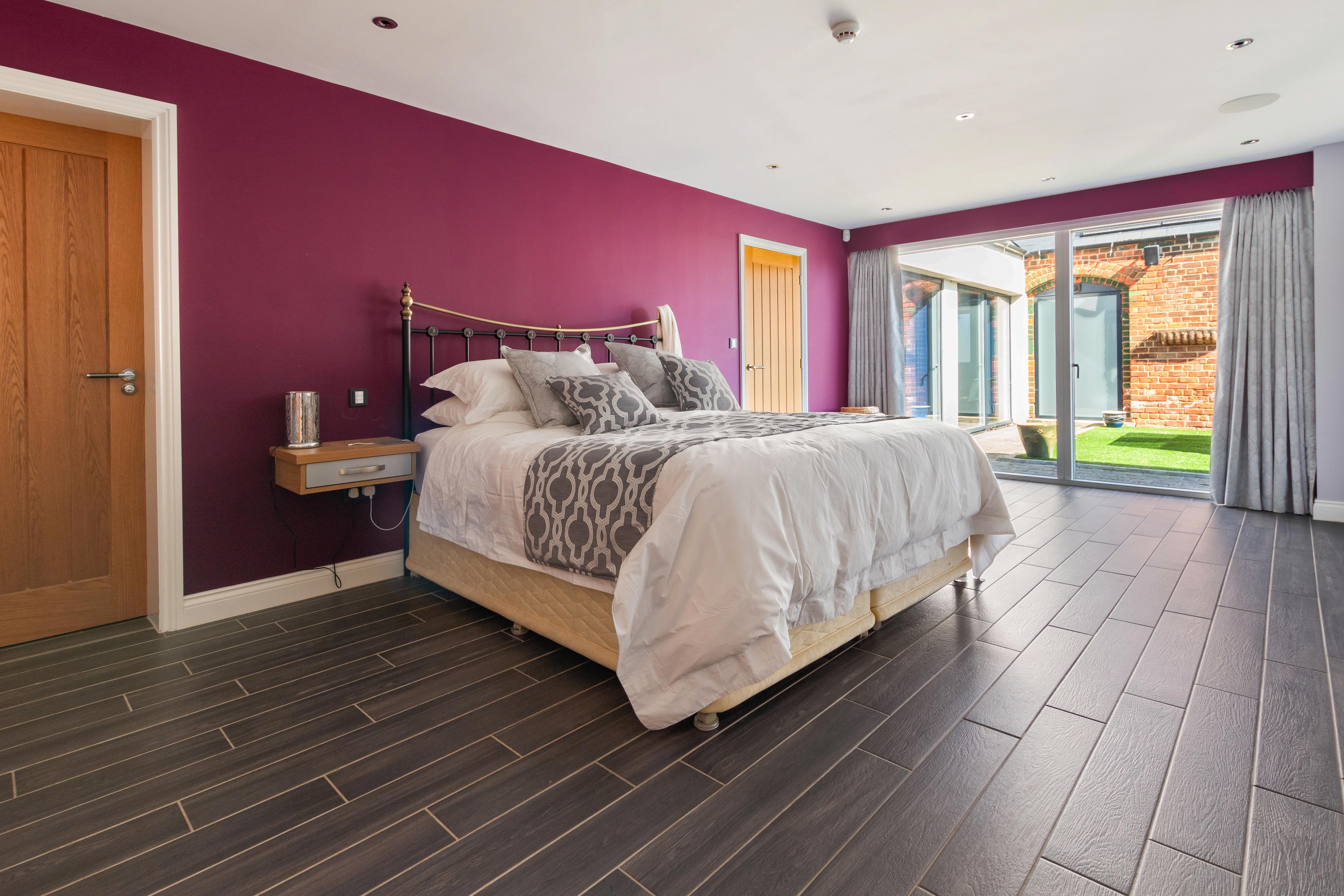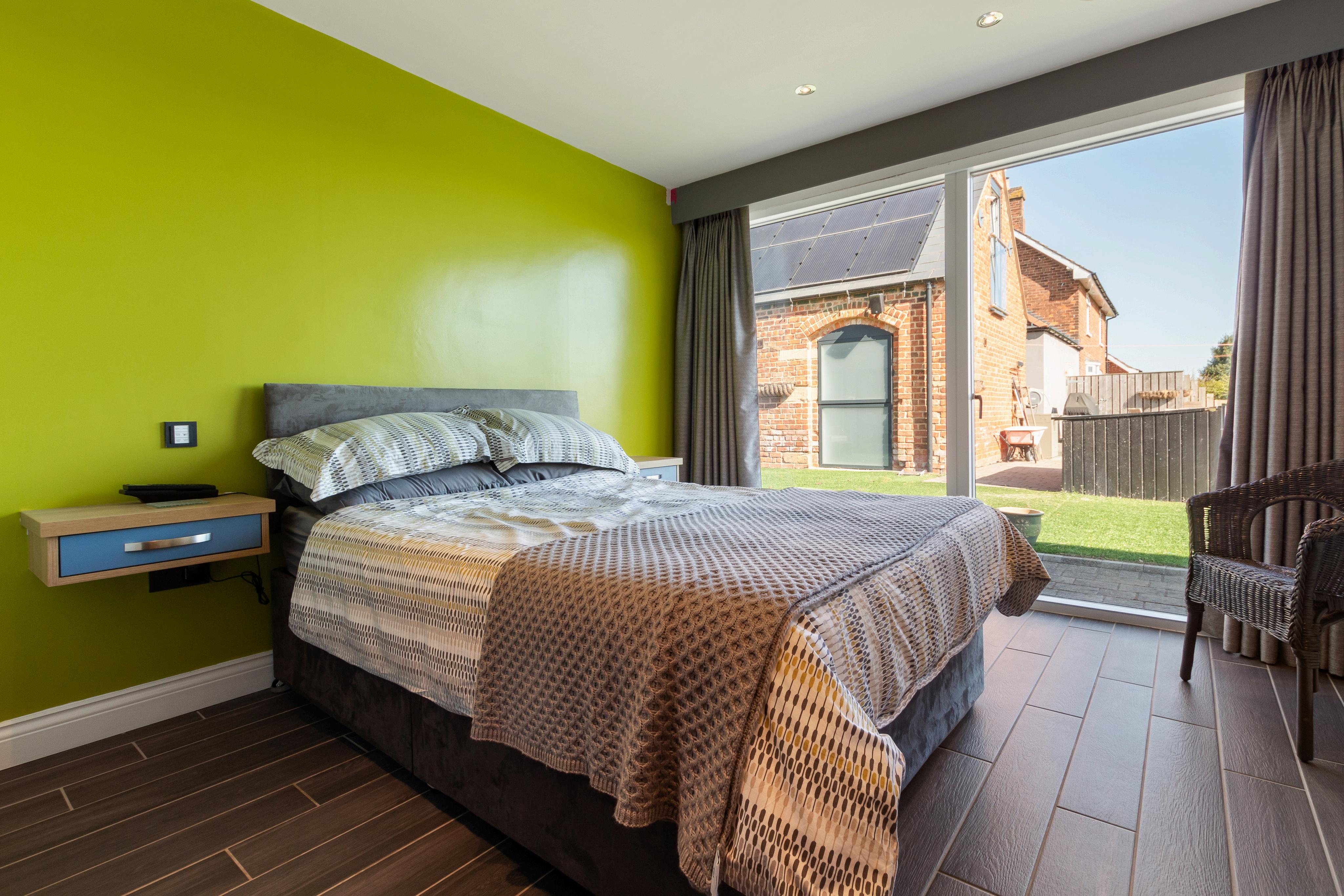 Beyond the kitchen living space, a walkway leads to the bedroom wing where electrically operated roof windows provide ample natural daylight, this space is generously proportioned to allow for additional seating or even for use as an informal office space. There are three well appointed ground floor bedrooms accessed from this space, two of which feature broad patio doors opening to the gardens, along with stylish en-suite shower rooms complete with walk-in showers, subtle lighting, and high-quality fittings. The principal suite echoes this sense of space and luxury, also enjoying garden access via matching patio doors, and includes a walk-in wardrobe along with a generously proportioned indulgent en-suite befitting the principal bedroom which includes a luxurious double-ended spa bath, and a large walk-in wet room shower, and twin sinks.