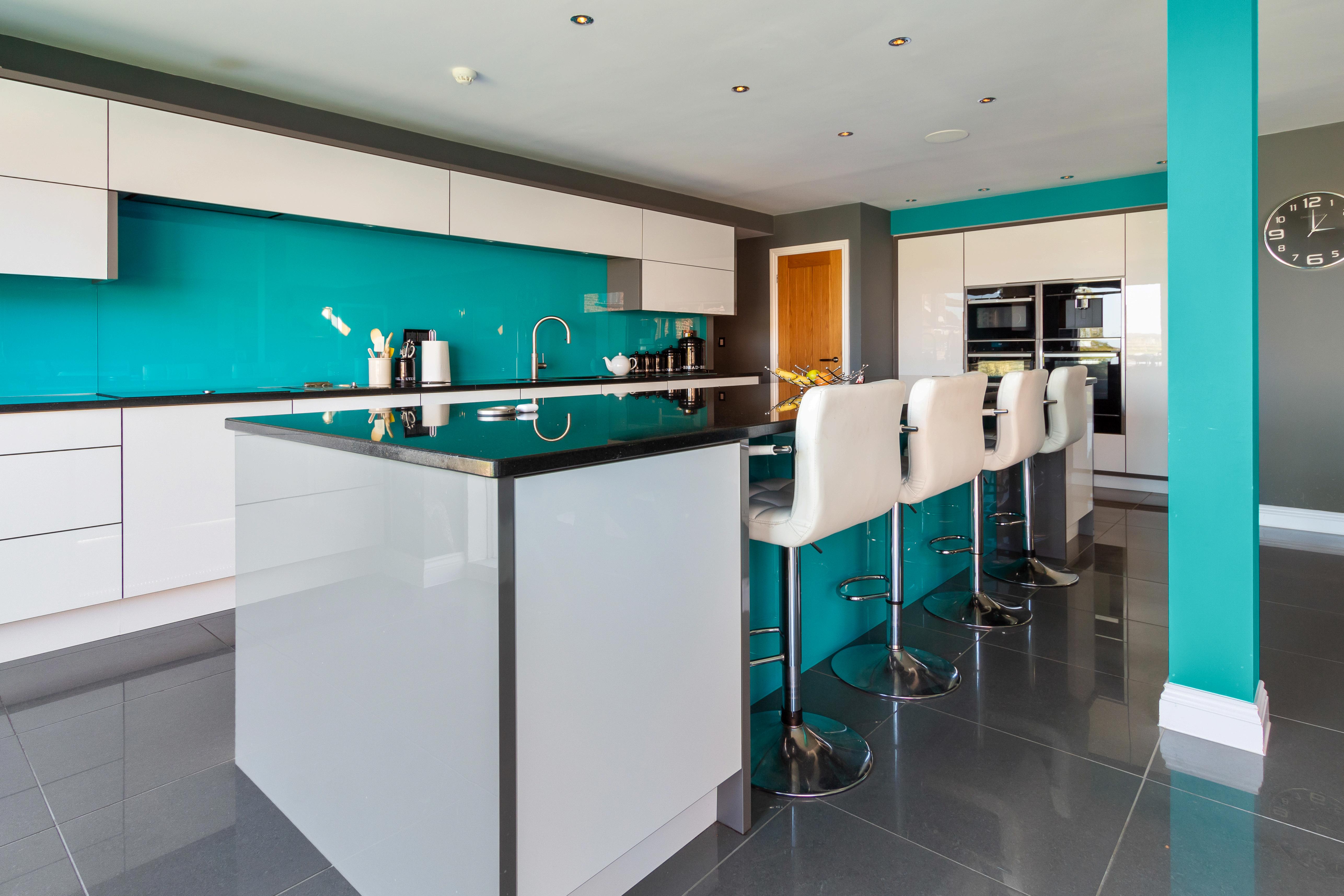A door from the hall leads through to the impressive open-plan kitchen—An expansive and light-filled space designed for modern living, beautifully fitted with a range of high-gloss cabinetry, topped with granite working surfaces, and includes a range of premium integrated appliances, including a built-in coffee machine. A substantial centre island provides a generous preparation space incorporating a breakfast bar, and creates a divide between the kitchen and dining space maintaining the seamless flow of the open-plan design.