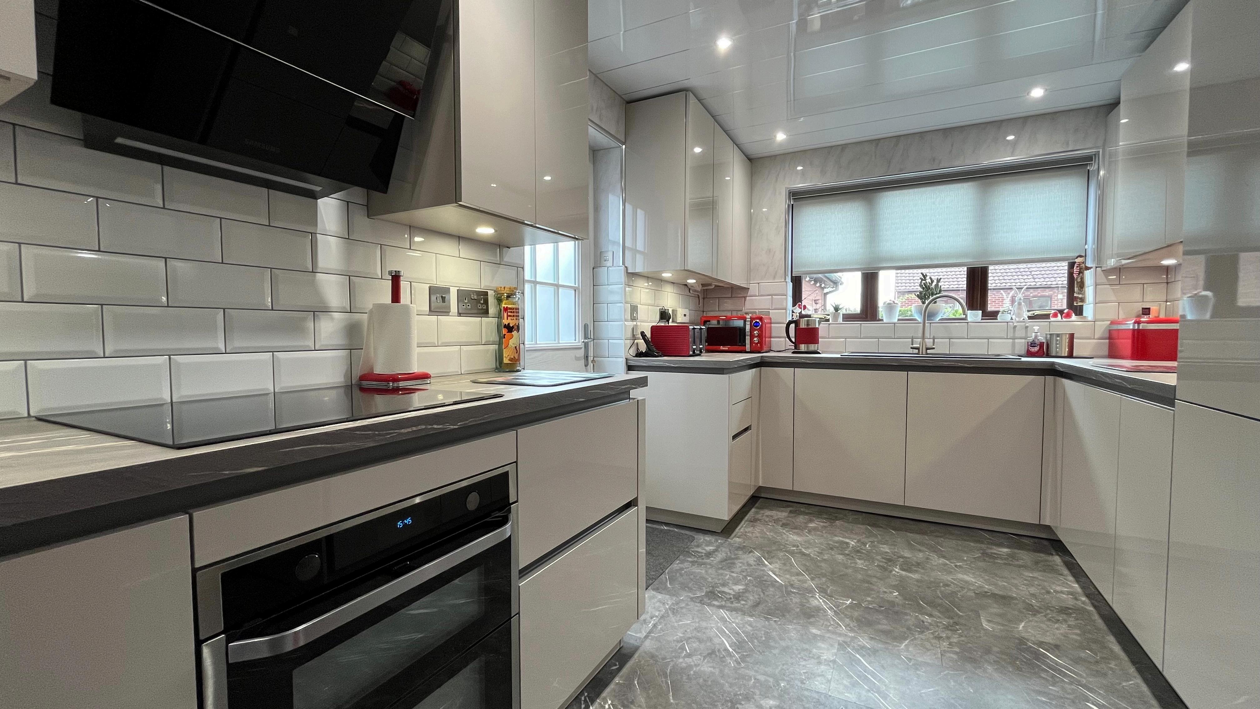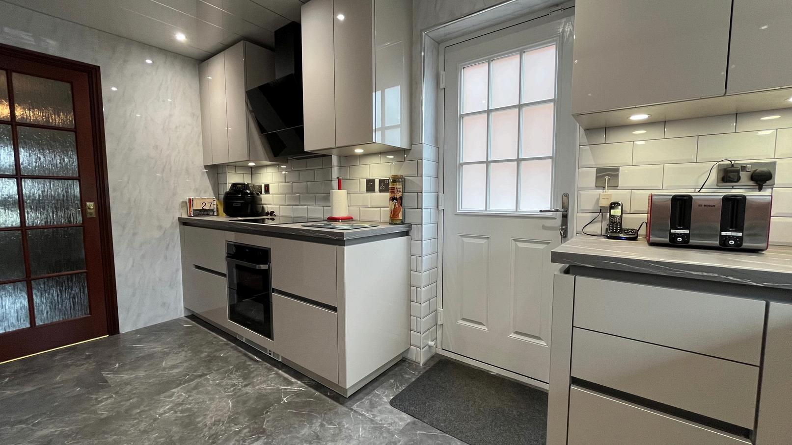 The sleek, modern kitchen is a chef's delight, fitted with stylish gloss units and integrated appliances, including an oven, induction hob, extractor fan, fridge, and freezer. With ample unit storage and generous worktop space, it’s designed for those who love to cook. A convenient side exit door from the kitchen provides easy access to the driveway, making daily tasks more manageable. A handy W.C. completes the ground floor, adding to the home’s practicality.