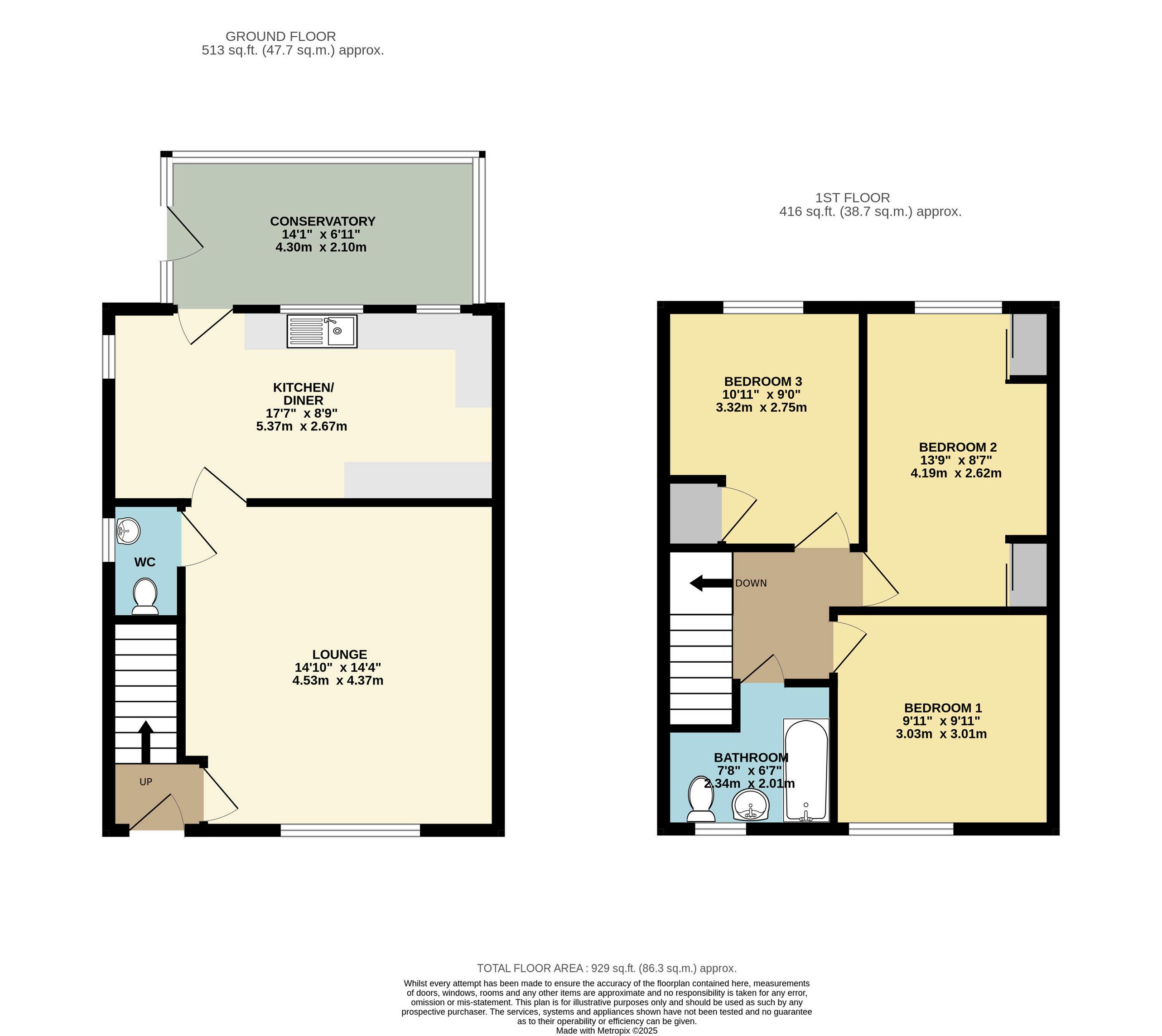 As you step inside, you’re welcomed into the front entrance lobby, which provides access to the first-floor accommodation and leads into the spacious lounge. This inviting space features a charming bow window and a feature fireplace, perfect for cosy evenings. From the lounge, a door leads to a handy downstairs WC and into the fitted kitchen/diner. The kitchen offers ample cupboard and worktop space, room for a dining table, and space for white goods. A rear door opens into the bright conservatory, a versatile area ideal for relaxing while enjoying garden views or easily adapted for use as a utility room.