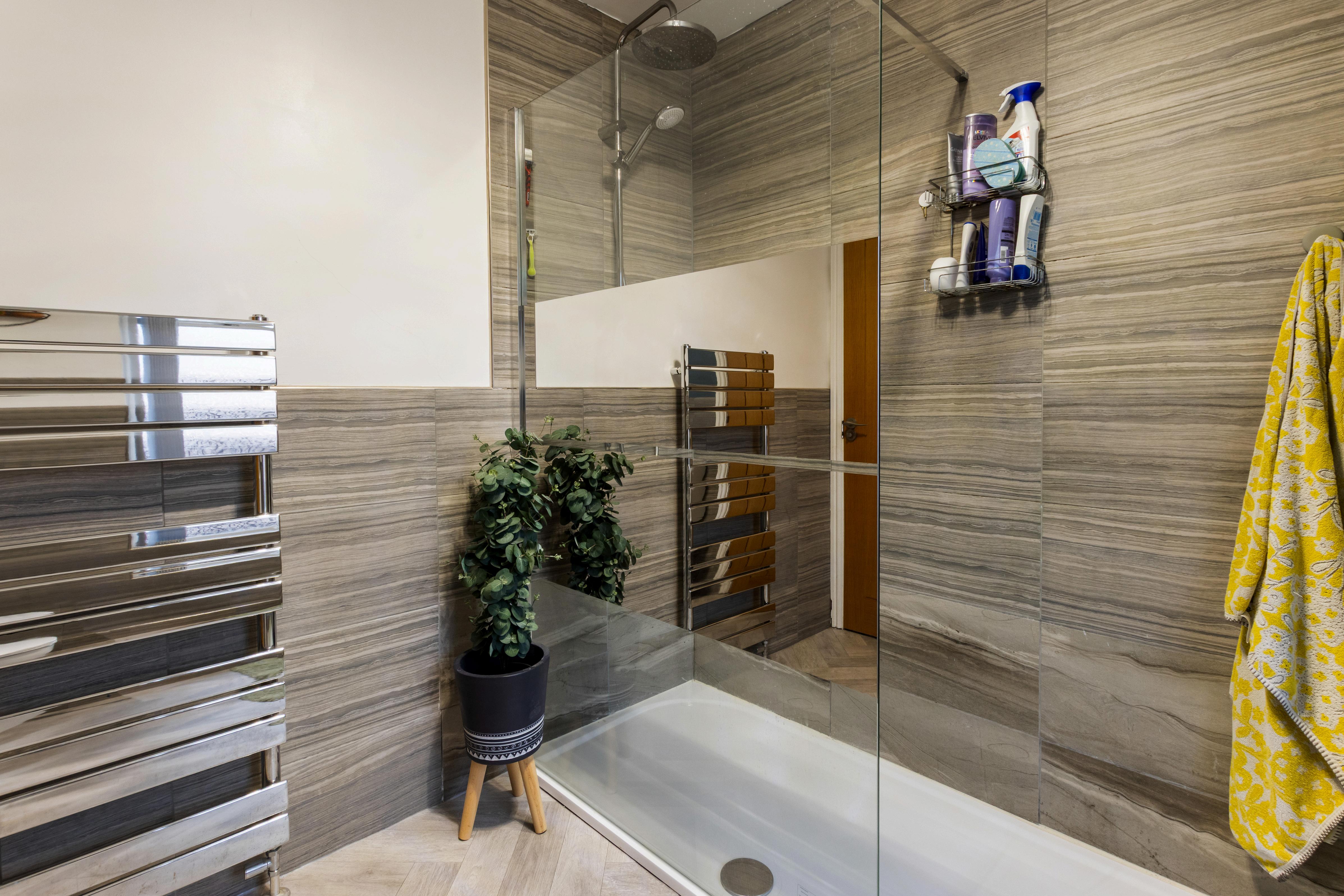 Upstairs are two well-proportioned bedrooms, both presented in calm, neutral tones. The main bedroom features fitted plantation shutters, while the second bedroom comfortably accommodates a double bed or desk area. The contemporary shower room is fully tiled with a walk-in enclosure, rainfall shower, chrome heated towel rail and vanity-style wash basin.