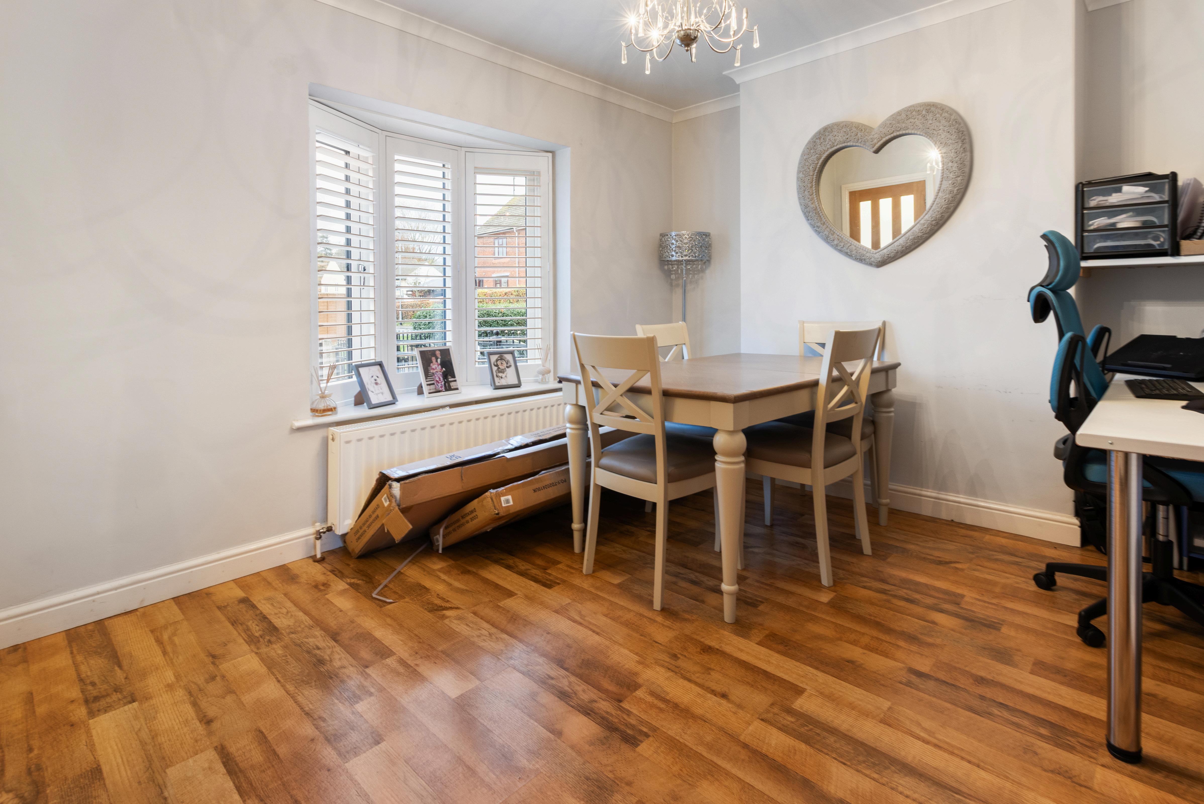 Stylishly presented and ready to move straight into, this attractive semi-detached home has been thoughtfully improved to suit modern living. The ground floor features two welcoming reception rooms, a bright lounge with wood-effect flooring, a contemporary feature light fitting and neutral décor, and a separate dining room with a bay window finished with plantation shutters.