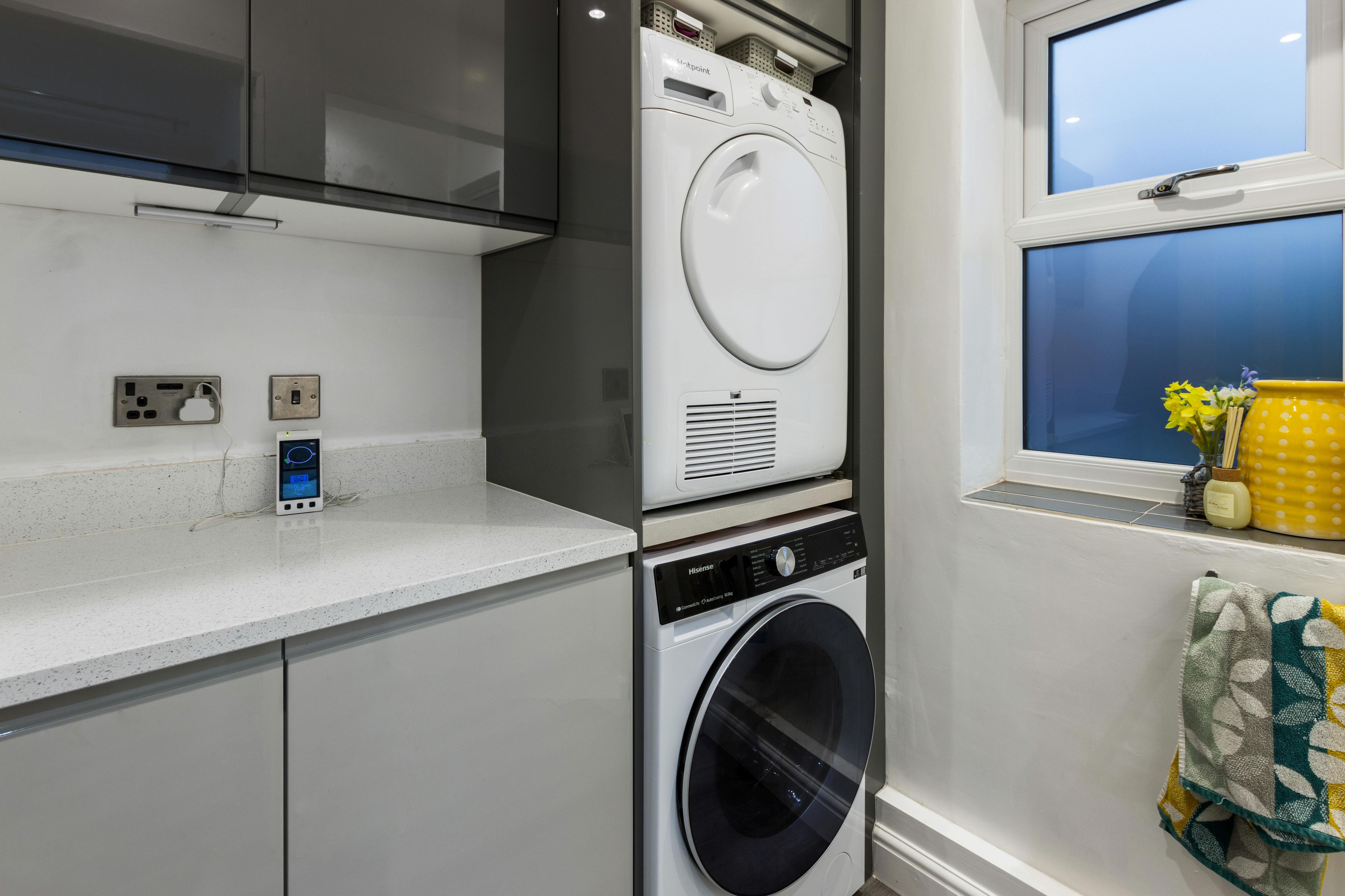 To the rear, a dedicated utility area provides additional storage, matching cabinetry, and space for both washing machine and tumble dryer. There’s also a modern ground floor cloakroom with WC and wash basin in this utility area.