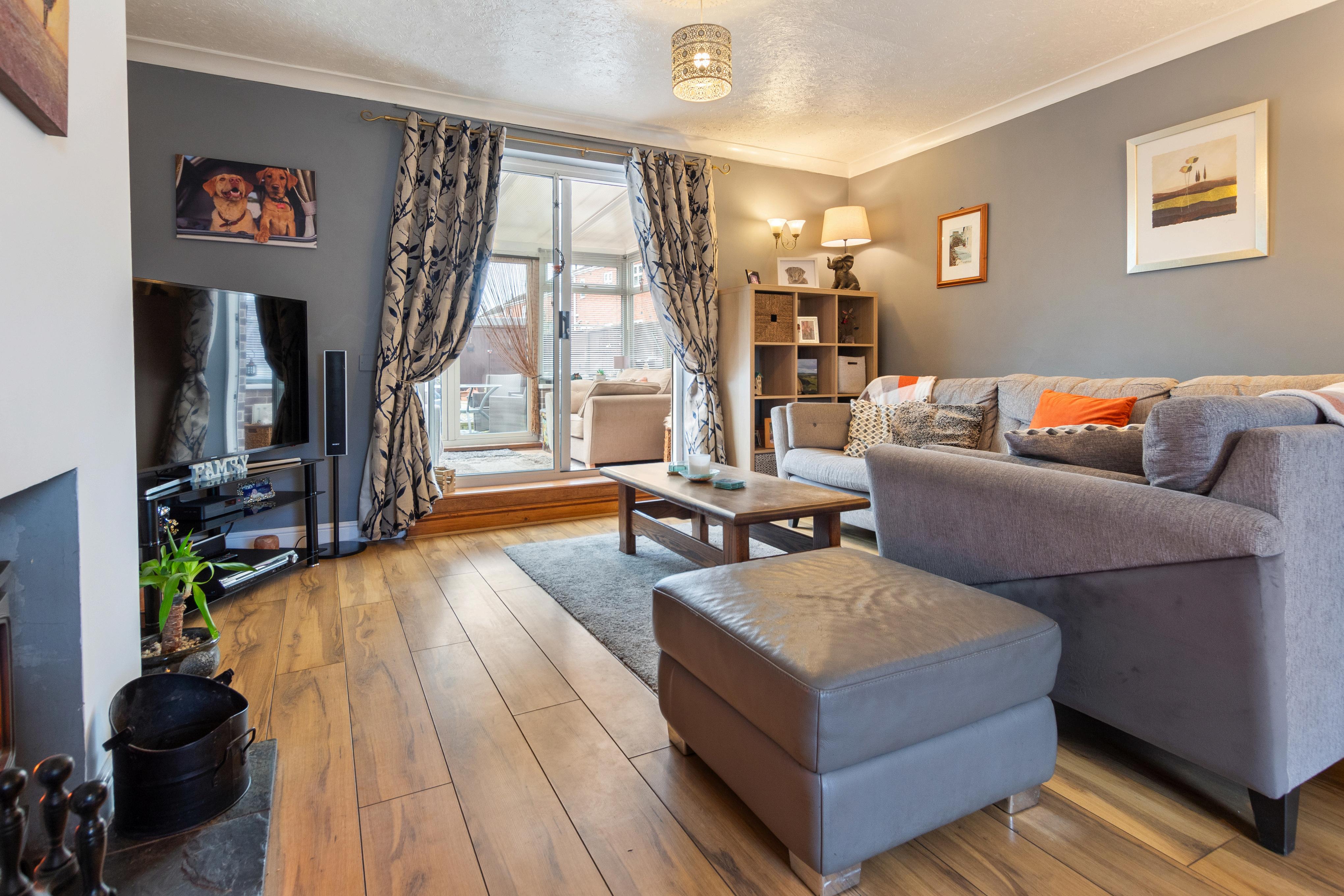 Adjoining the lounge/diner, the spacious conservatory enjoys beautiful views over the rear garden, providing an ideal spot for relaxation or entertaining, with an abundance of natural light filling the room. The fitted kitchen is equipped with a range of high-gloss base and wall-mounted cabinets, offering a sleek, modern finish. It includes a built-in oven, hob, and extractor fan, with ample space for white goods, making it both stylish and practical. Additionally, a convenient understairs cupboard offers extra storage space for household items. Completing the ground floor is the handy rear porch, which not only offers access to the garden but also provides space and plumbing for a washing machine, adding a functional, practical element to the home.