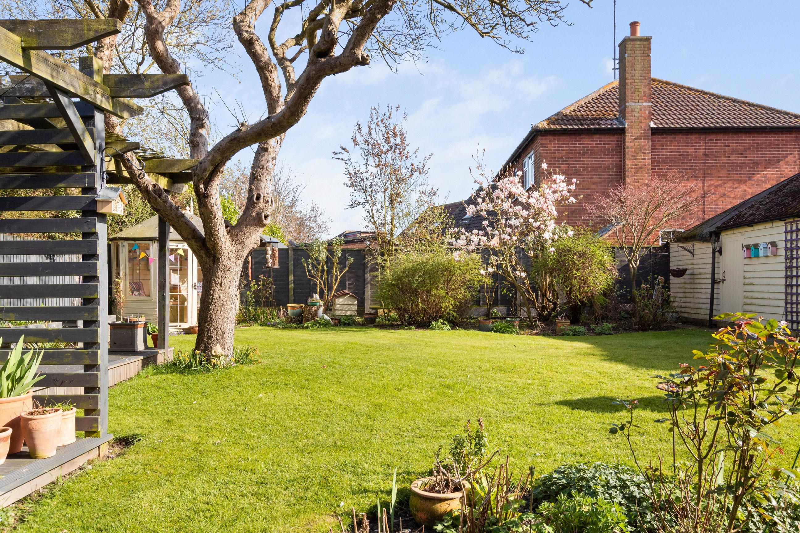 Set on a 0.13-acre plot, the property is well-suited for families, offering ample outdoor space. To the front, there is off-road parking for multiple vehicles alongside a well-kept lawn. The rear garden is a true highlight, catering to a variety of lifestyles with a lawned area, a covered decking space ideal for outdoor dining or relaxation, a patio, a charming corner summer house, and two large sheds—one of which is insulated and has been used as a home office.