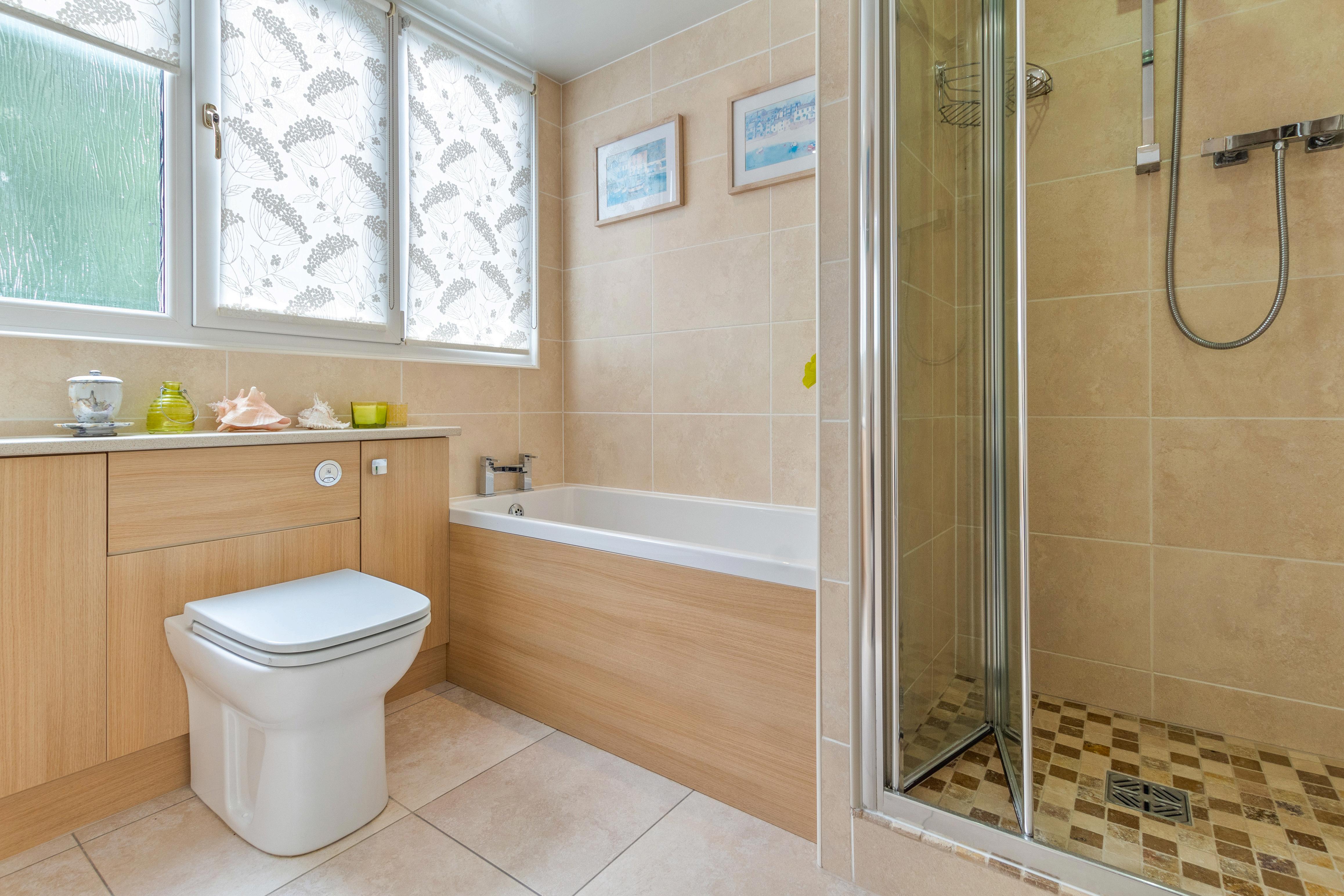 Upstairs, there are three generously sized bedrooms. The master bedroom boasts a walk-in wardrobe/store, offering plenty of storage space. The family bathroom features a vanity sink and WC unit, a bath, and a separate shower cubicle, ensuring comfort and convenience for the entire family.