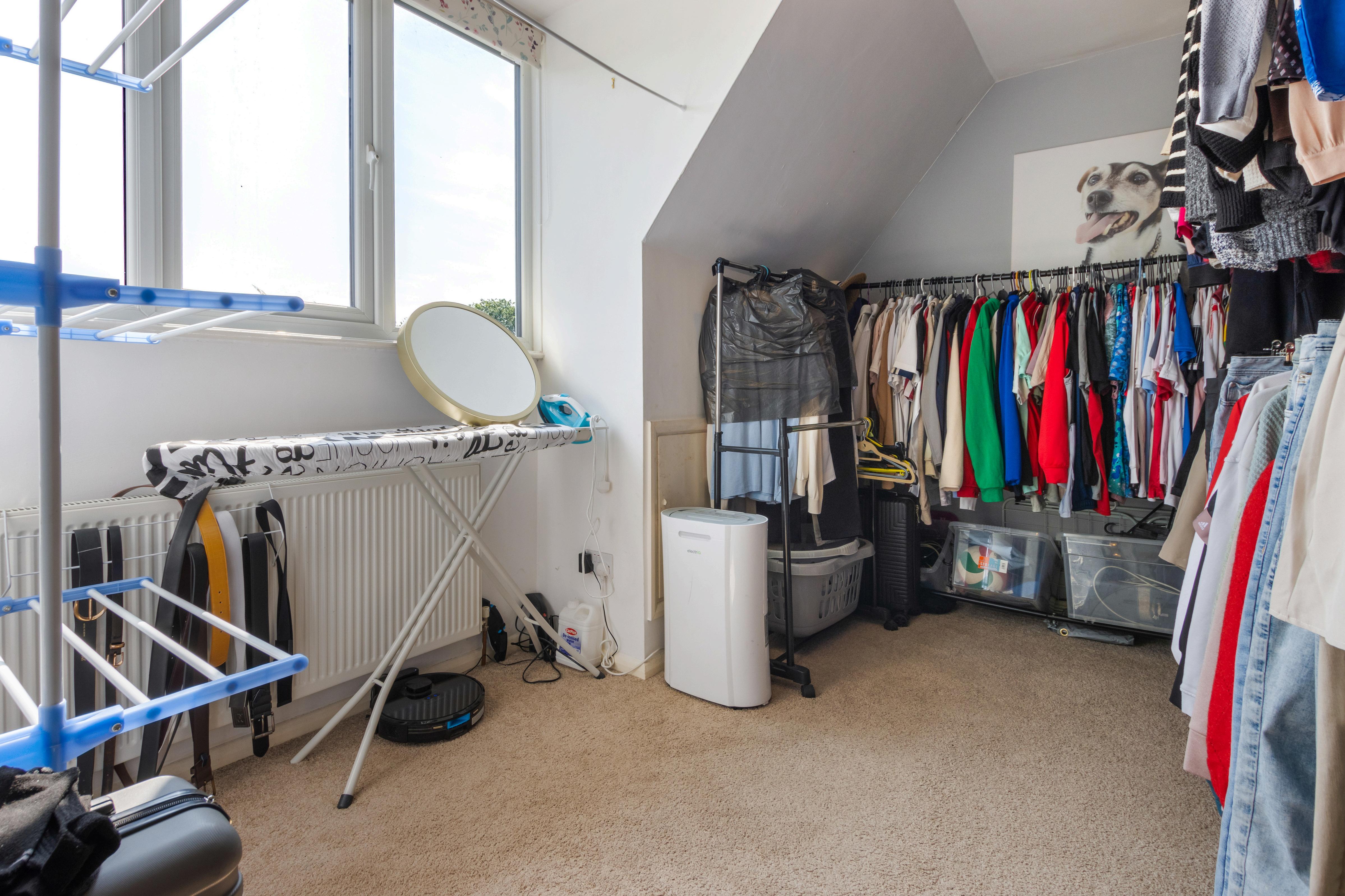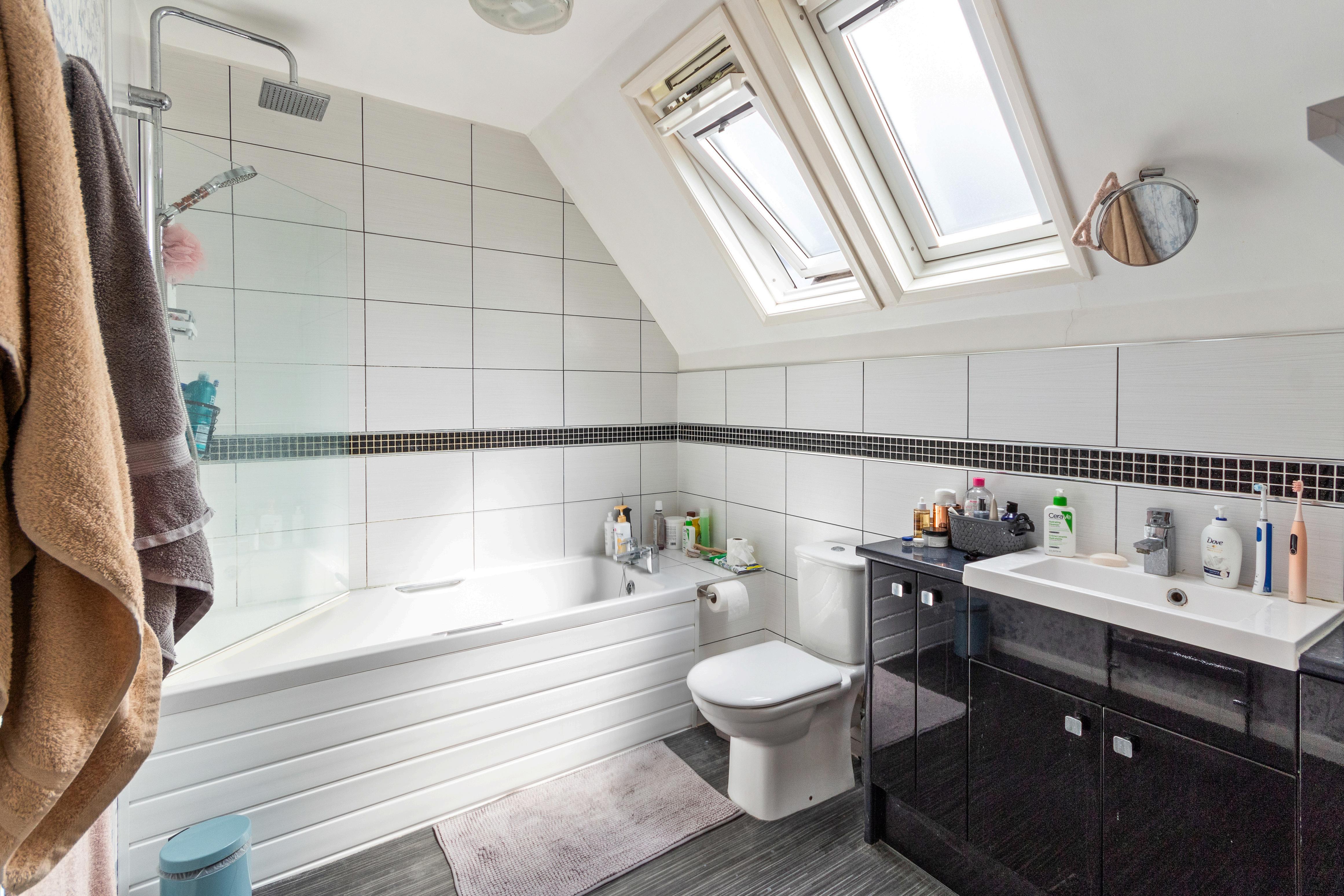 Upstairs, the property boasts three well-proportioned bedrooms, including a versatile third bedroom which could be used as a dressing room, nursery, or home office. The contemporary family bathroom is well-appointed and features bath with shower over, vanity sink unit and WC.