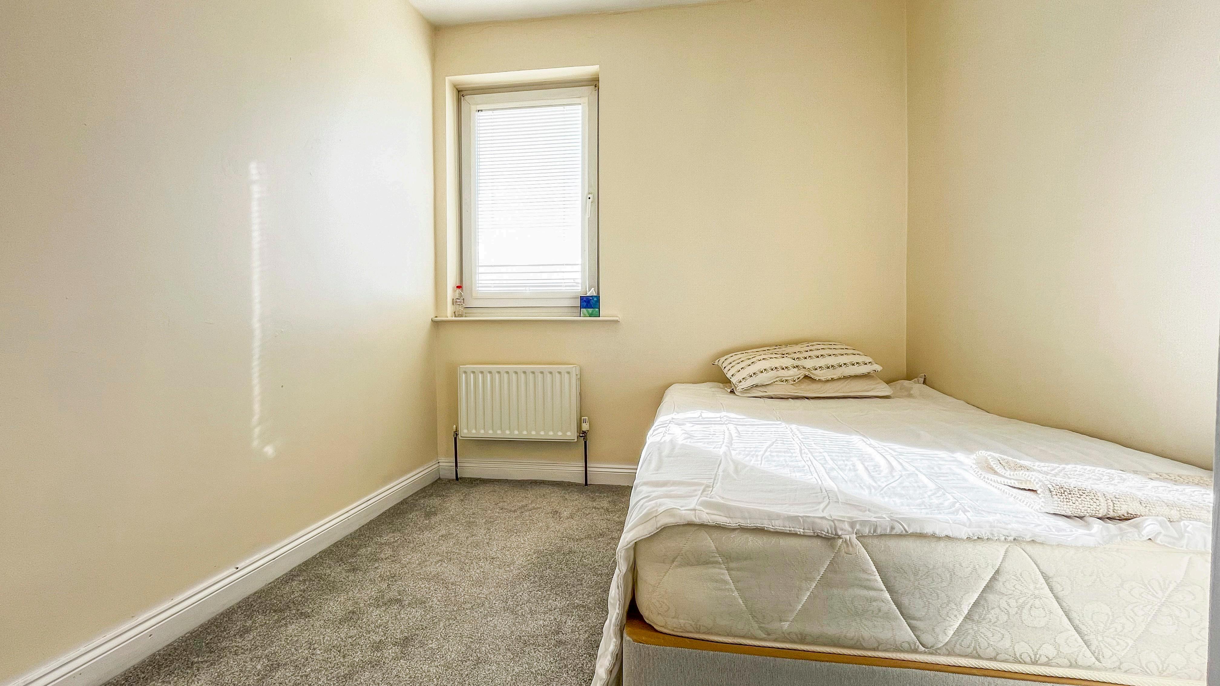Upstairs, the home boasts two well-proportioned bedrooms. The family bathroom is fitted with a bathtub, separate shower cubicle, wash hand basin, and WC, ensuring both comfort and functionality.