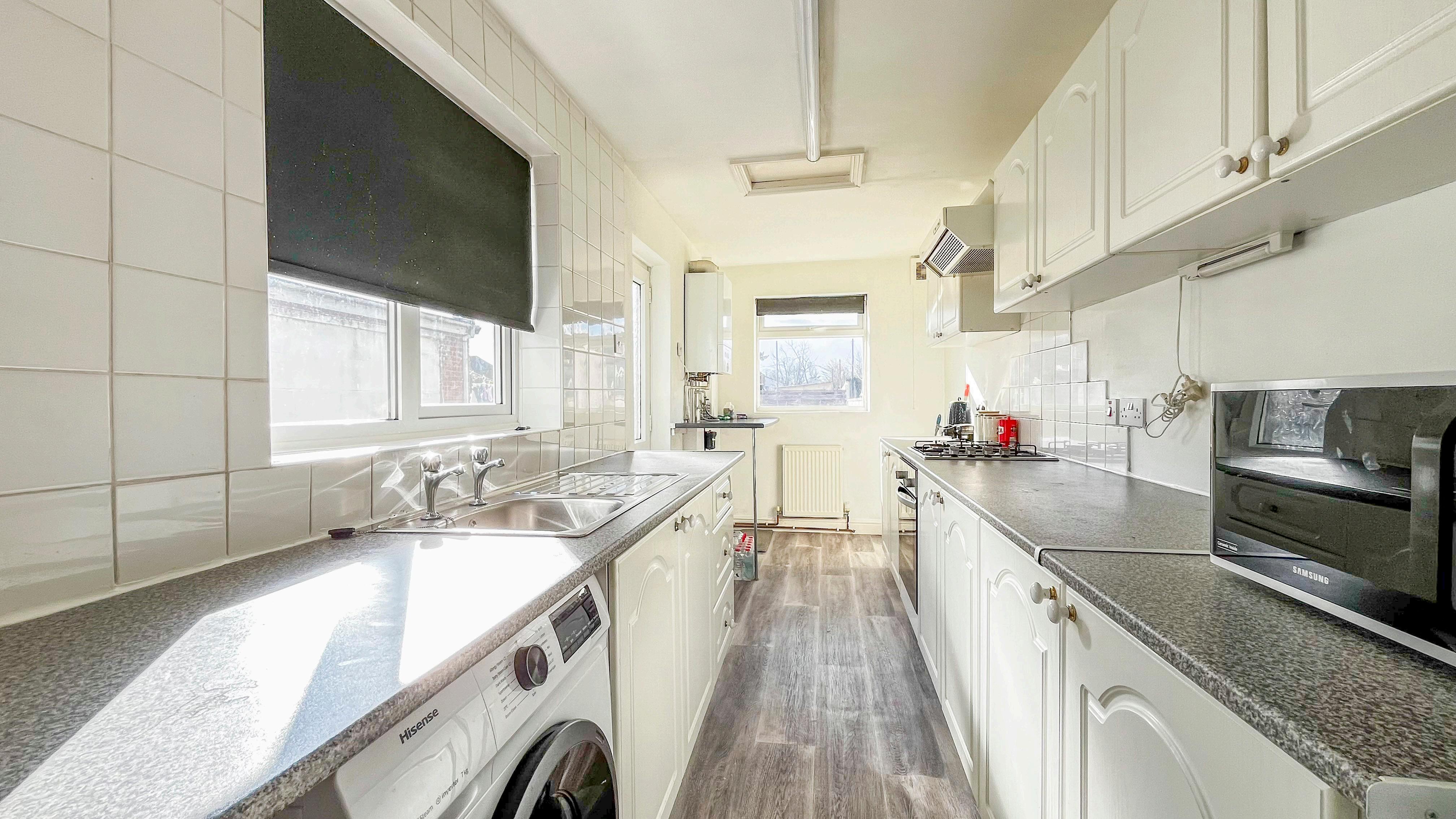 Step inside through the side entrance to find an inviting front-facing lounge, where a traditional bay window allows natural light to fill the space. The spacious dining room features a handy under-stairs cupboard and leads through to the fitted galley-style kitchen, which offers ample storage, generous worktop space, and room for appliances. A rear exit door provides easy access to the enclosed rear garden.
