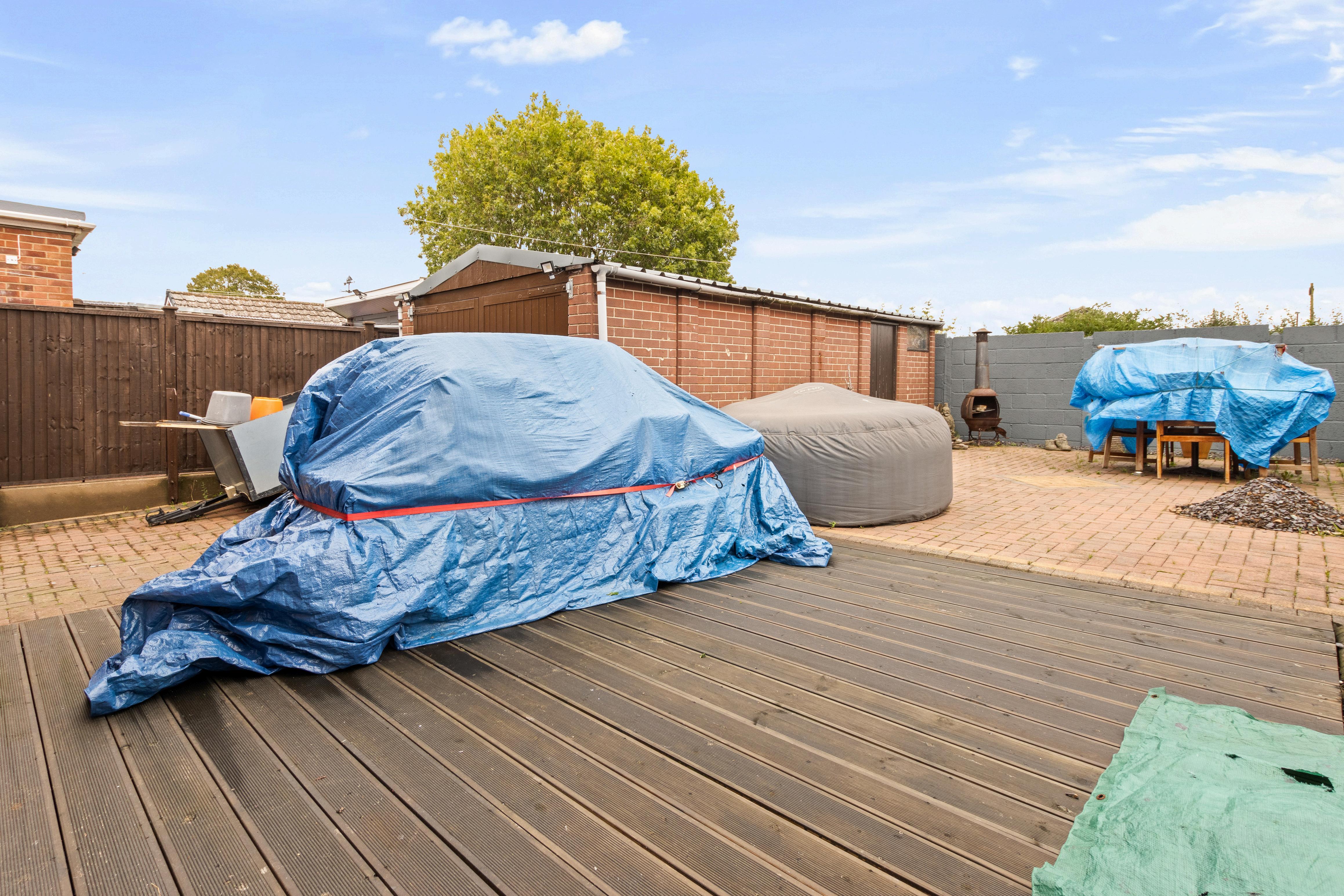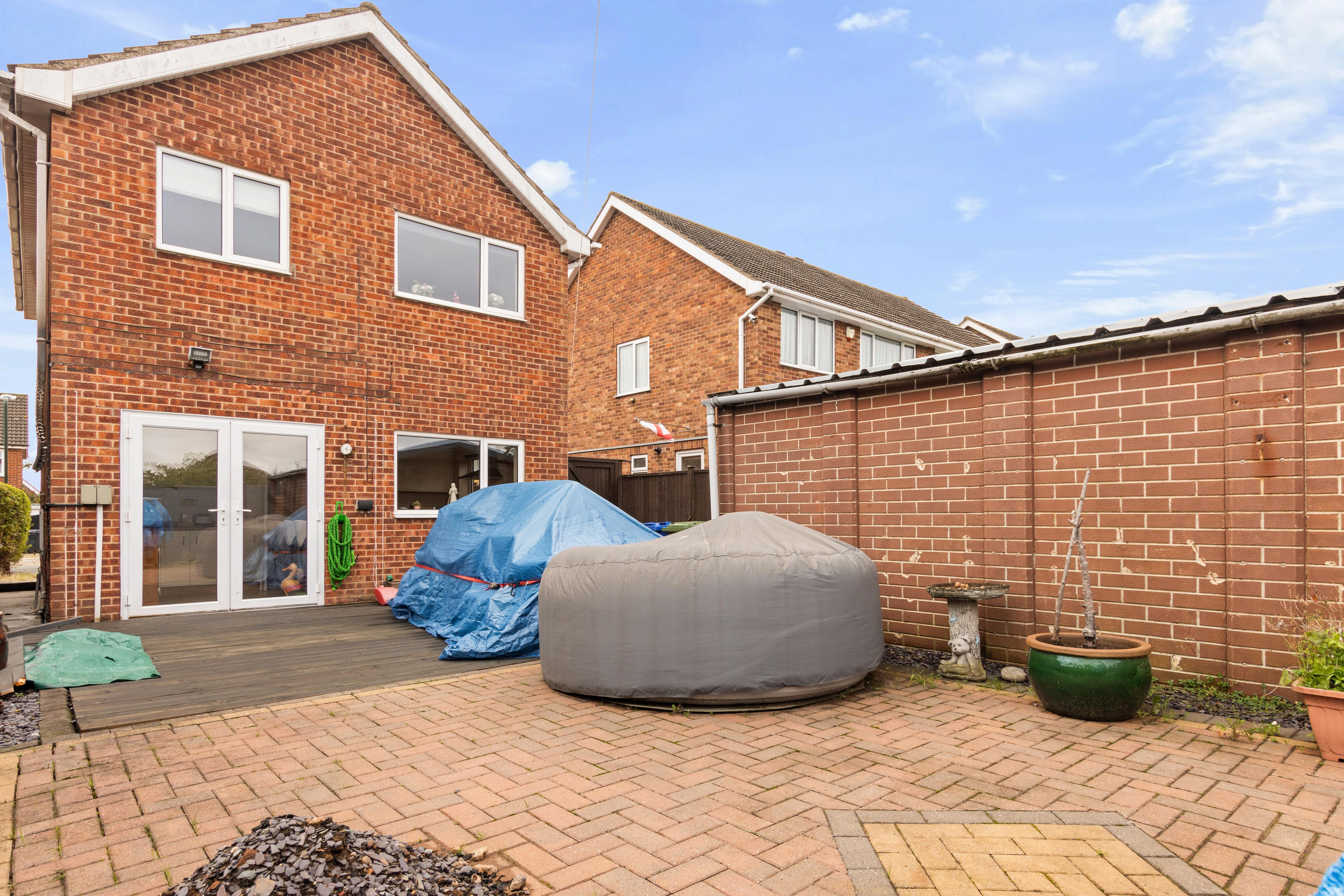 To the front, the property features a spacious paved driveway with room for multiple vehicles, leading to a detached garage ideal for secure parking or additional storage. The rear garden is a standout feature, with a decking area perfect for outdoor dining and a well-maintained lawn offering space for children to play or for keen gardeners to enjoy. Decorative touches, such as duck sculptures and thoughtful landscaping, add charm to this outdoor haven.