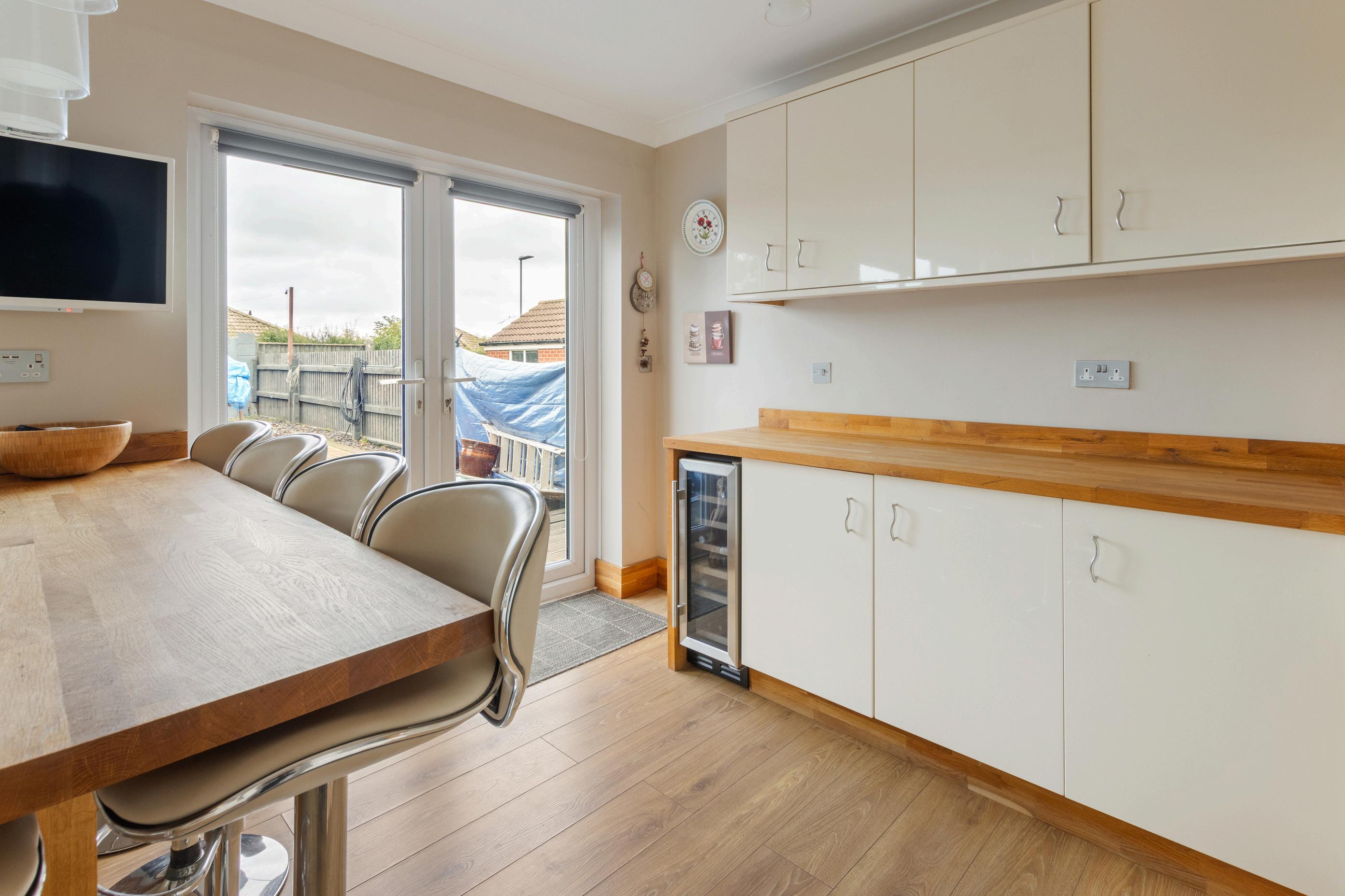 Upon entering, you're welcomed into a bright and inviting lounge (4.06m x 3.25m), tastefully decorated with neutral tones and featuring a central fireplace, perfect for cosy evenings. The kitchen (4.06m x 2.84m) is modern and well-appointed, with cream cabinetry, wooden countertops, and a central island with seating ideal for casual dining or entertaining. Adjacent to the kitchen is a utility room (1.83m x 1.52m), providing convenient space for laundry and storage.