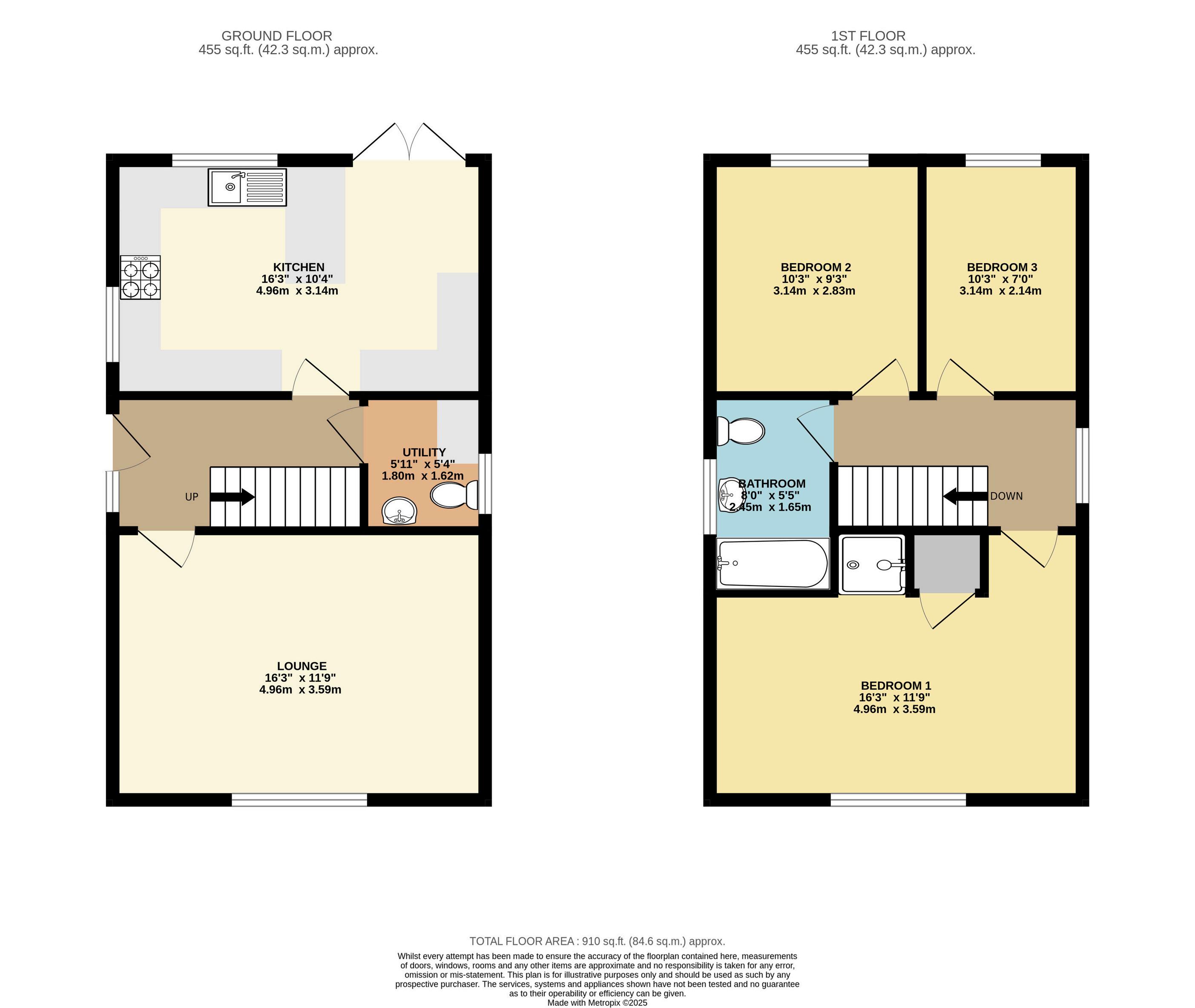 Upstairs, the property boasts three well-proportioned bedrooms. The main bedroom (4.06m x 2.84m) offers ample space for a double bed and features a private shower, while bedroom two (3.18m x 2.84m) and bedroom three (3.18m x 2.13m) are perfect for children, guests, or a home office. The family bathroom (2.13m x 1.52m) is compact yet functional, with potential for modernisation to suit your style.