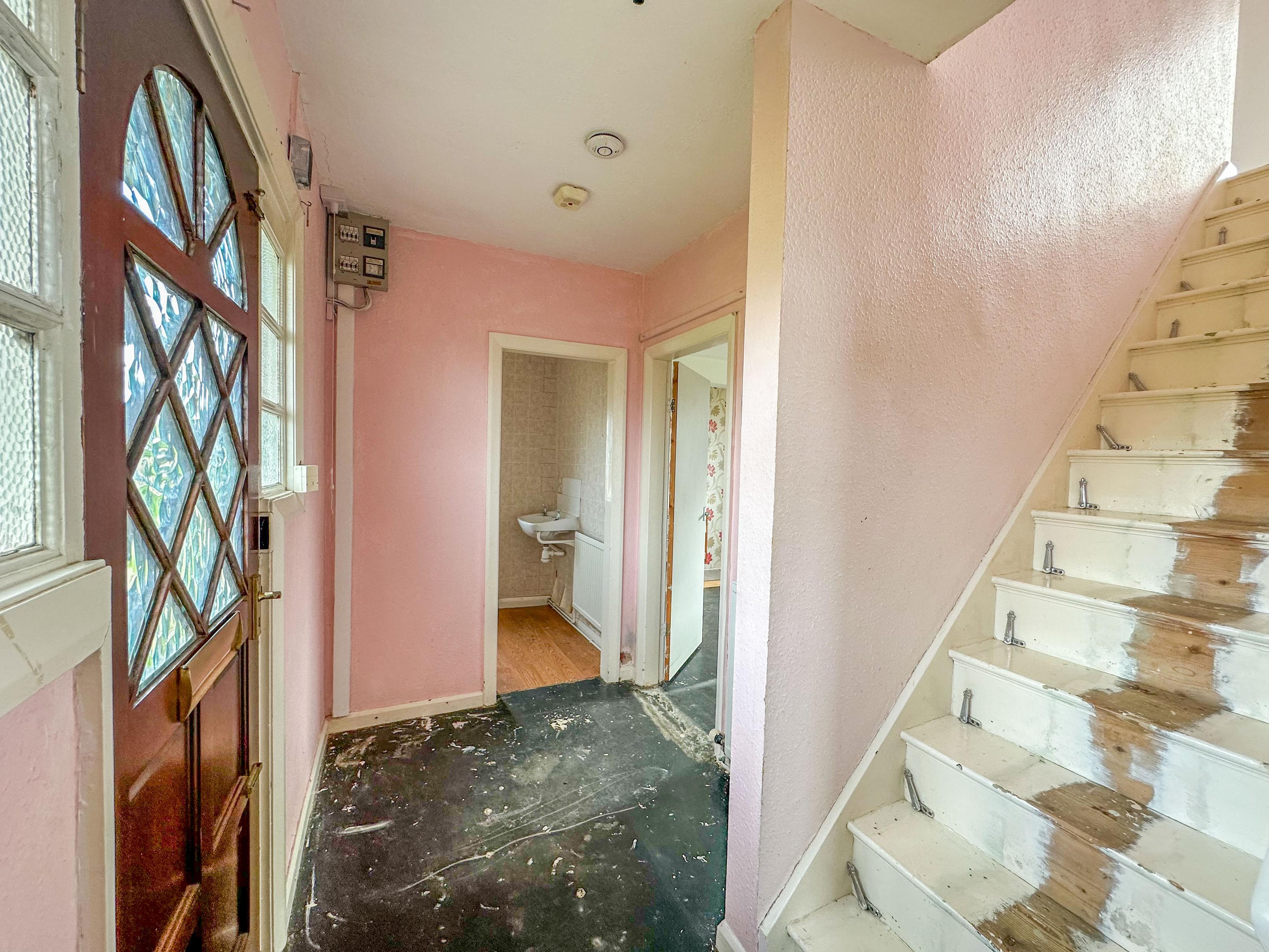 A front entrance doorway opens into the spacious hallway with a staircase leading to the first floor landing.
