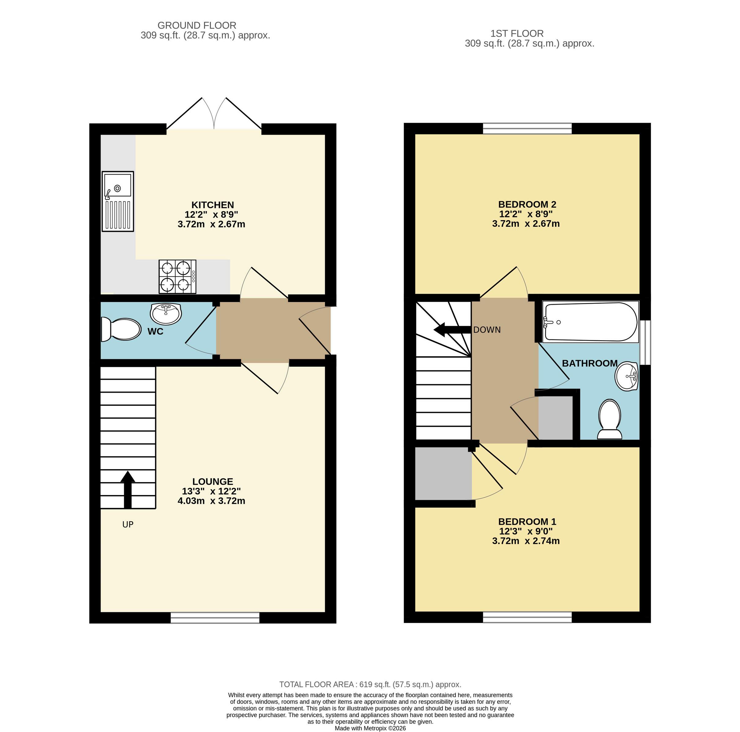 To the first floor are two spacious double bedrooms, along with a family bathroom fitted with a shower over the bath, wash basin, and WC.