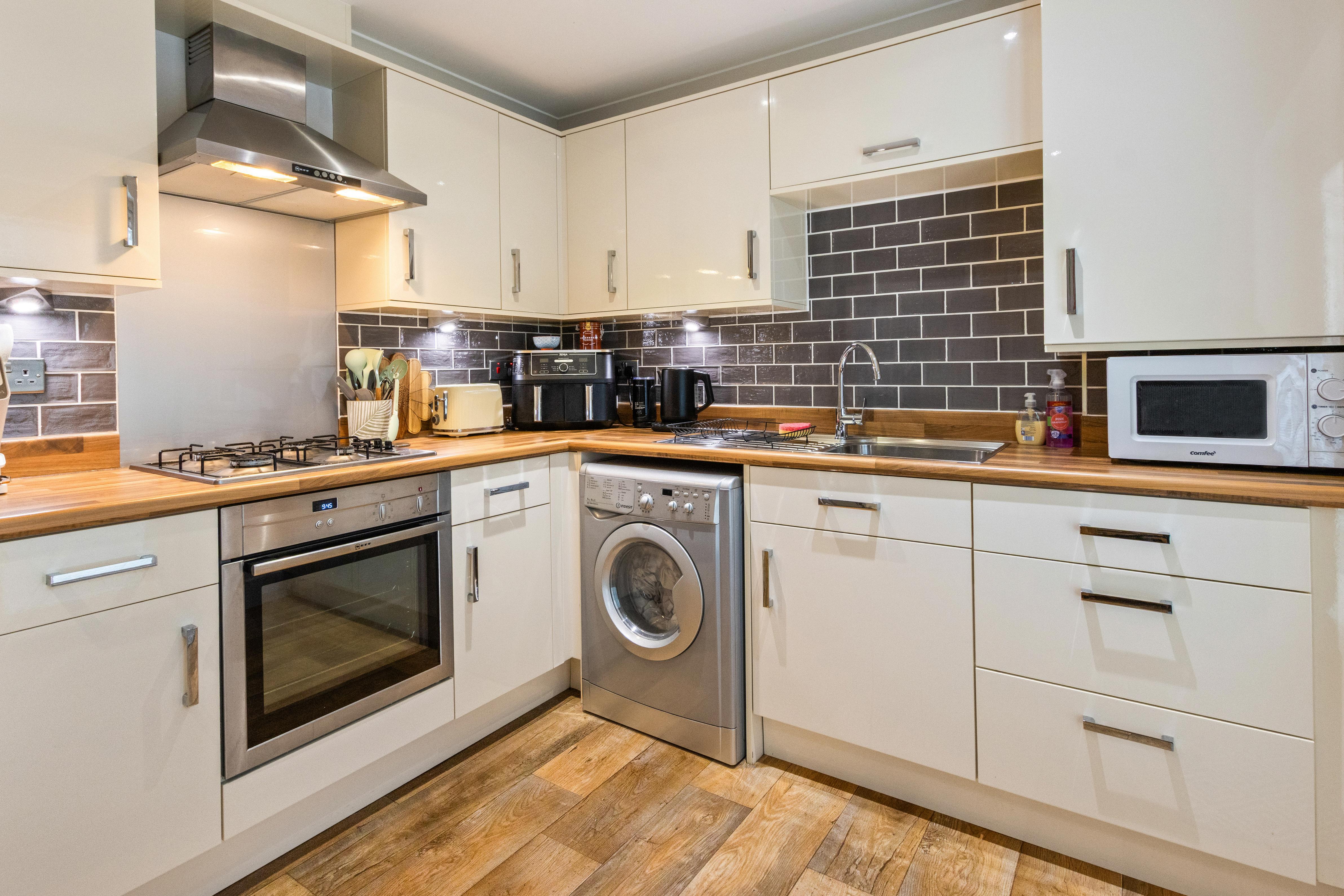 The accommodation opens into an entrance hall, with the bright and welcoming lounge situated to the left and the modern fitted kitchen diner to the right, which includes an integral oven and extractor, washing machine, fridge freezer and microwave. From here, French doors open directly onto the rear garden, creating a connection between indoor and outdoor living and making the space ideal for entertaining. A useful downstairs WC completes the ground floor.