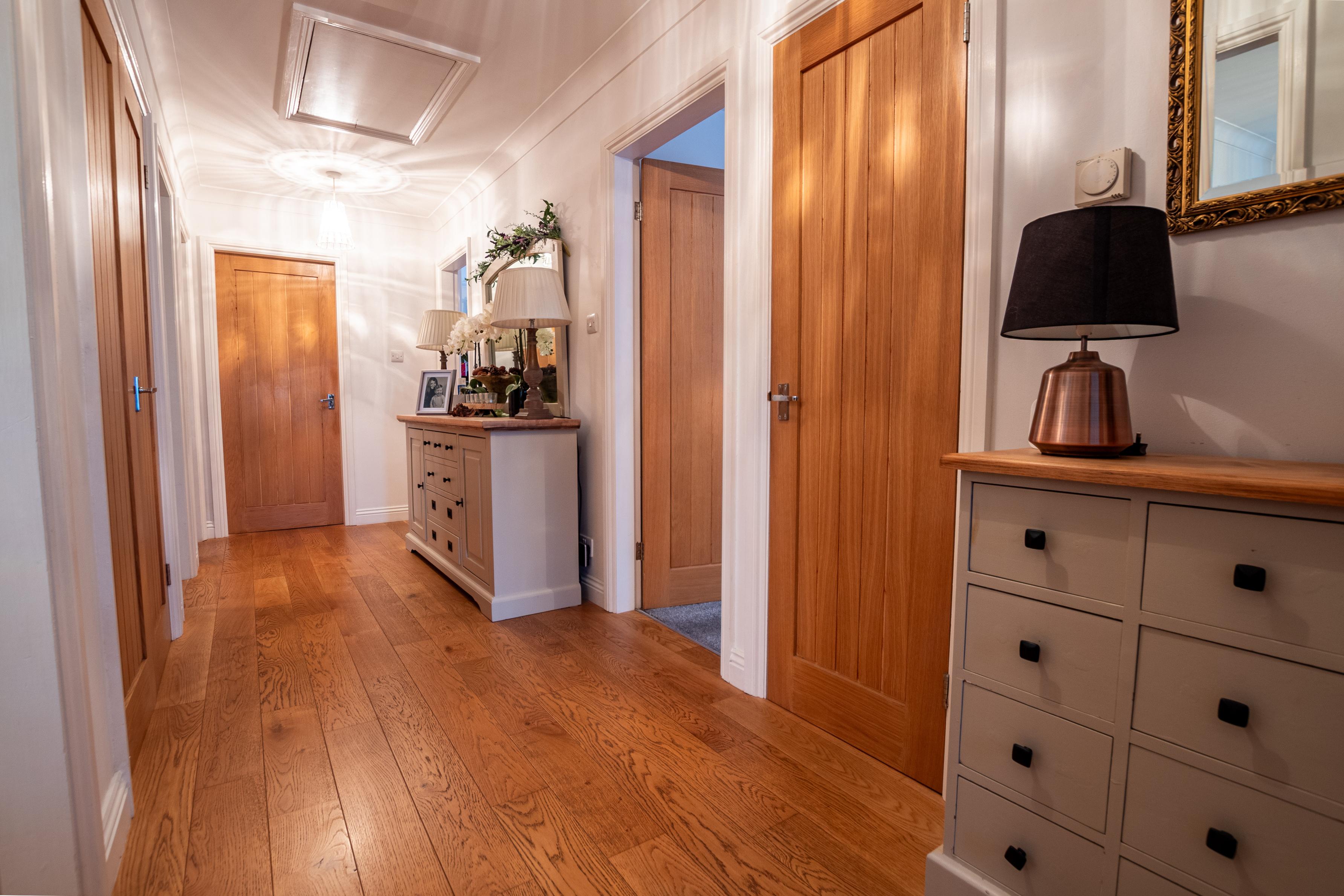 As you step through the main front entrance door, you're greeted by a welcoming porch. This space not only leads to the garage but also provides access to various rooms and features handy storage options, including a cloak cupboard and linen cupboard.