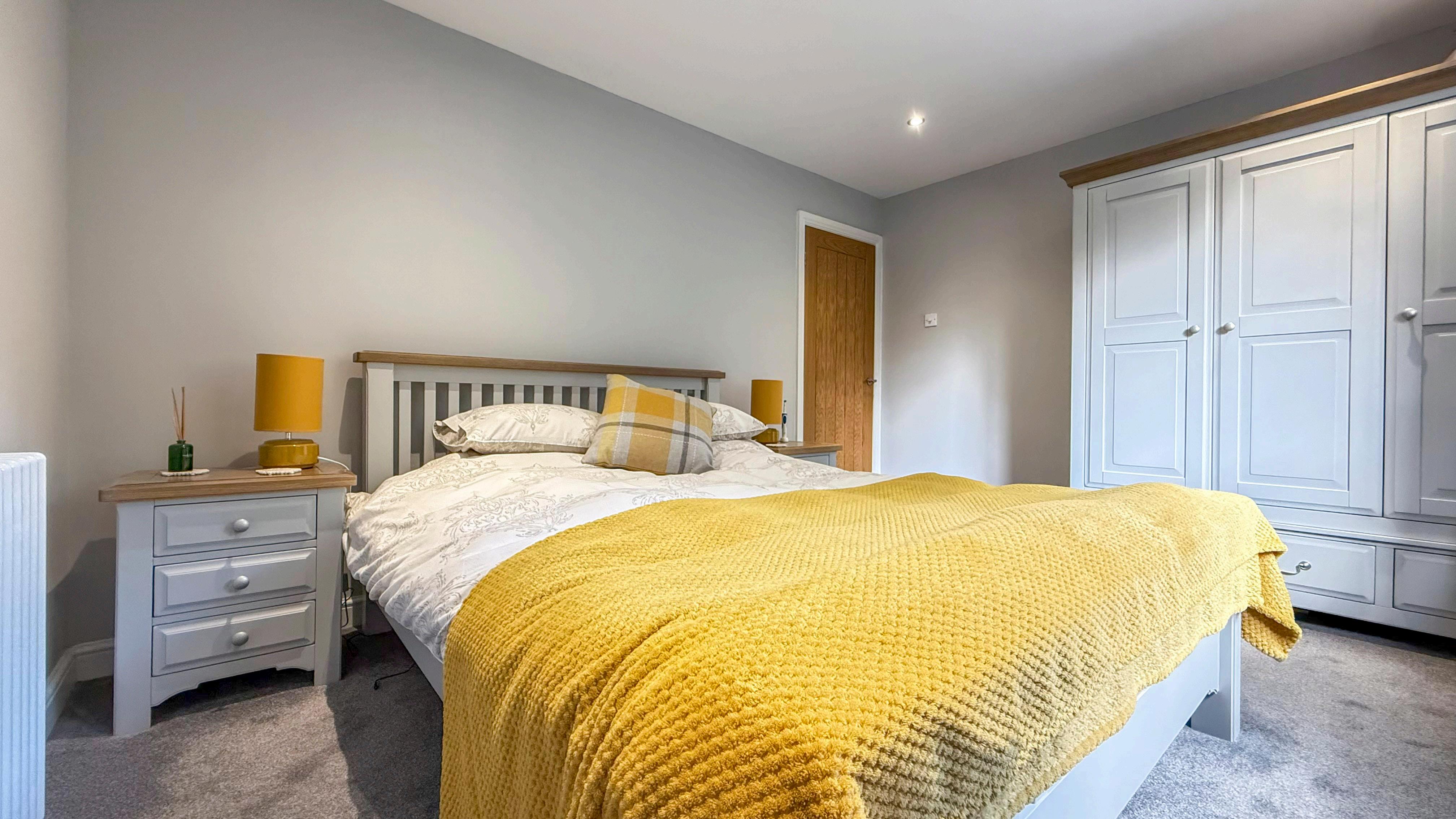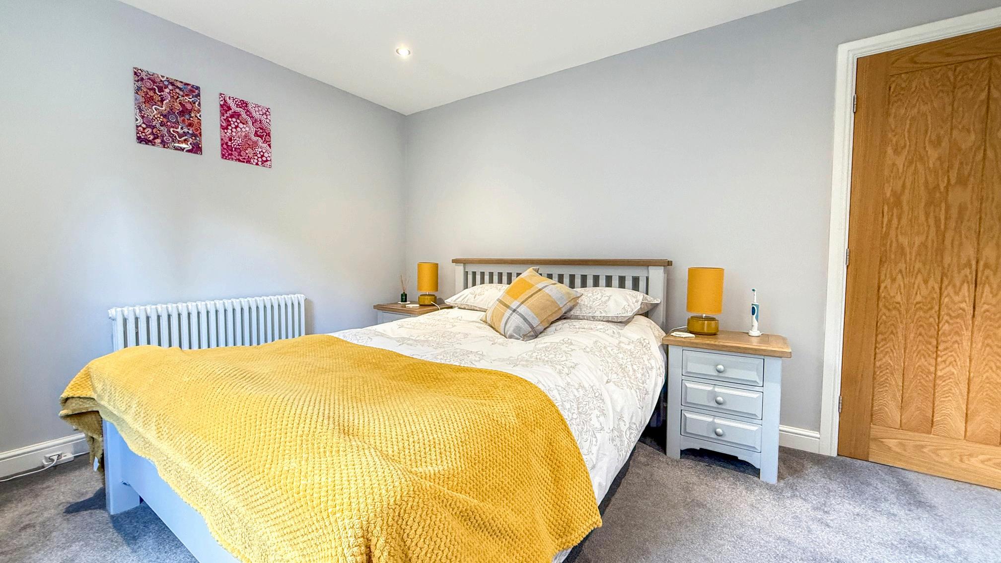 Upstairs, the property offers two generously sized double bedrooms, both tastefully decorated, and a modern family bathroom complete with a bathtub, separate shower cubicle, vanity sink unit and WC – providing both style and functionality.