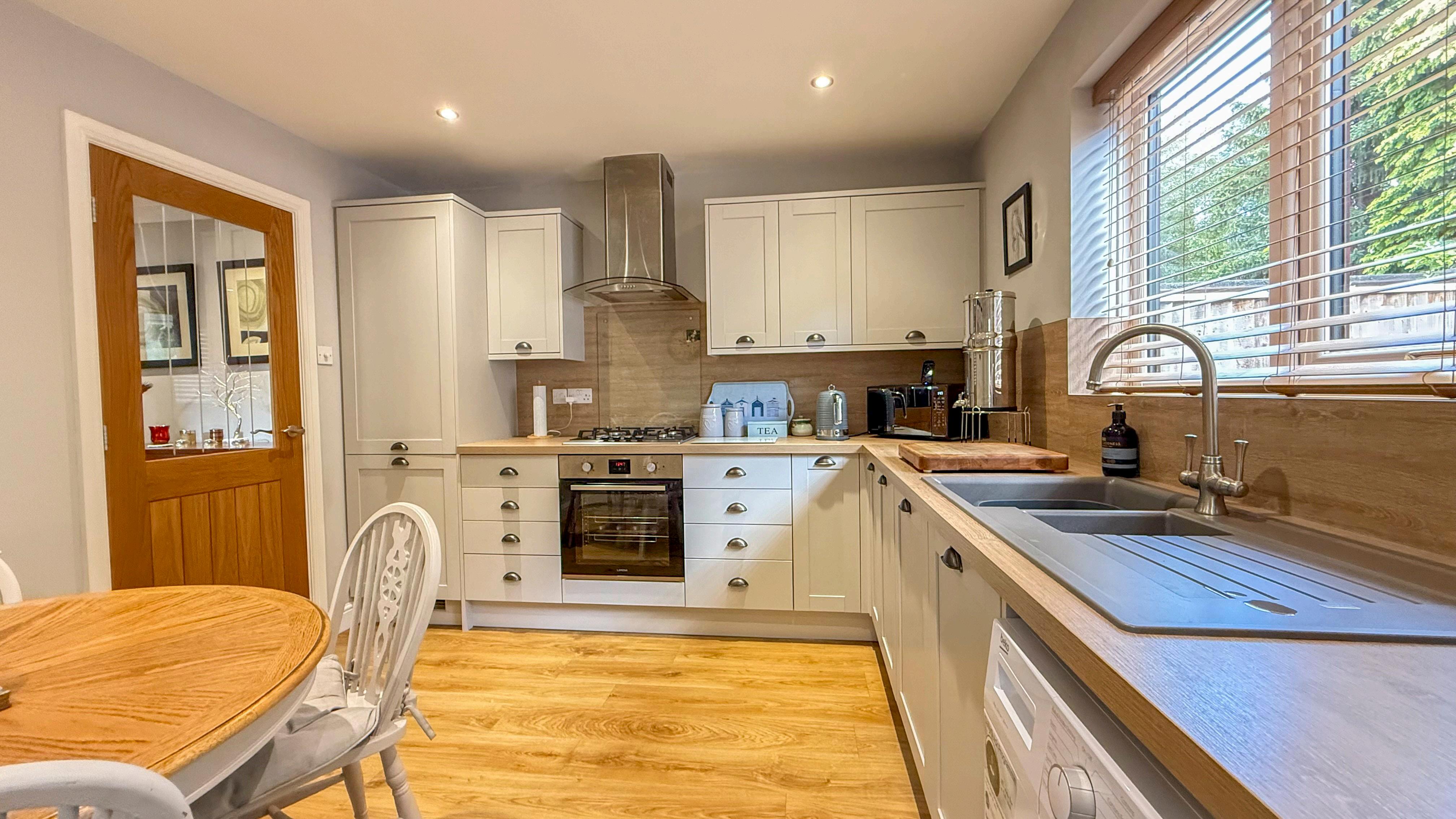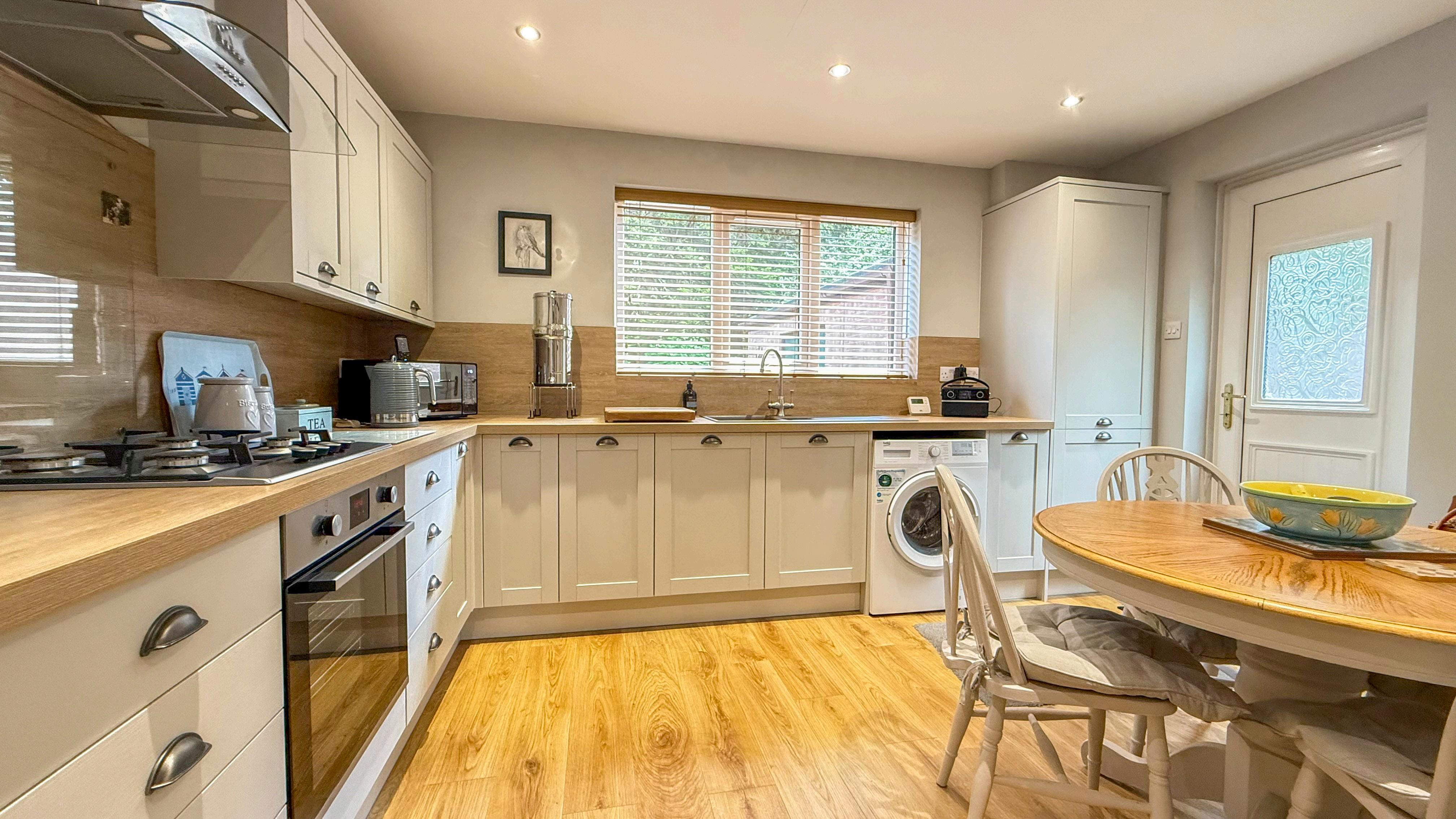 To the rear of the home is a well-proportioned kitchen/diner, fully fitted with attractive shaker-style units, plentiful worktop space, complimentary splashback, a built-in oven and a gas hob. A side door from the kitchen provides convenient access to the private rear garden.