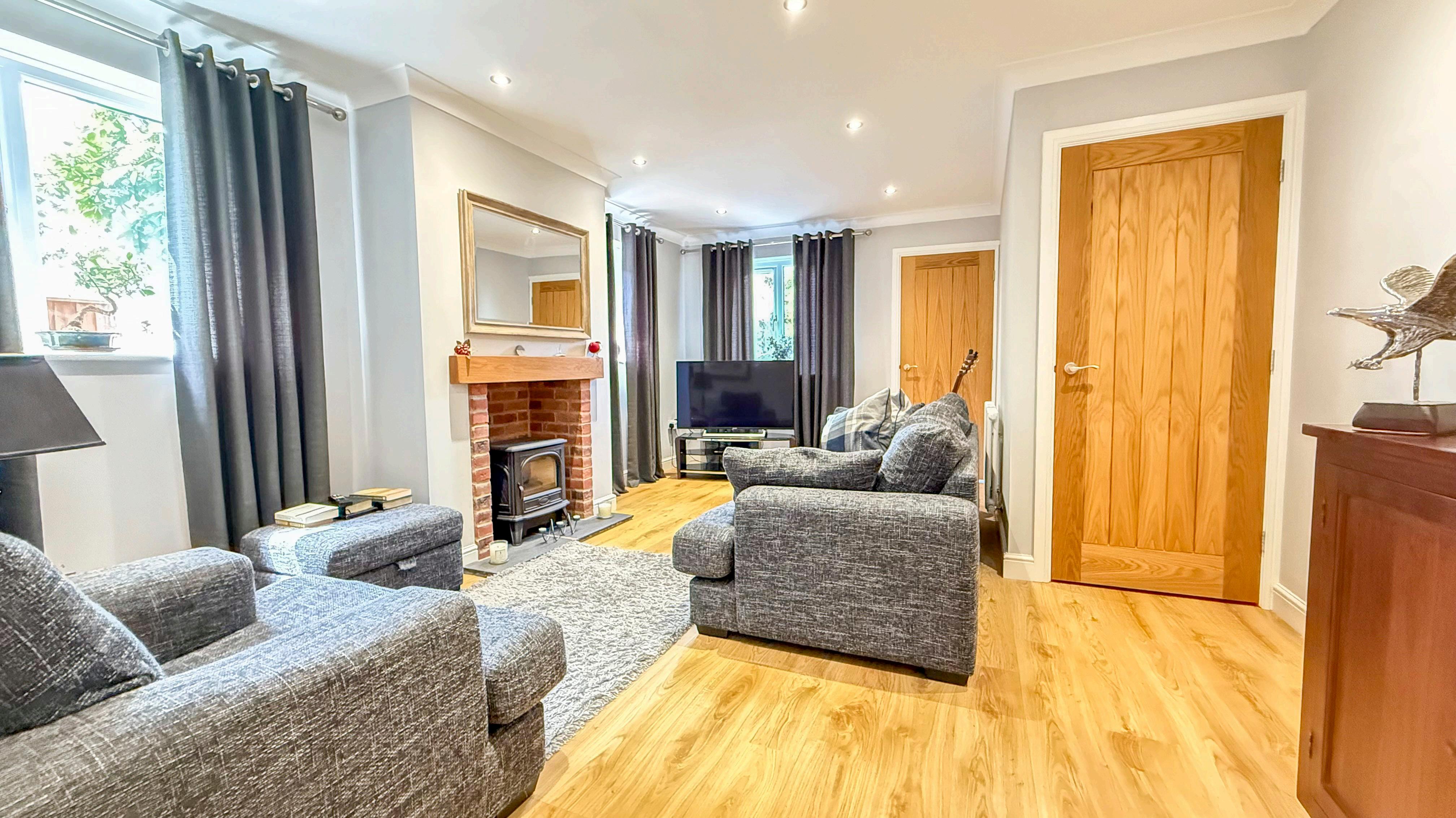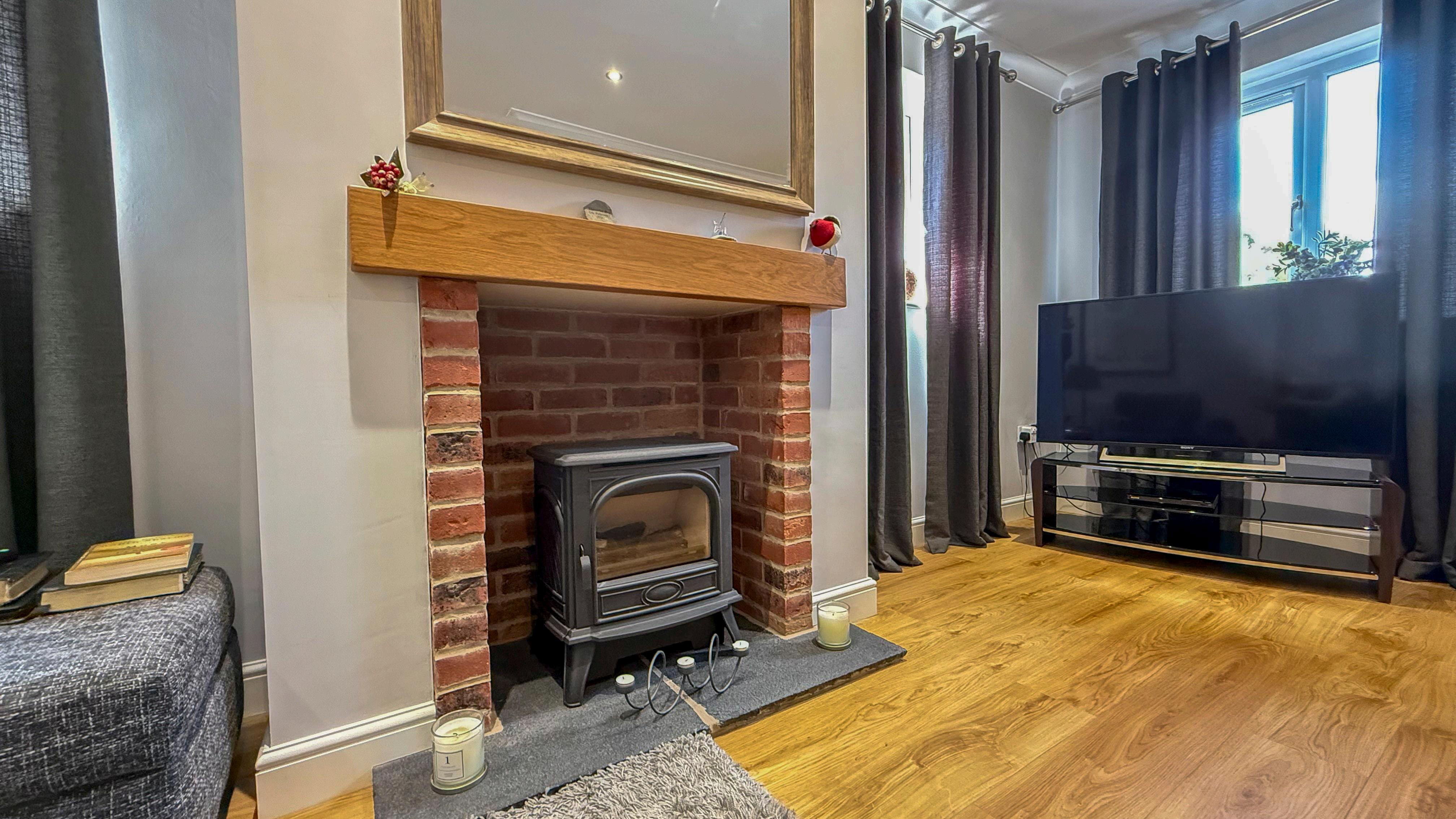 Step inside to find a welcoming entrance hall with stairs rising to the first floor and a door leading into the spacious and lightfilled lounge. The lounge features dual-aspect windows, a stylish modern wood-effect floor, and a striking exposed brick fireplace with wood mantel, adding warmth and character. There’s also a useful understairs storage cupboard for added practicality.