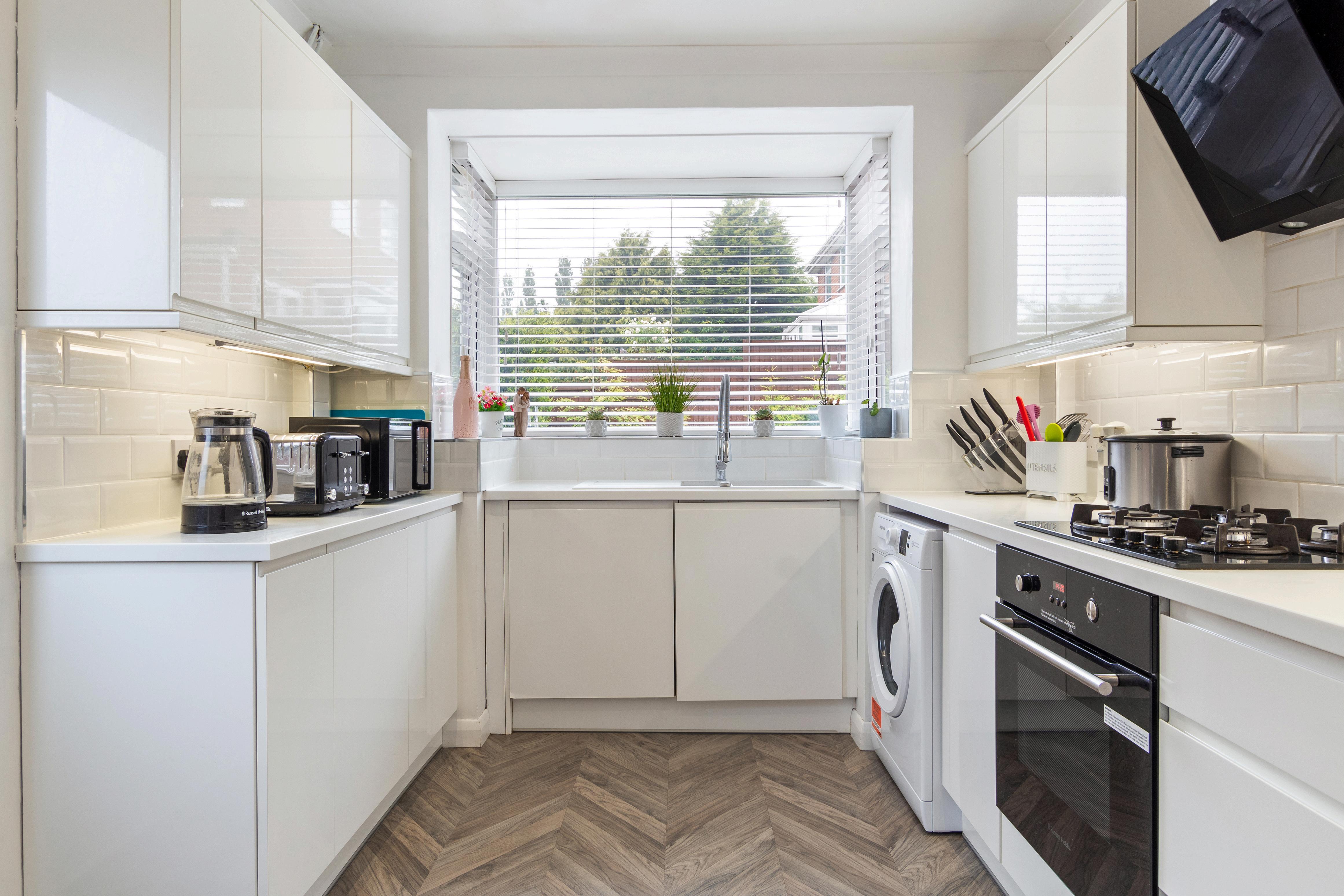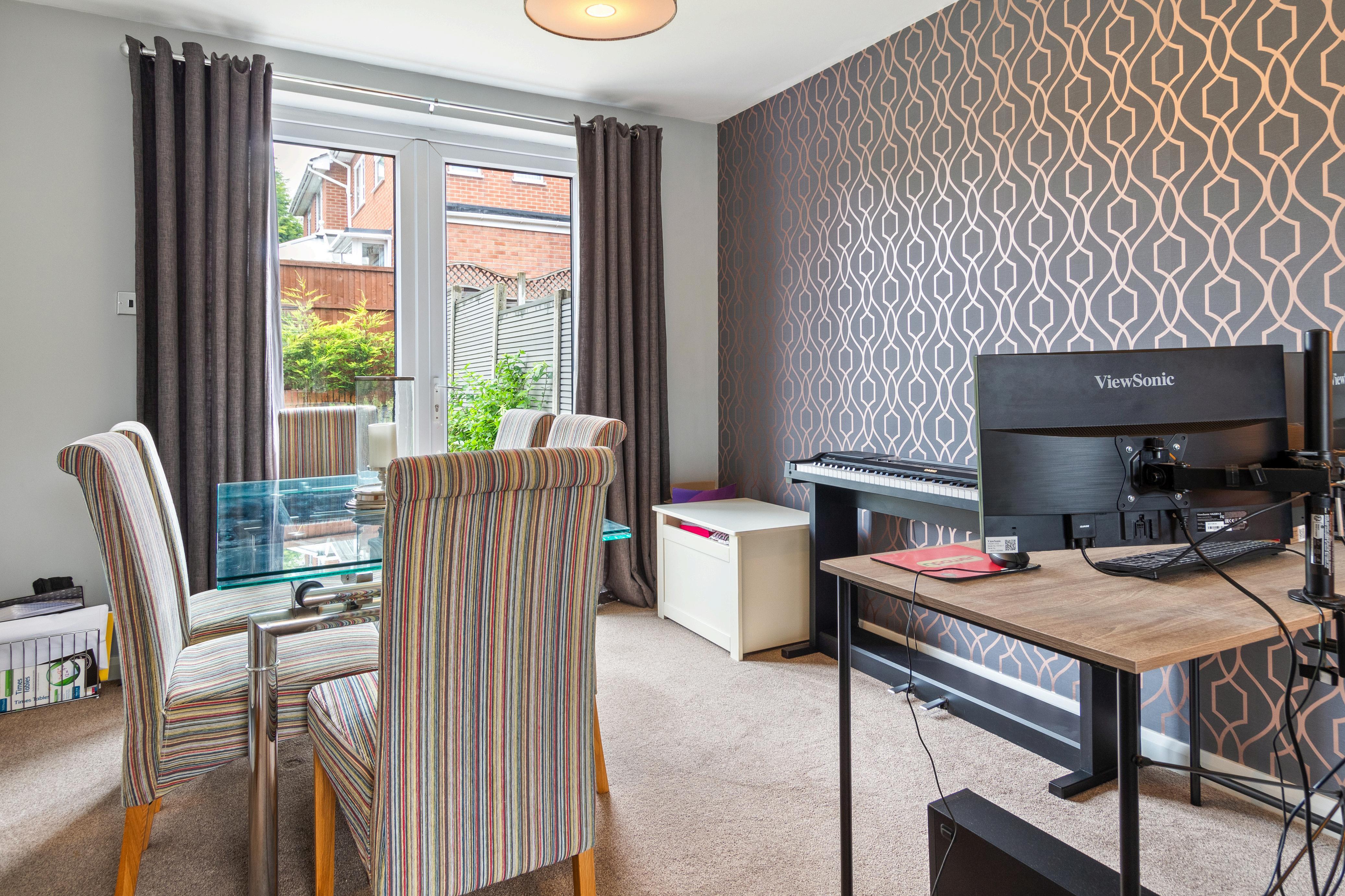 The spacious living and dining area is the heart of the home, featuring an elegant electric fire with surround. Patio doors open directly into the rear garden, creating a bright and airy atmosphere.