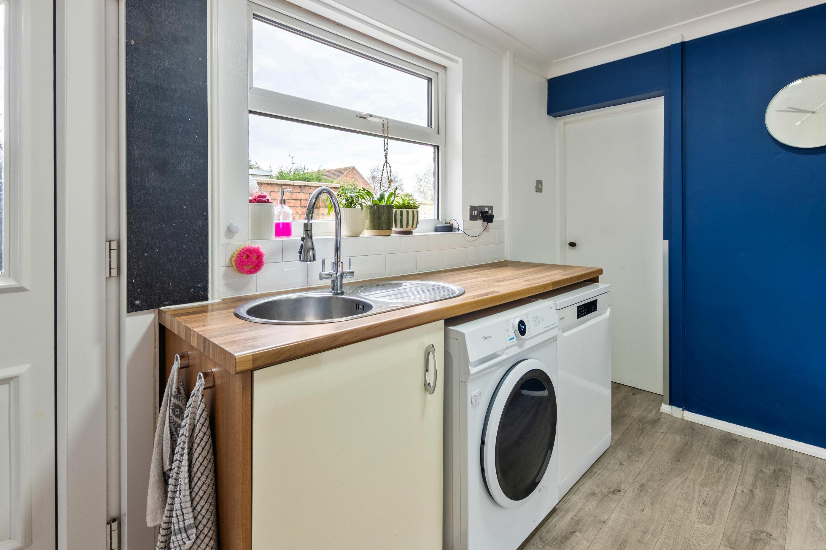 The kitchen sits towards the rear of the property and offers a practical layout with ample worktop and cupboard space, along with room for essential appliances. From here, a door leads into a useful utility/WC, providing additional storage and practicality for busy households.
