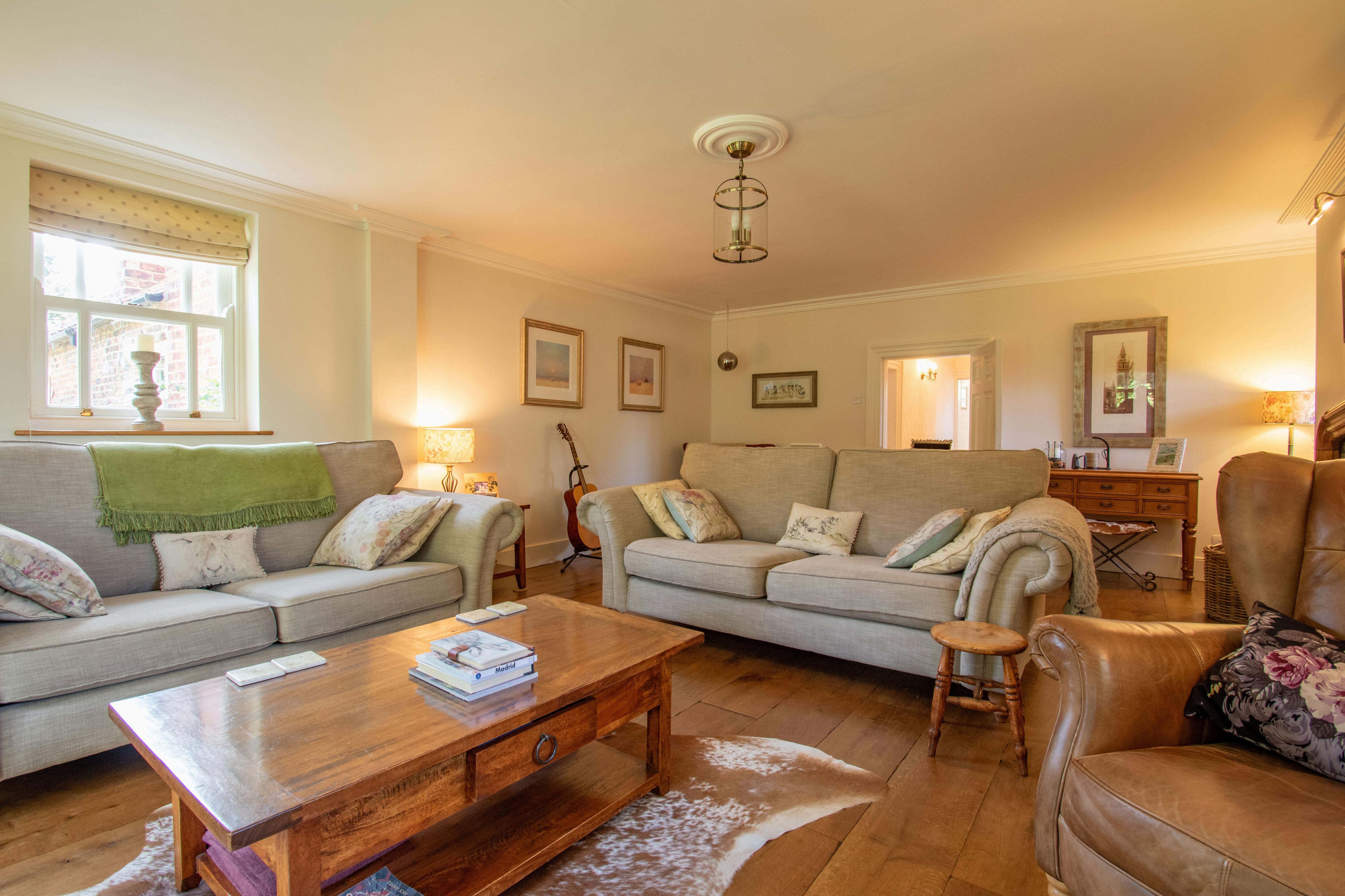 At the rear of the hall, you'll find a light, airy, and elegant sitting room. French doors open to the garden, and five sash windows surround the room, ensuring an abundance of natural light. A notable feature is the custom-shaped, oak-framed inset fireplace, which houses a wood-burning stove.