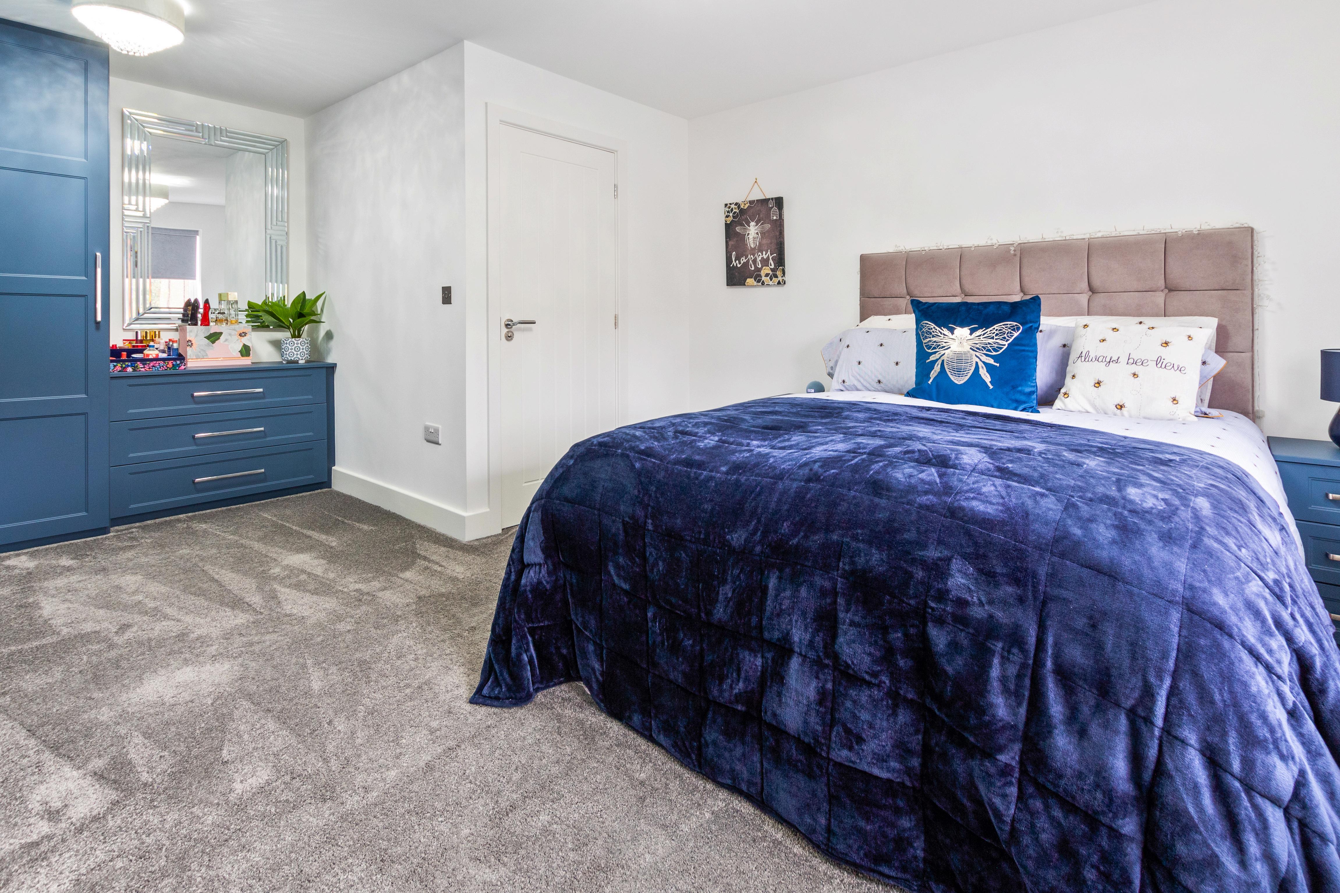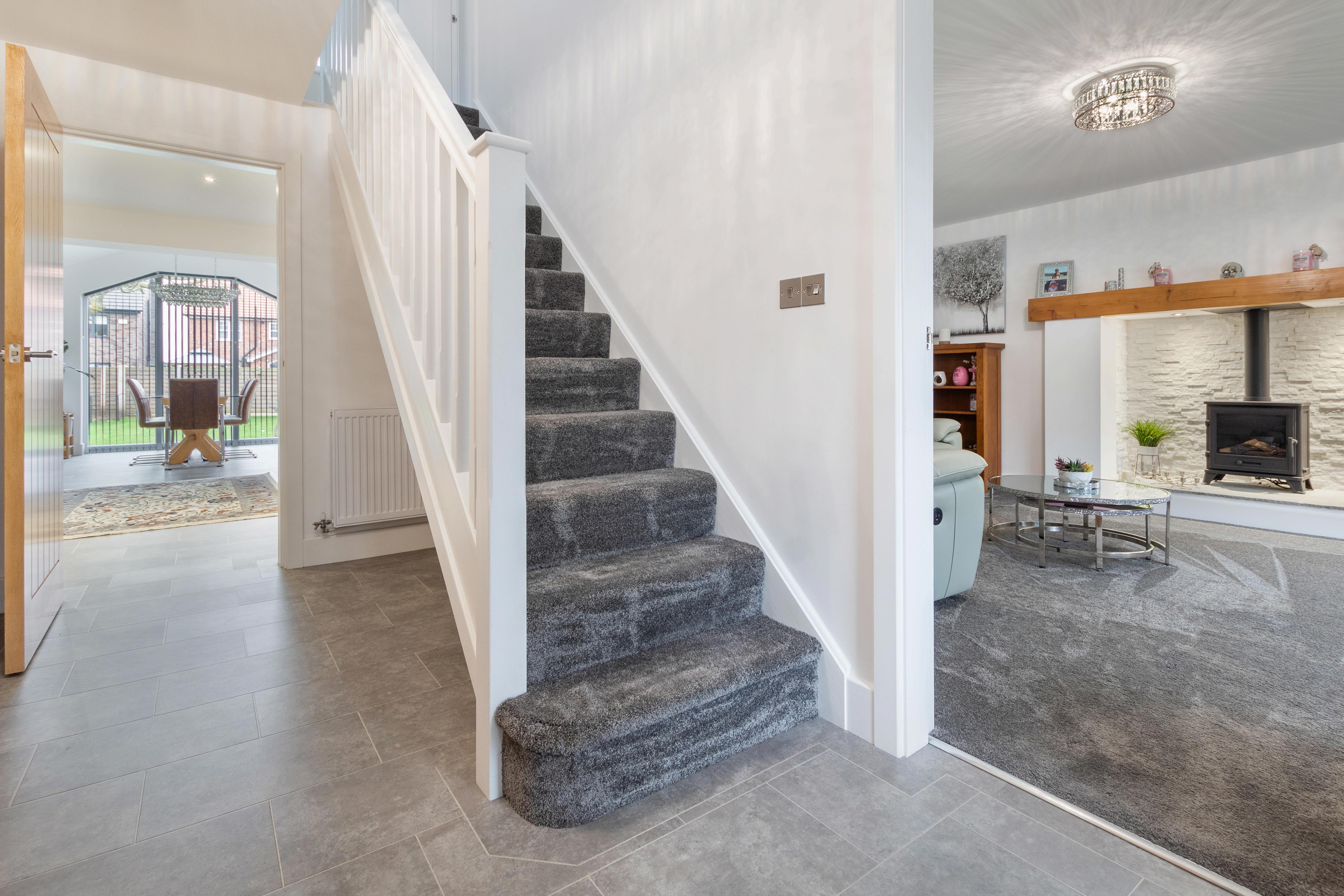 The first-floor layout has been designed with luxury and practicality in mind. The master suite is a true retreat, offering a spacious bedroom, a dedicated dressing area with built-in wardrobes, and a modern ensuite bathroom with extra tiling. There are three additional double bedrooms, each generously proportioned and finished to a high standard. A family bathroom with a separate bath and shower completes this level, providing ample space for a busy household.