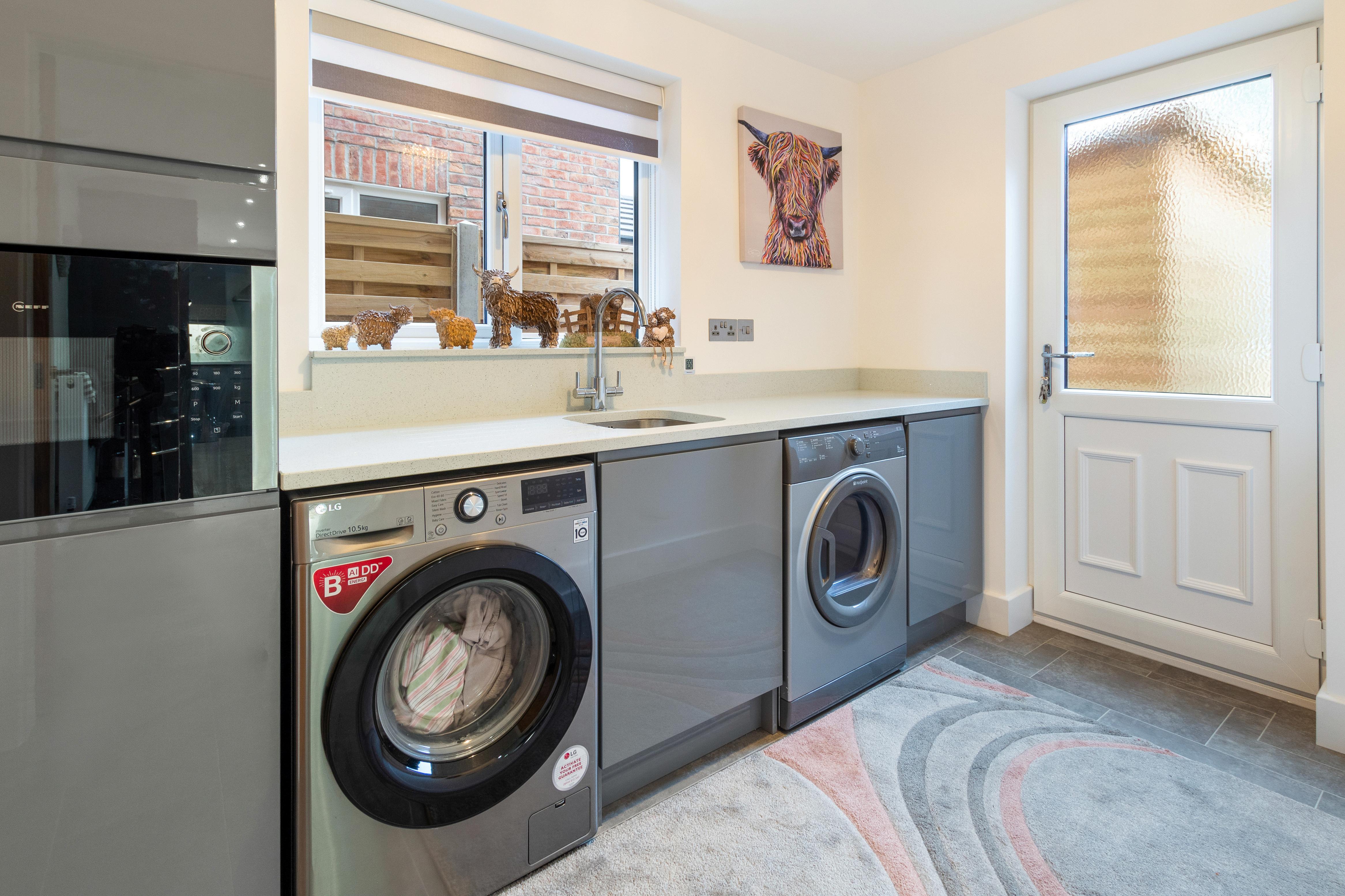The kitchen worktops have been upgraded for enhanced elegance, and the utility room worktops match seamlessly The kitchen flows seamlessly into the dining area and sunroom, which boasts floor-to-ceiling windows overlooking the private rear garden, flooding the space with natural light. Just off the kitchen is a well-equipped utility room with convenient access to a ground-floor W/C, featuring comfort height toilets.