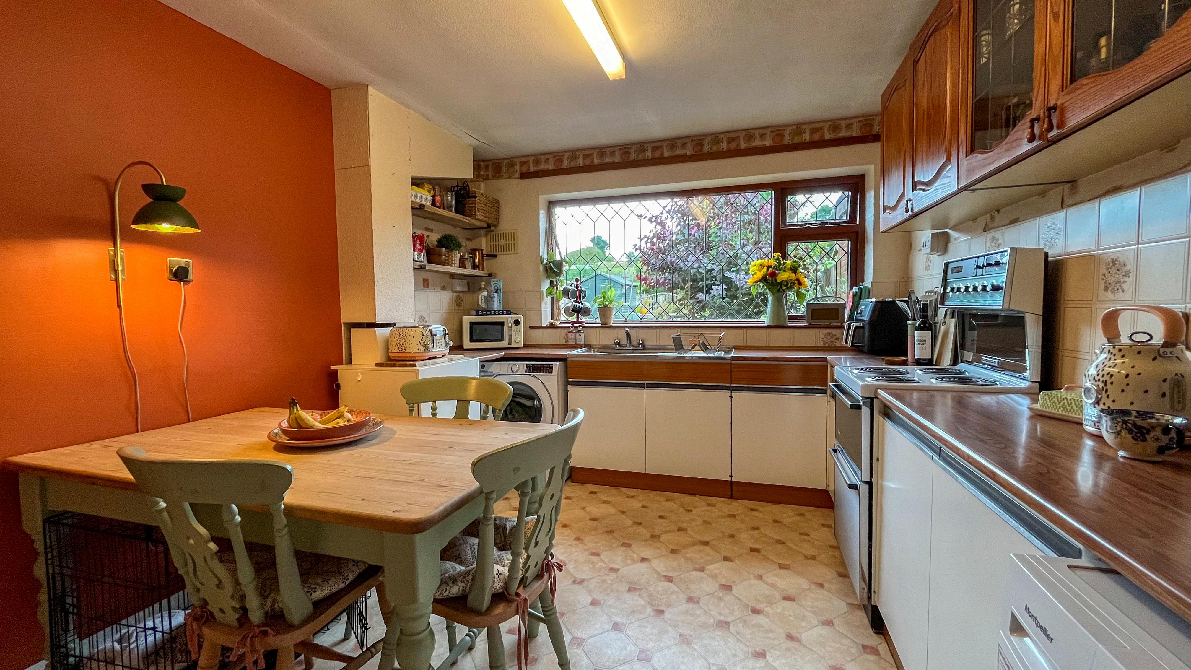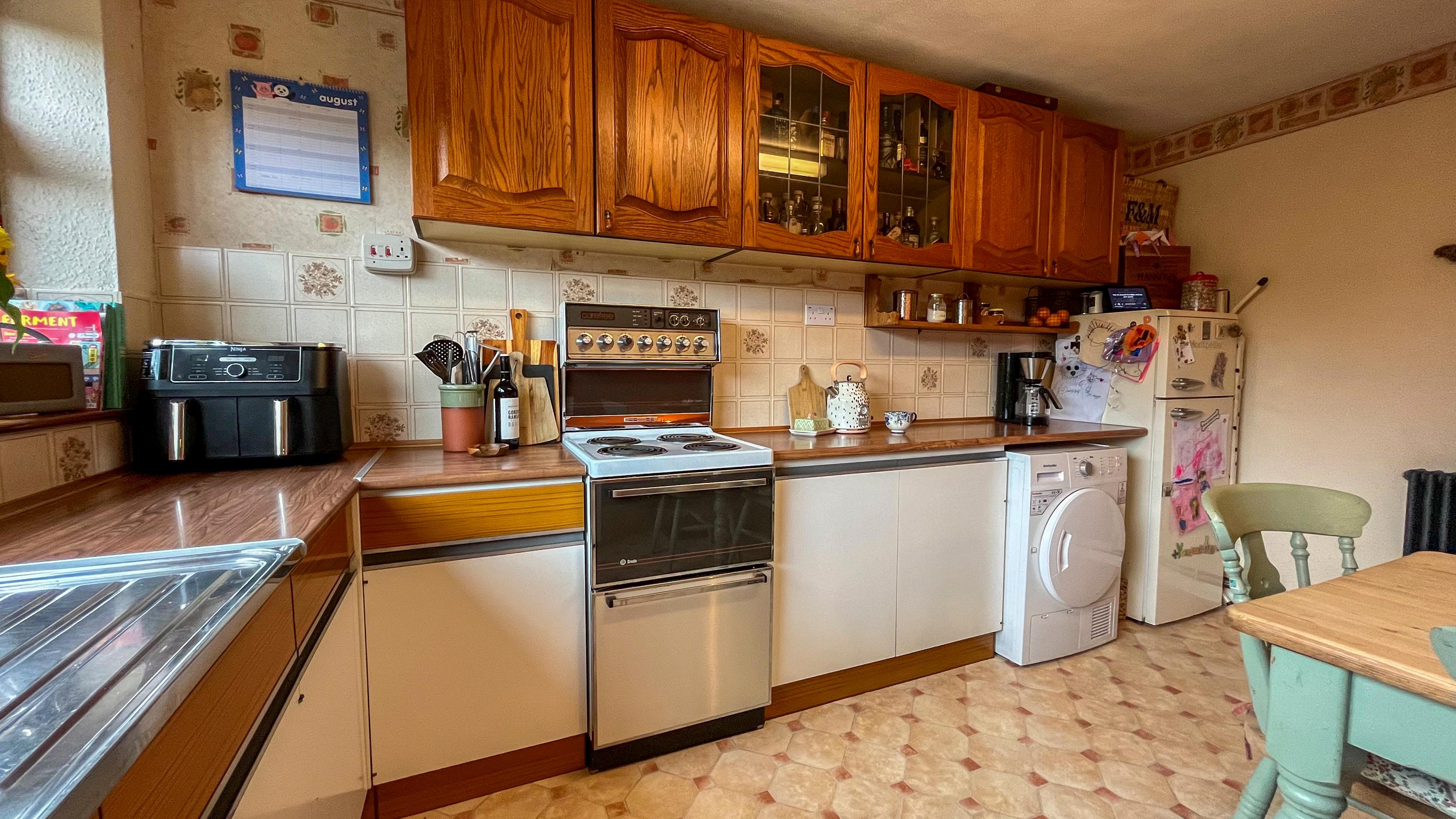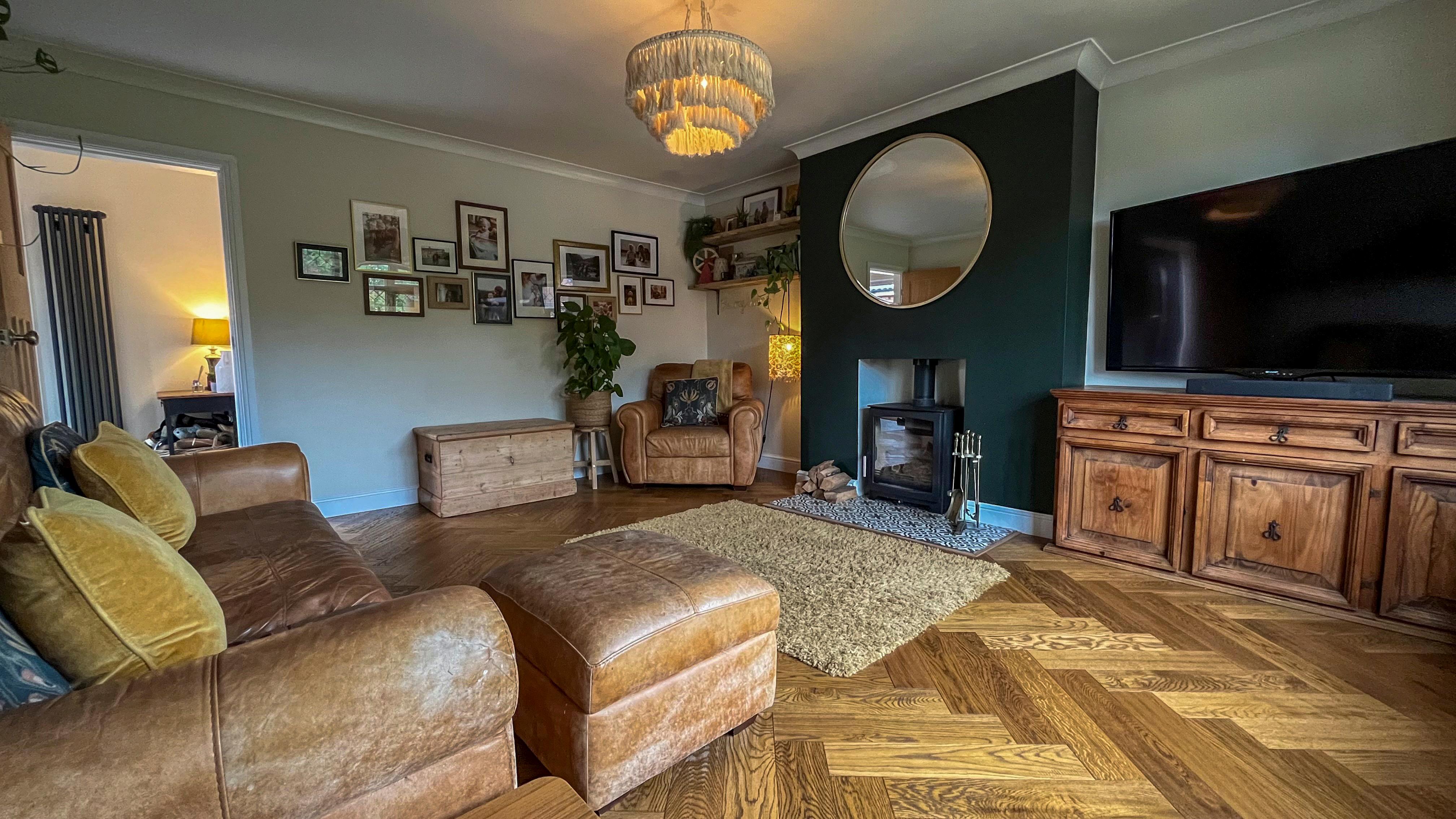 As you step inside, the welcoming entrance hallway greets you with a warm atmosphere, leading to a front-facing lounge that exudes character. The lounge features elegant herringbone wood flooring, a cozy multi-fuel stove fire, a stylish column radiator, and a charming bow window, creating a perfect space for relaxation. Beyond the lounge, the rear lobby offers practicality with tiled flooring and an under-stairs storage cupboard. The generously sized kitchen/diner awaits your personal touch, offering the perfect canvas for your dream kitchen, with beautiful views of the rear garden. The ground floor is completed by a family bathroom equipped with a bath, electric shower, wash hand basin, and w.c.