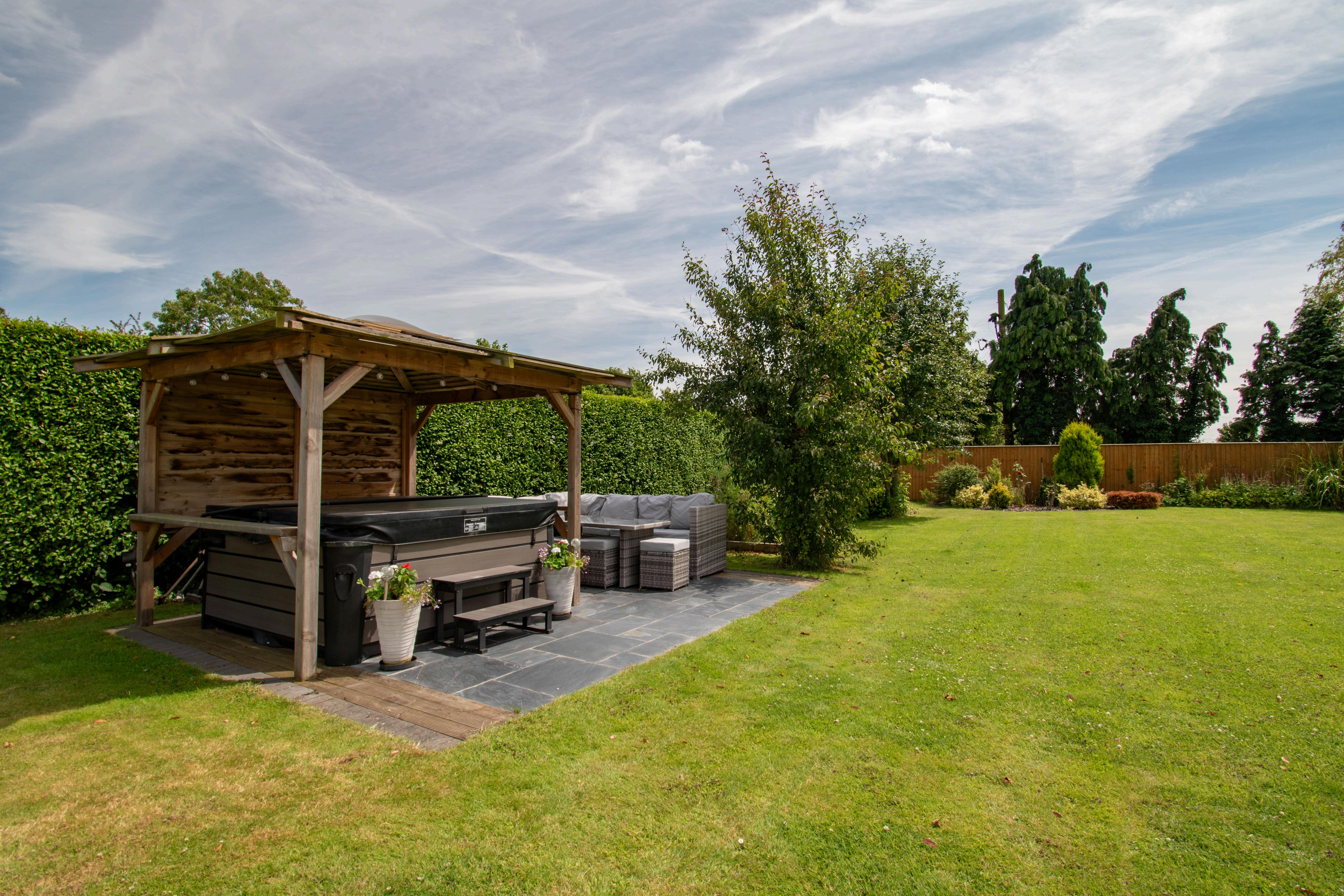 A tall privacy hedge surrounds the property, featuring a pedestrian gate that opens to a path leading to the canopied entrance door, flanked by lawned garden. A hedge divider reveals a gravel driveway providing parking for at least two vehicles. The property itself is enveloped by manicured lawns, the whole plot measures circa 0.31 of an acre, within the stunning gardens is a covered hot tub area with a large slate patio and a substantial timber summer house with power and light. A generous patio is accessible from both the garden room and the kitchen and is perfect for outdoor dining offering a lovely view of the garden