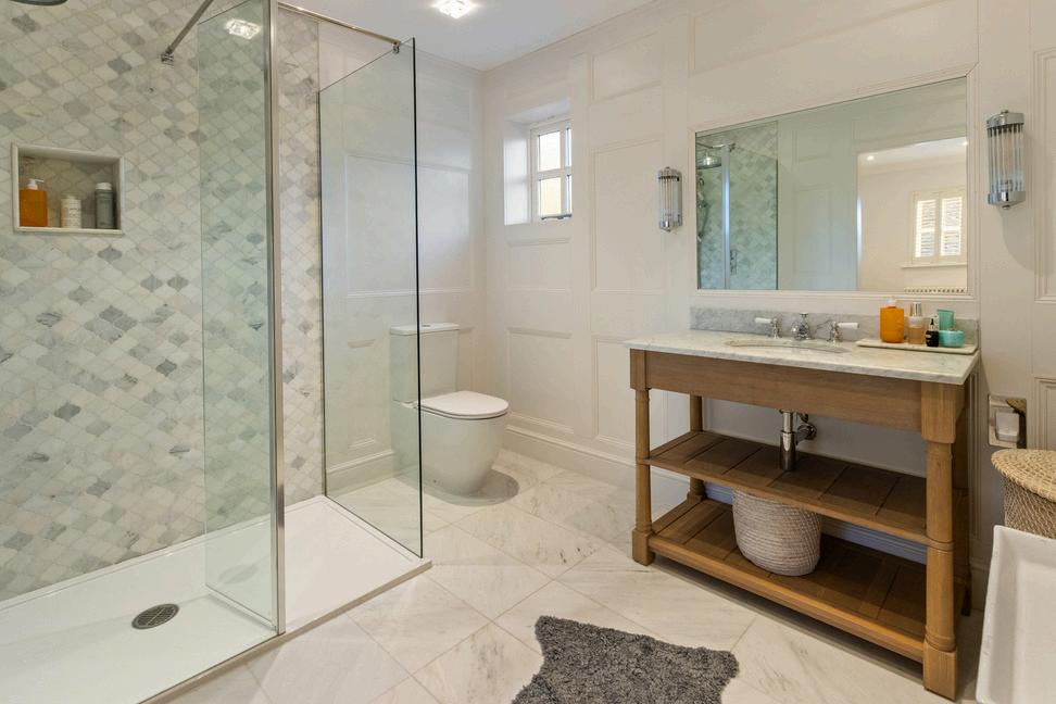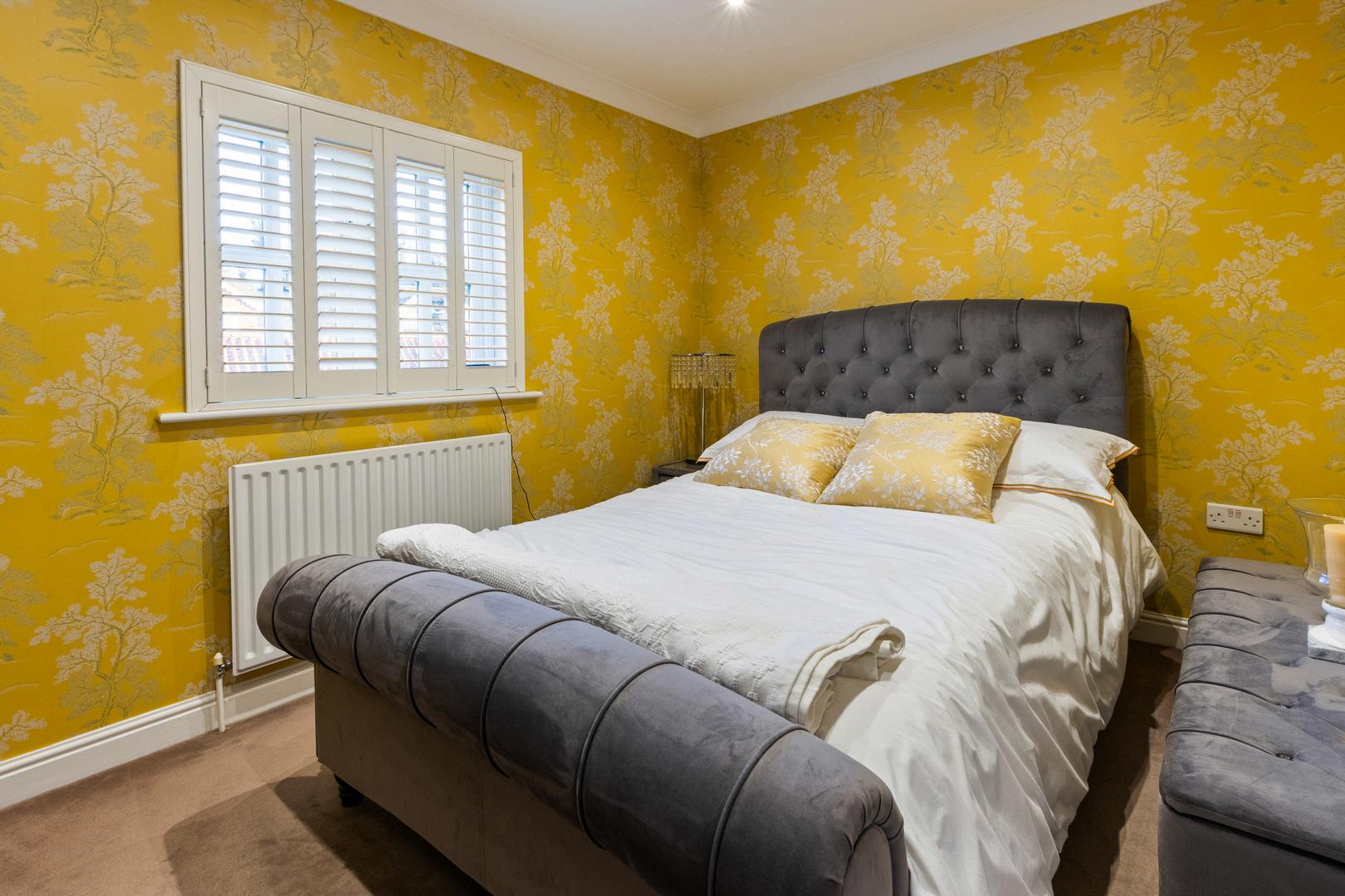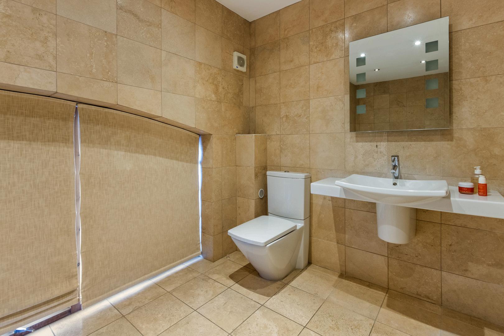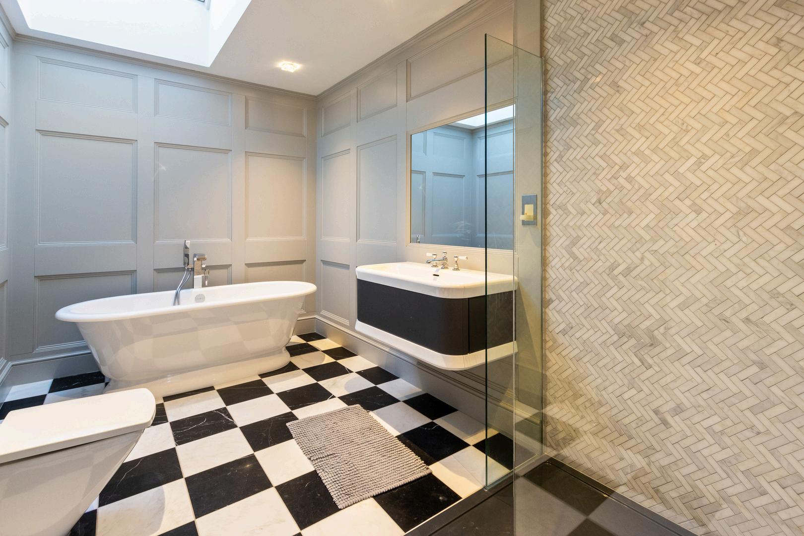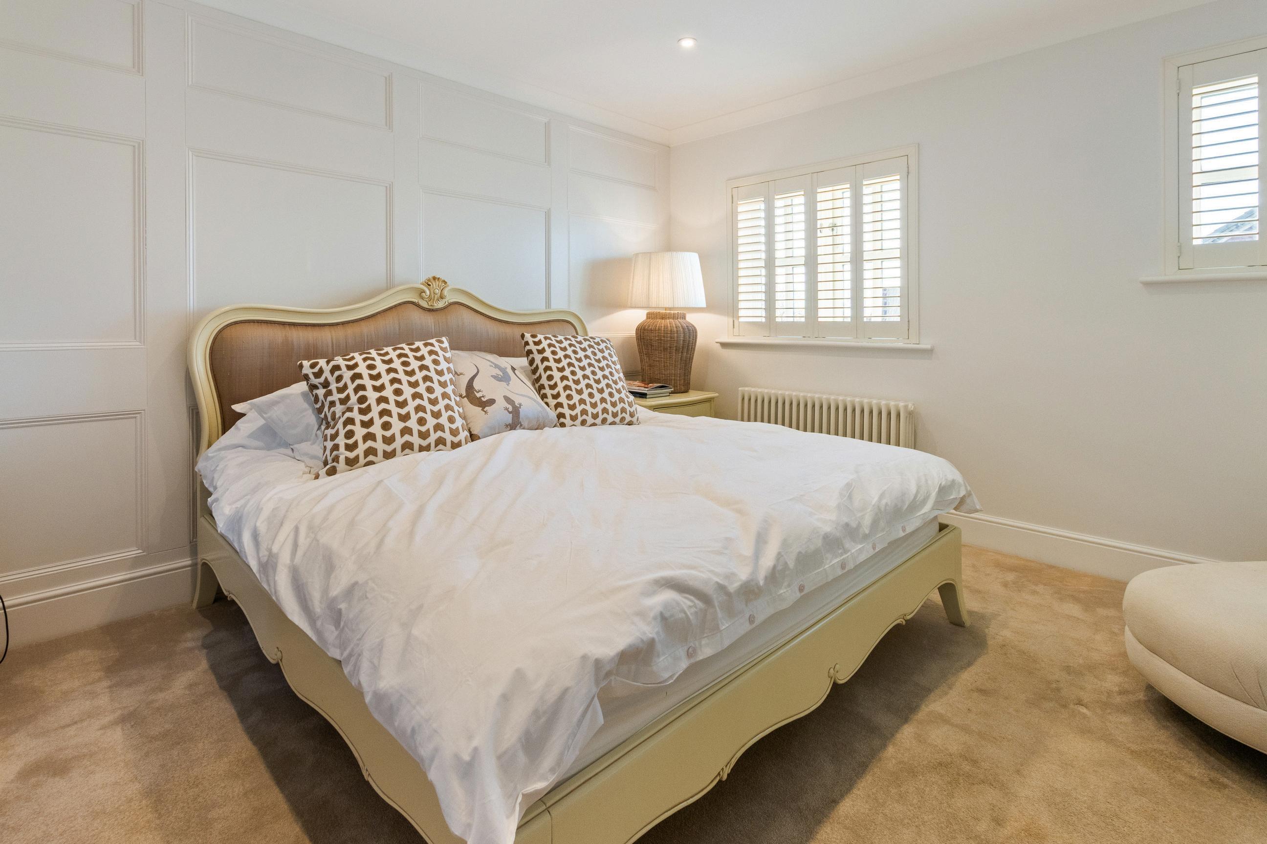 Two further ground-floor double bedrooms include a principal room with built-in wardrobes and an adjoining room currently used as a gym and sauna—ideal as a dressing room, study or nursery. A luxurious family bathroom completes the bungalow, with double-ended bath, walk-in shower, and refined finishes including panelled walls and quartz herringbone-style tiling.