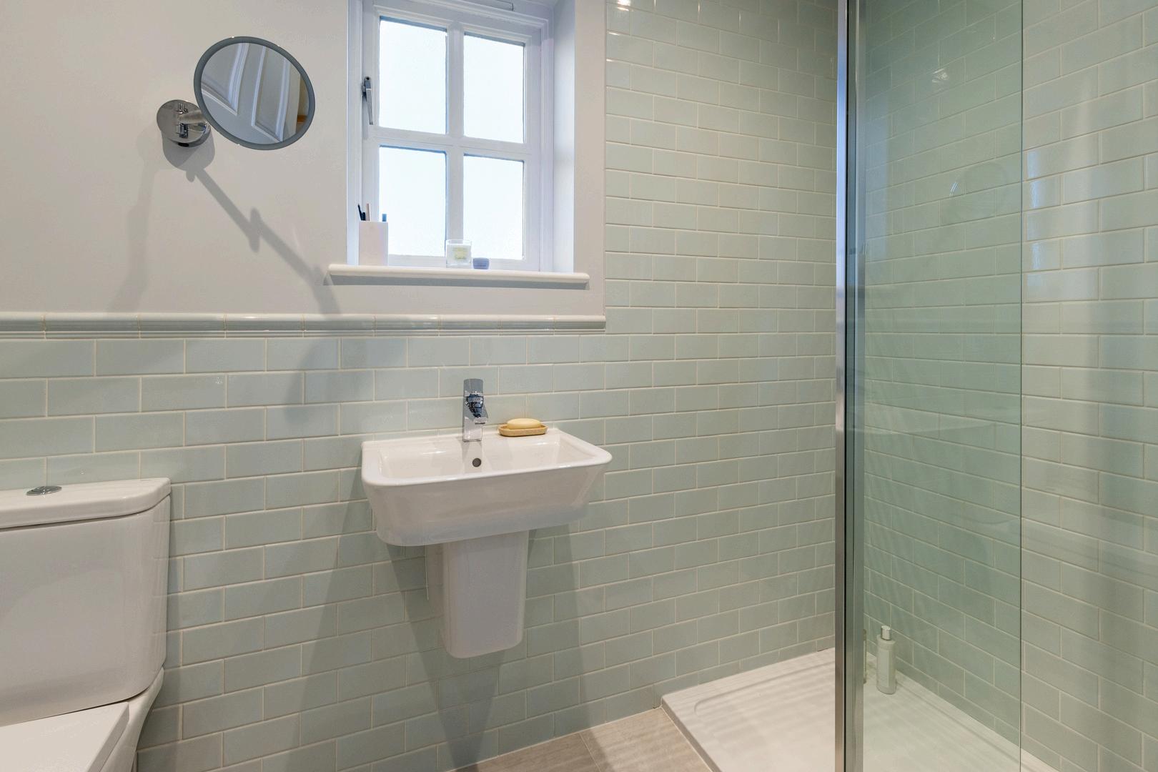 Adjoining The Barn, the bungalow is a modern three-bedroom home designed in the style of a single-storey barn, with a private first-floor suite. It opens into a bright, tiled central hallway with full-height twin windows flanking the front door, dividing the home into living and bedroom wings.