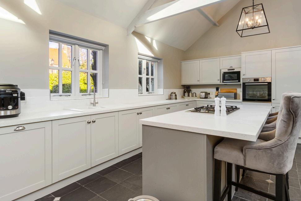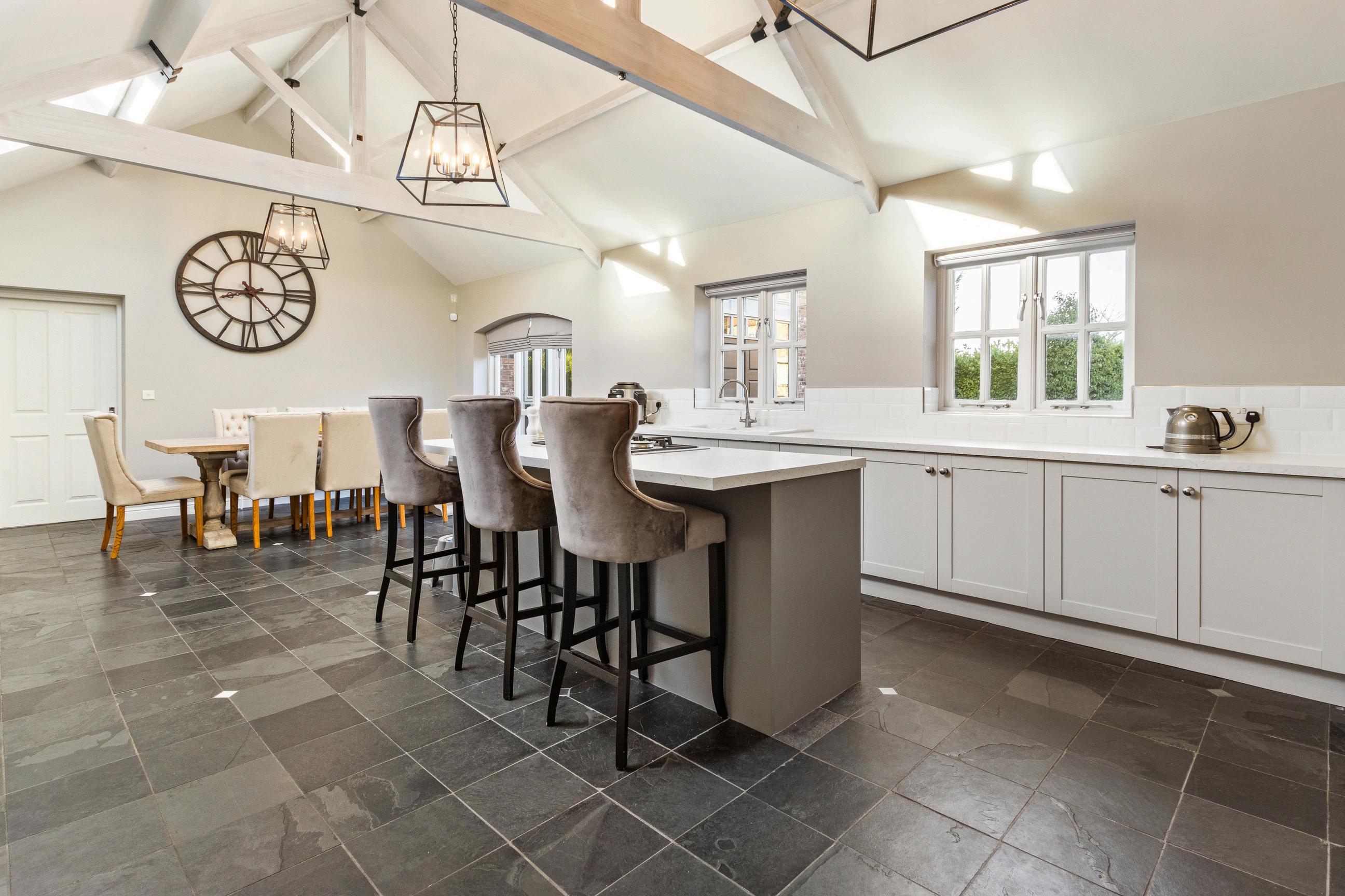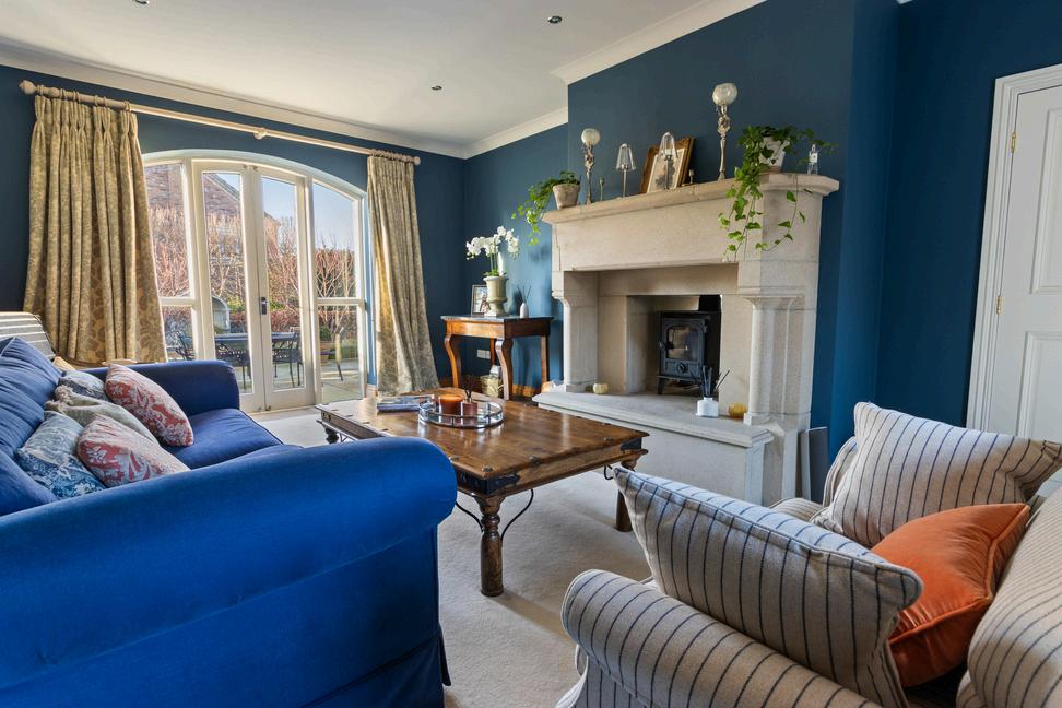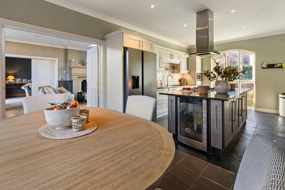 Purpose-built in the style of a barn conversion, The Barn makes an immediate statement with a double-height entrance, grand staircase, and arched feature window. The entrance hall doubles as a reception space, centred around a limestone fireplace with a double-fronted cast iron wood burner, offering a superb setting for entertaining or formal dining.