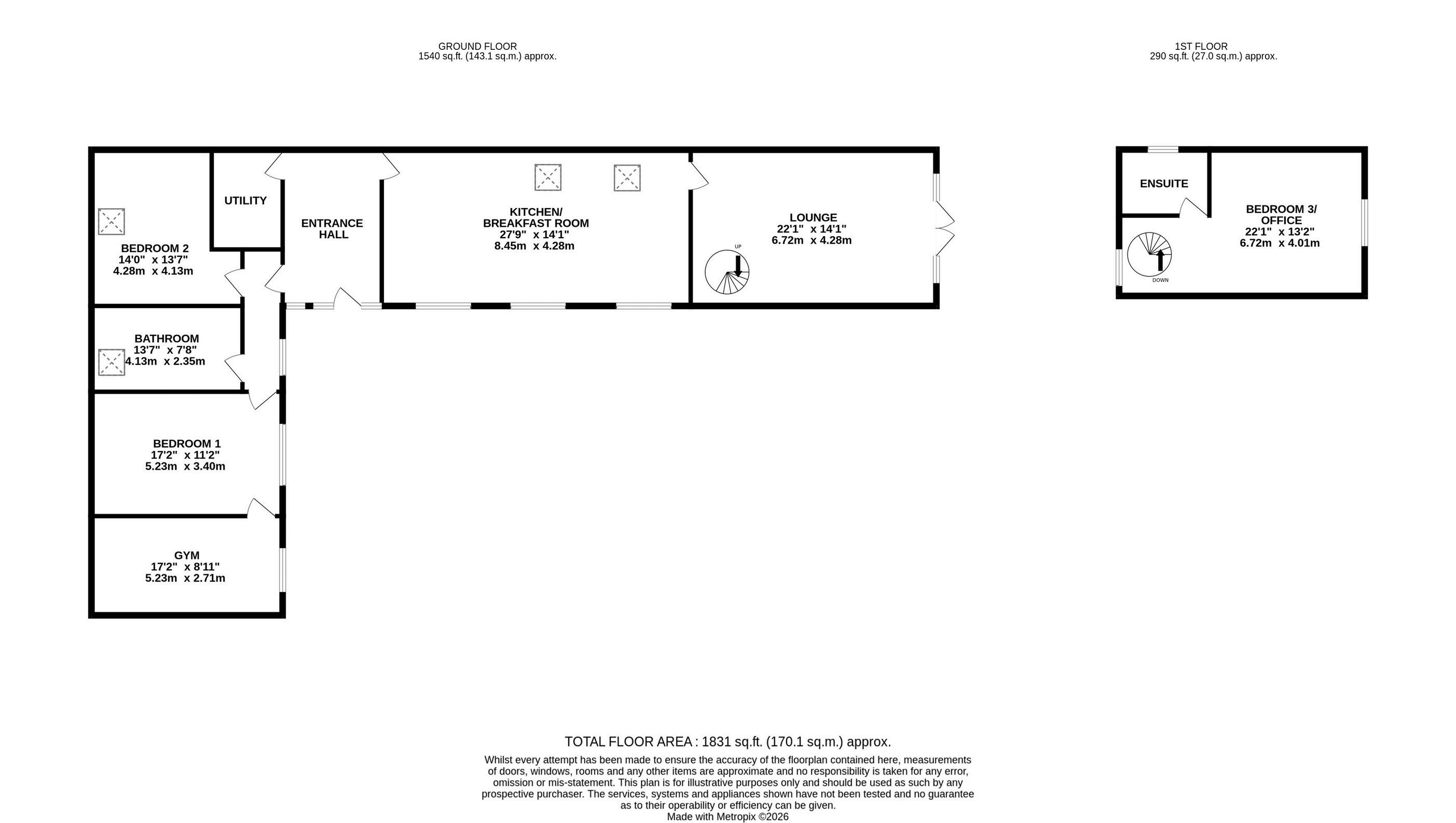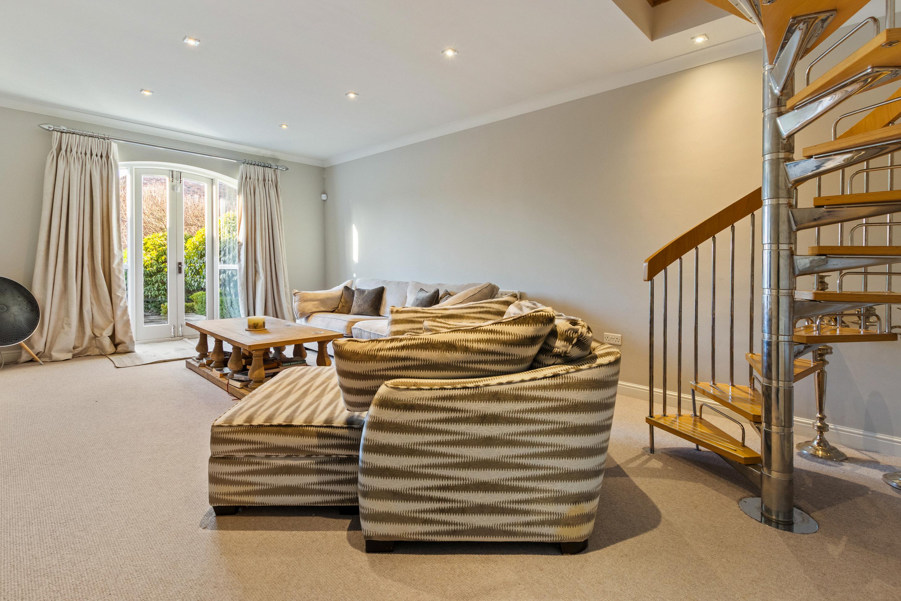 The vaulted open-plan living kitchen is the heart of the home, featuring exposed painted trusses, roof windows, grey shaker-style units, white worktops, integrated appliances, and a sociable island with breakfast bar. A spacious sitting room sits beyond, with French doors to the garden and a spiral staircase to the first-floor suite complete with garden views and a modern en-suite, currently used as a home office.