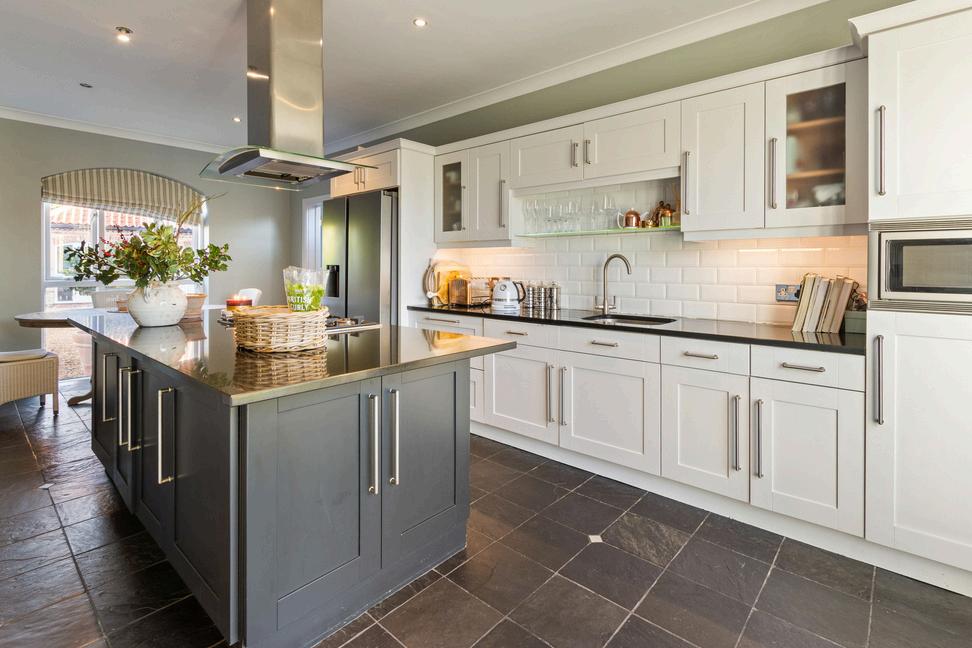 The layout flows into a formal sitting room with French doors to the garden and a breakfast kitchen fitted with painted shaker-style units, quartz worktops, and a central island beneath tall barn-door windows that flood the room with light. Upstairs, a galleried landing leads to four double bedrooms, including a principal suite with luxurious en-suite shower room, a guest suite with en-suite and walk-in wardrobe, plus two further bedrooms served by the family bathroom with spa bath and travertine finishes.