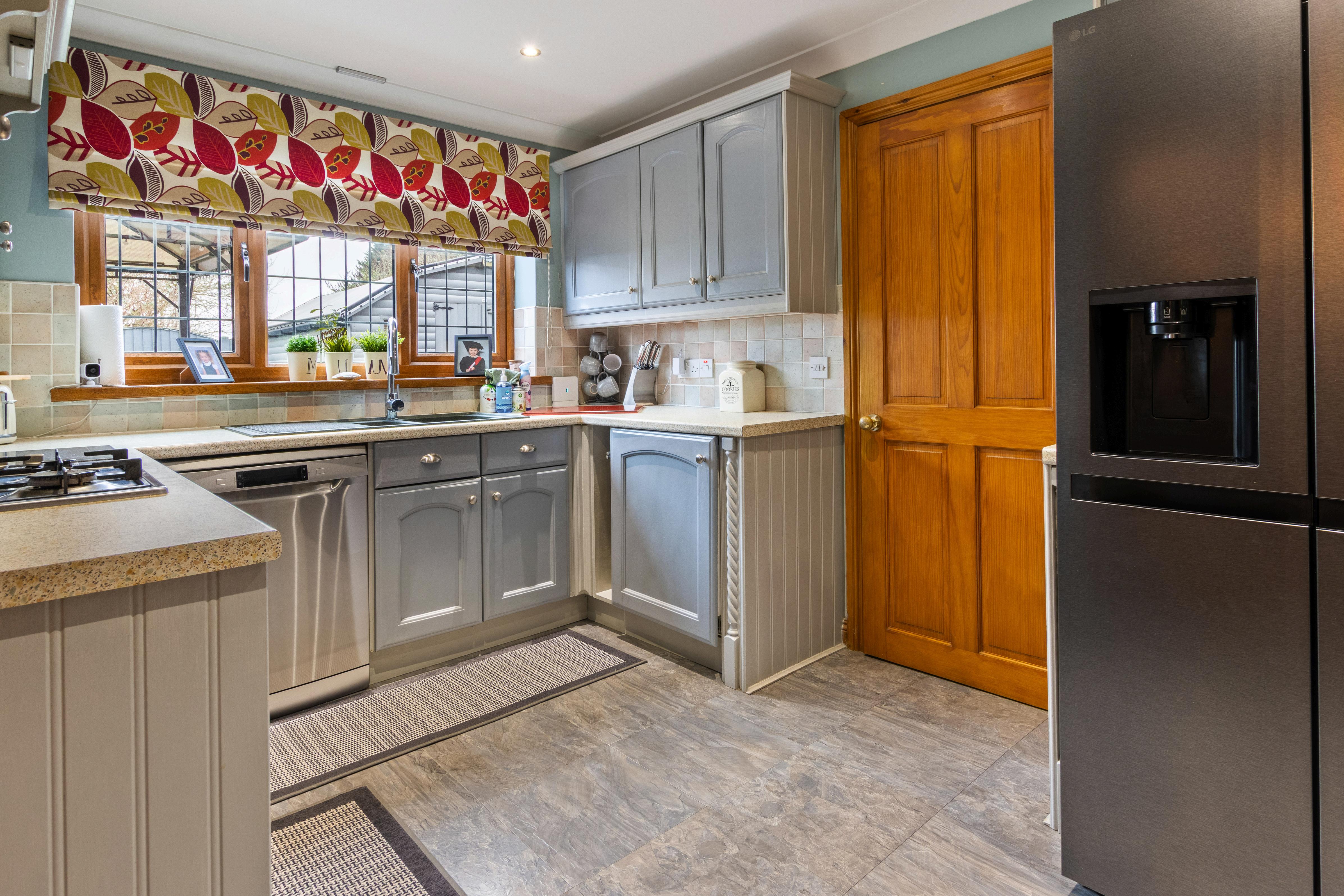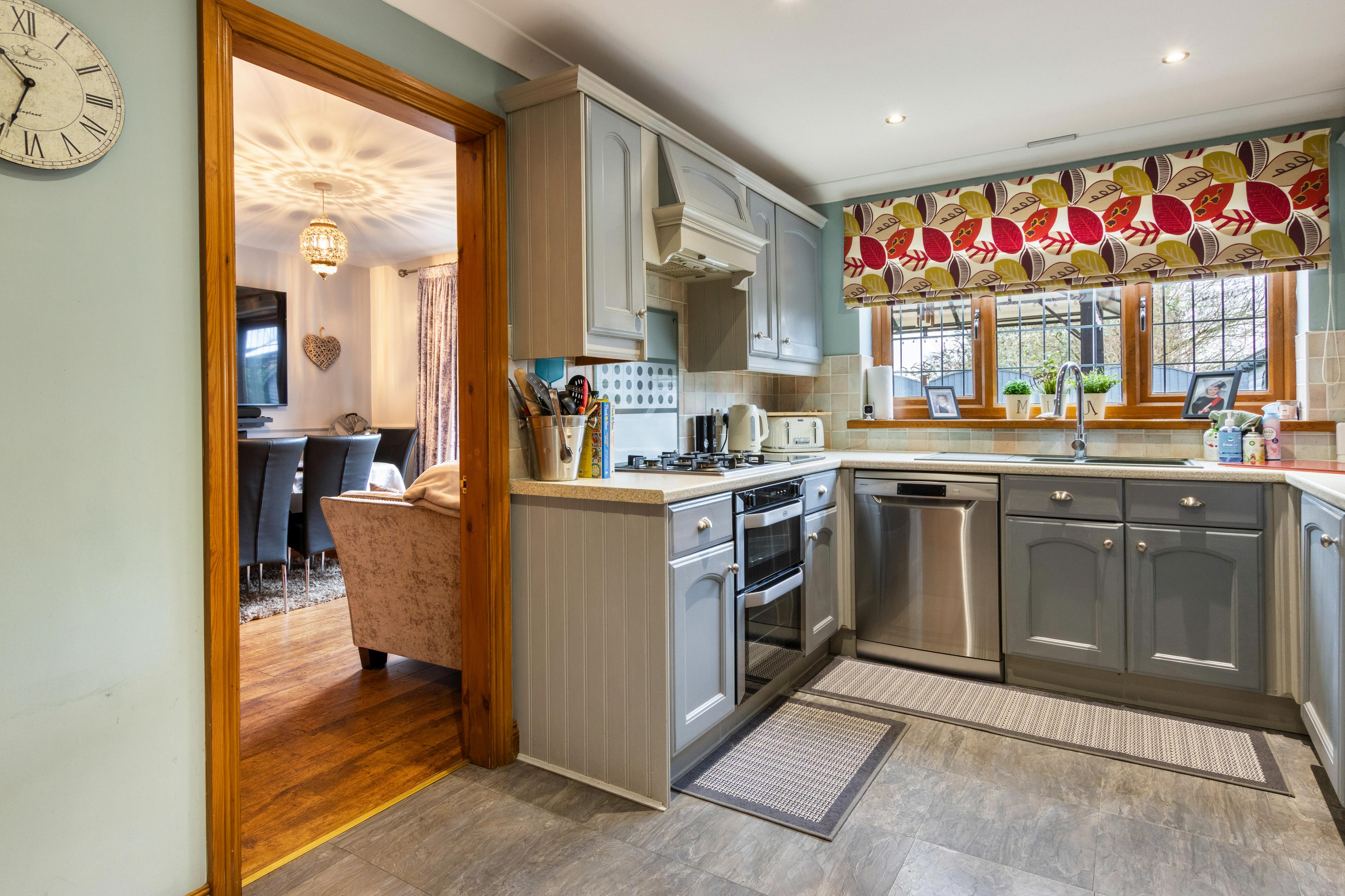 At the heart of the home sits the impressive kitchen/breakfast room, fitted with shaker-style cabinetry, complementary worktops and tiled splashbacks. Practicality is spot on with a gas hob and extractor, double oven, and space for freestanding appliances, while the window over the sink keeps the room bright and sociable. There’s also a comfortable area for everyday dining, making this a true “hub of the home”.