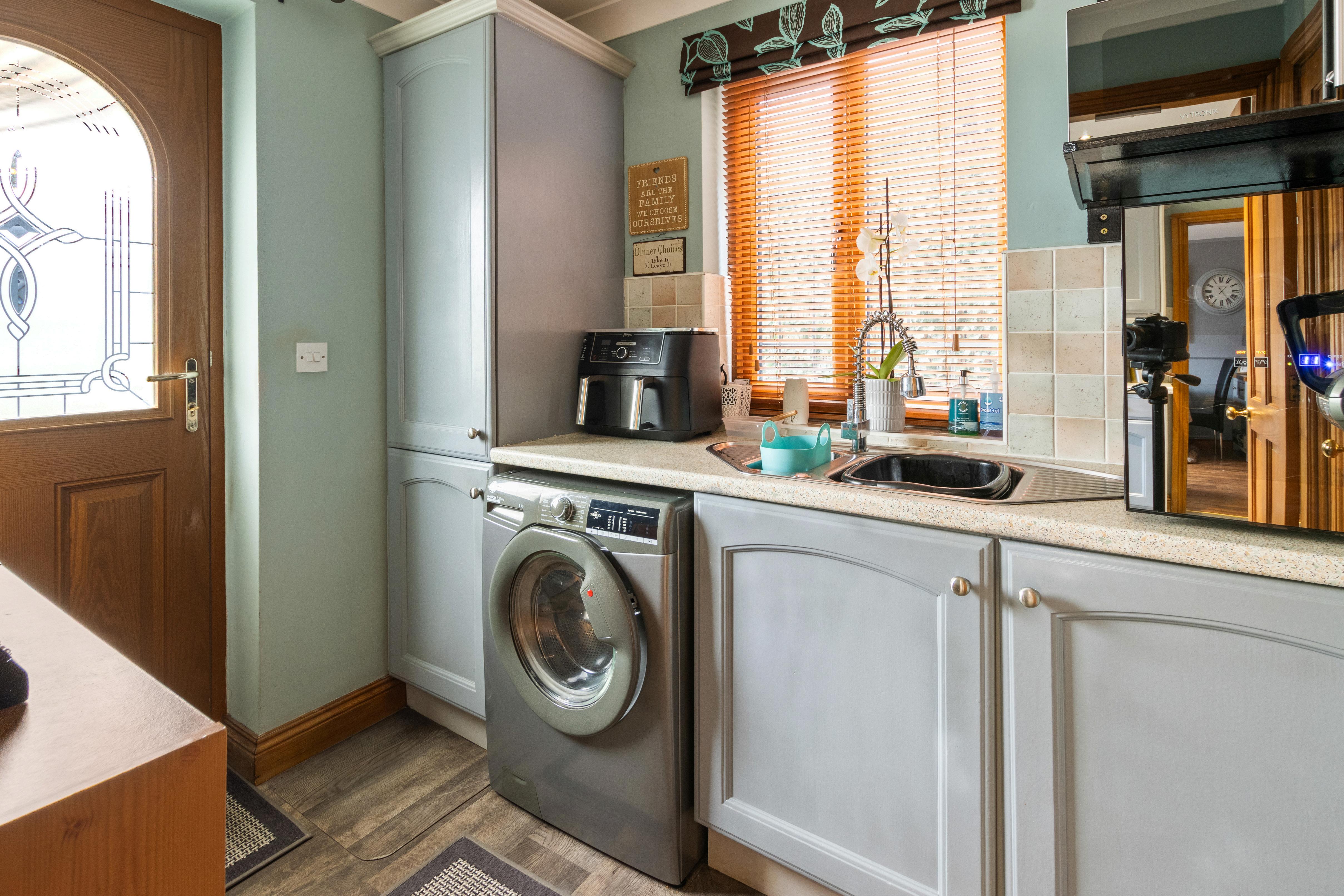 A matching utility room adds another layer of everyday convenience, with additional fitted storage, worktop space, sink, and plumbing for laundry appliances, plus access through to the downstairs WC which is ideal for busy family life.