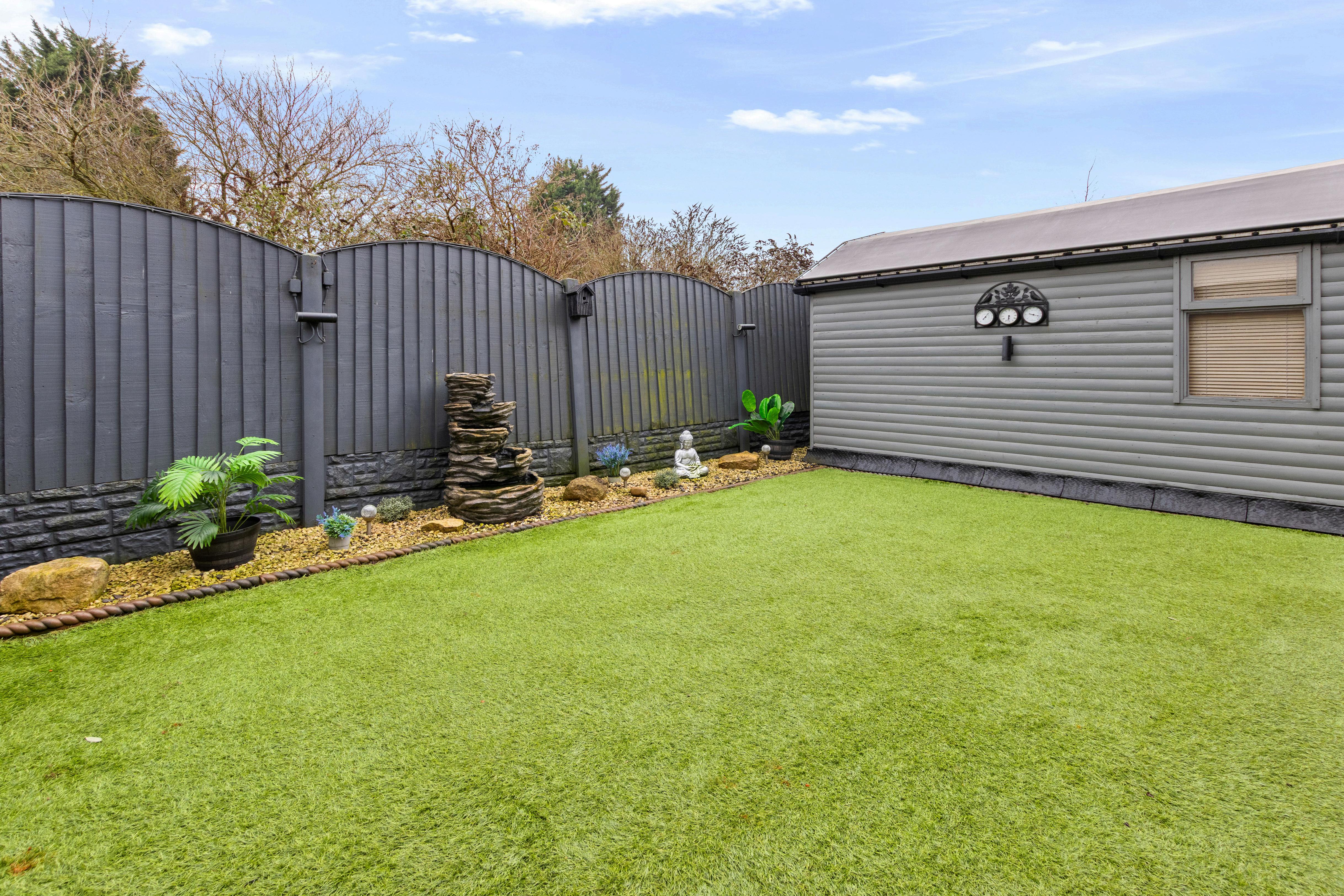 Beyond the patio, the garden continues with a neat, enclosed lawn area finished for easy upkeep, framed by smart fencing and planted borders that enhance the sense of privacy.