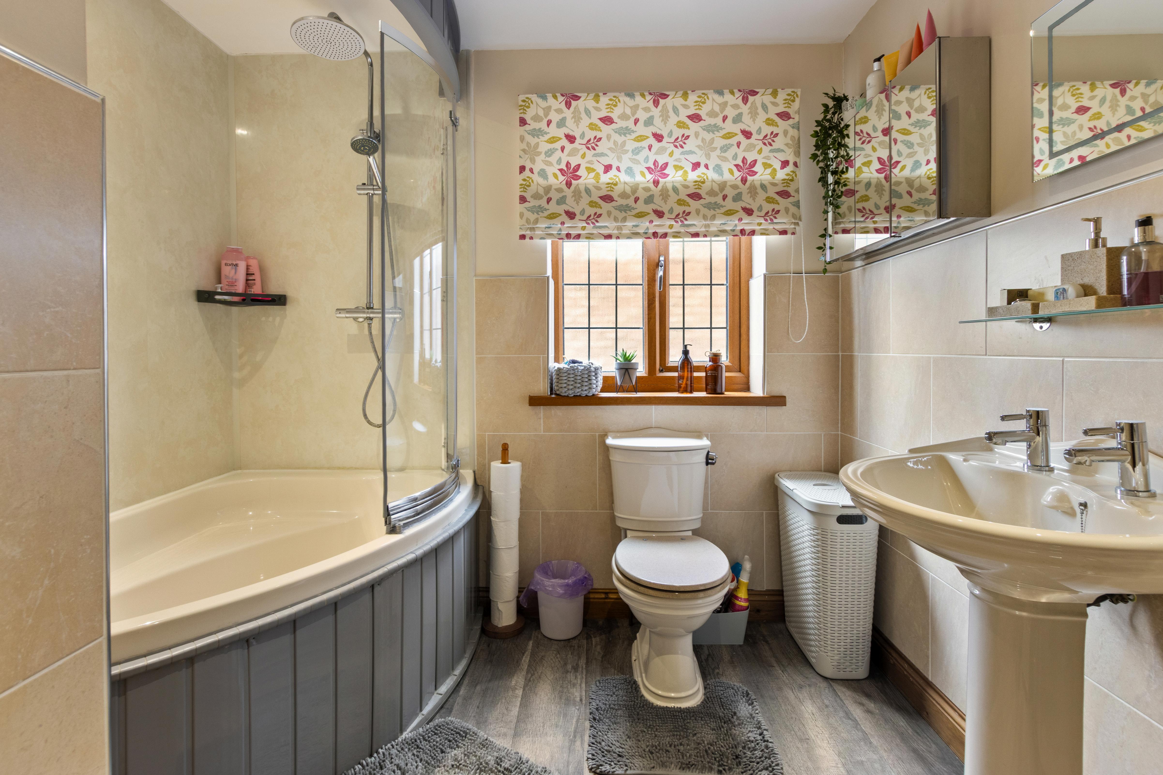 Completing the first floor is a smart family bathroom, featuring a corner bath with shower over and curved glass screen, pedestal basin and WC, finished with tasteful tiling and a window for natural ventilation.